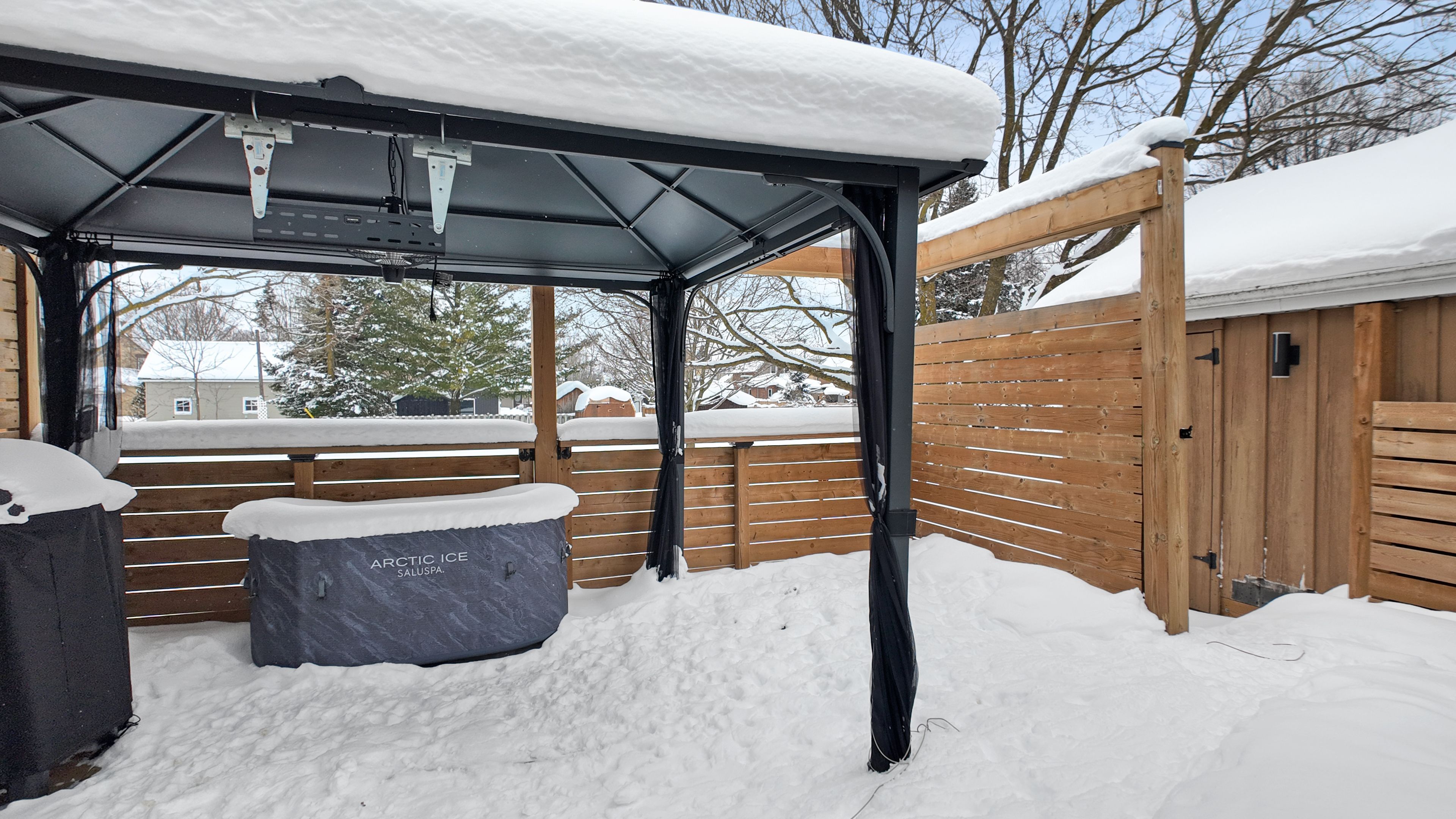 • Covered deck with gazebo for outdoor relaxation.