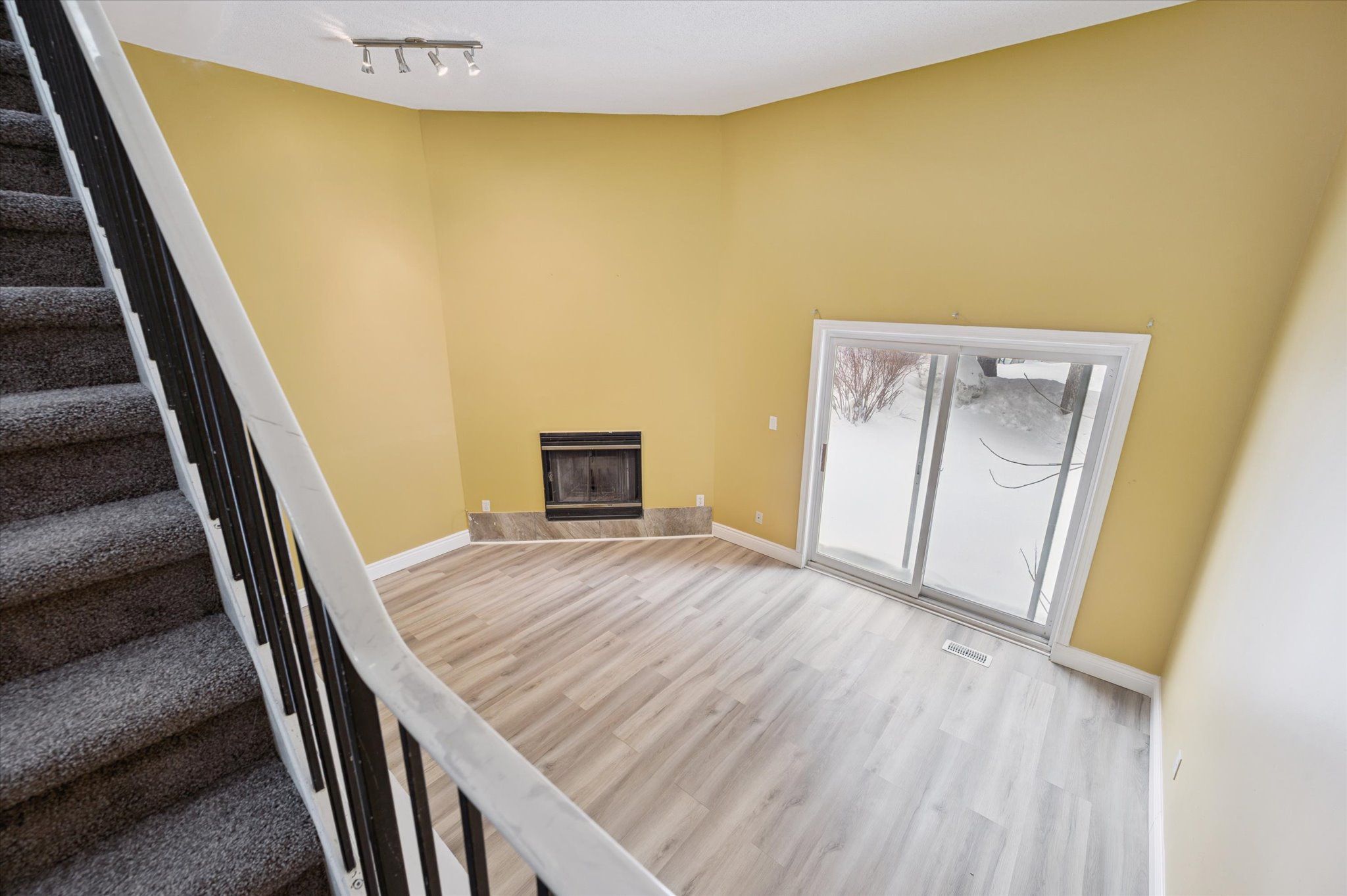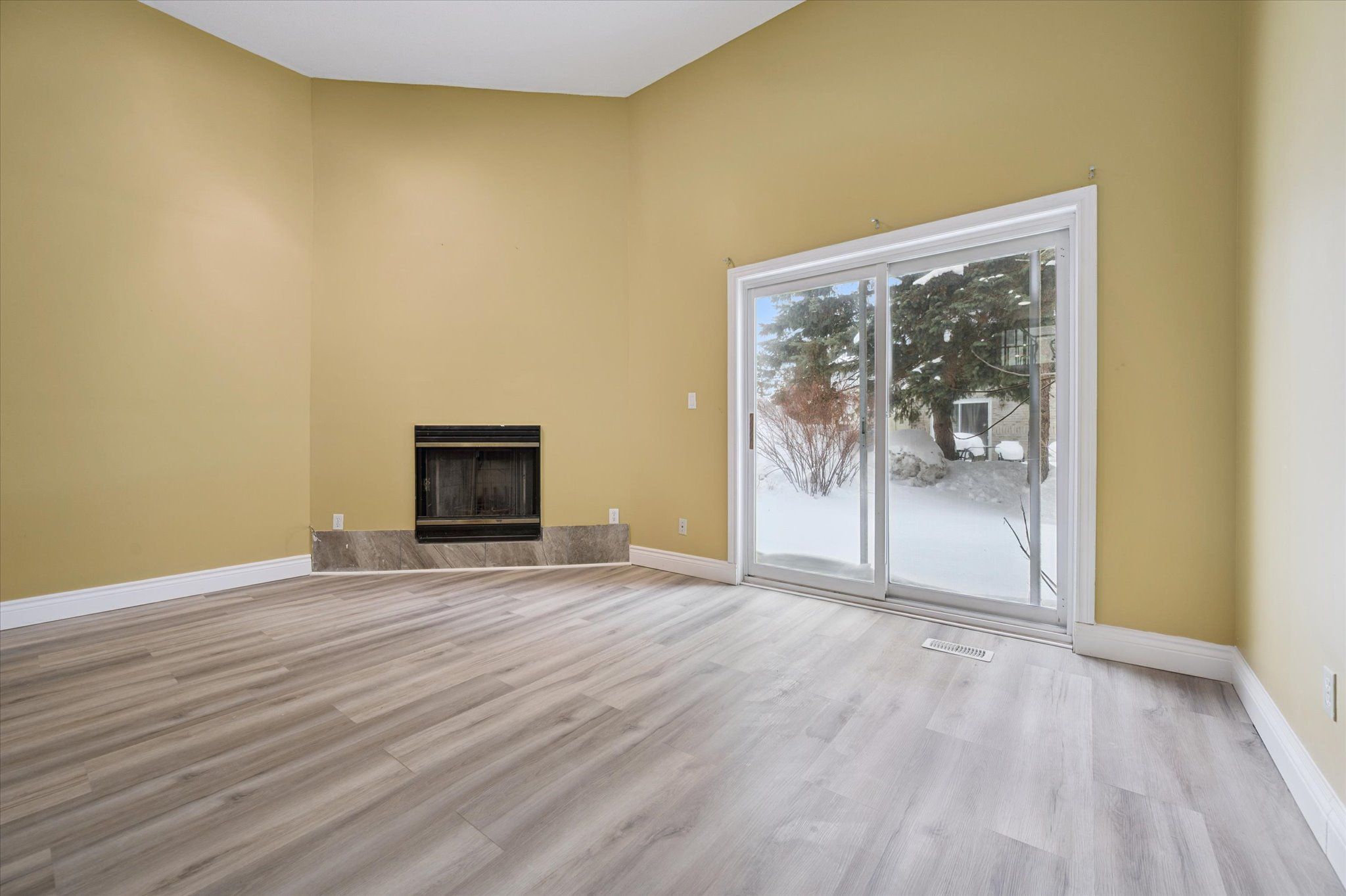 • Bright living room with high ceilings and wood-burning fireplace.