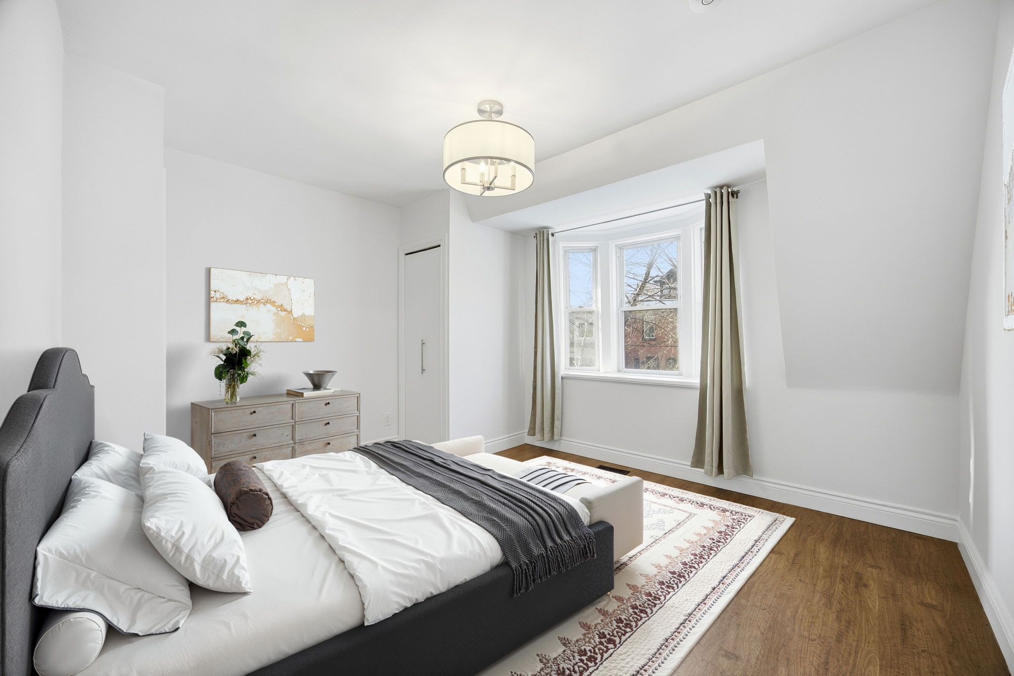 • Spacious primary bedroom with bay window and two closets.
