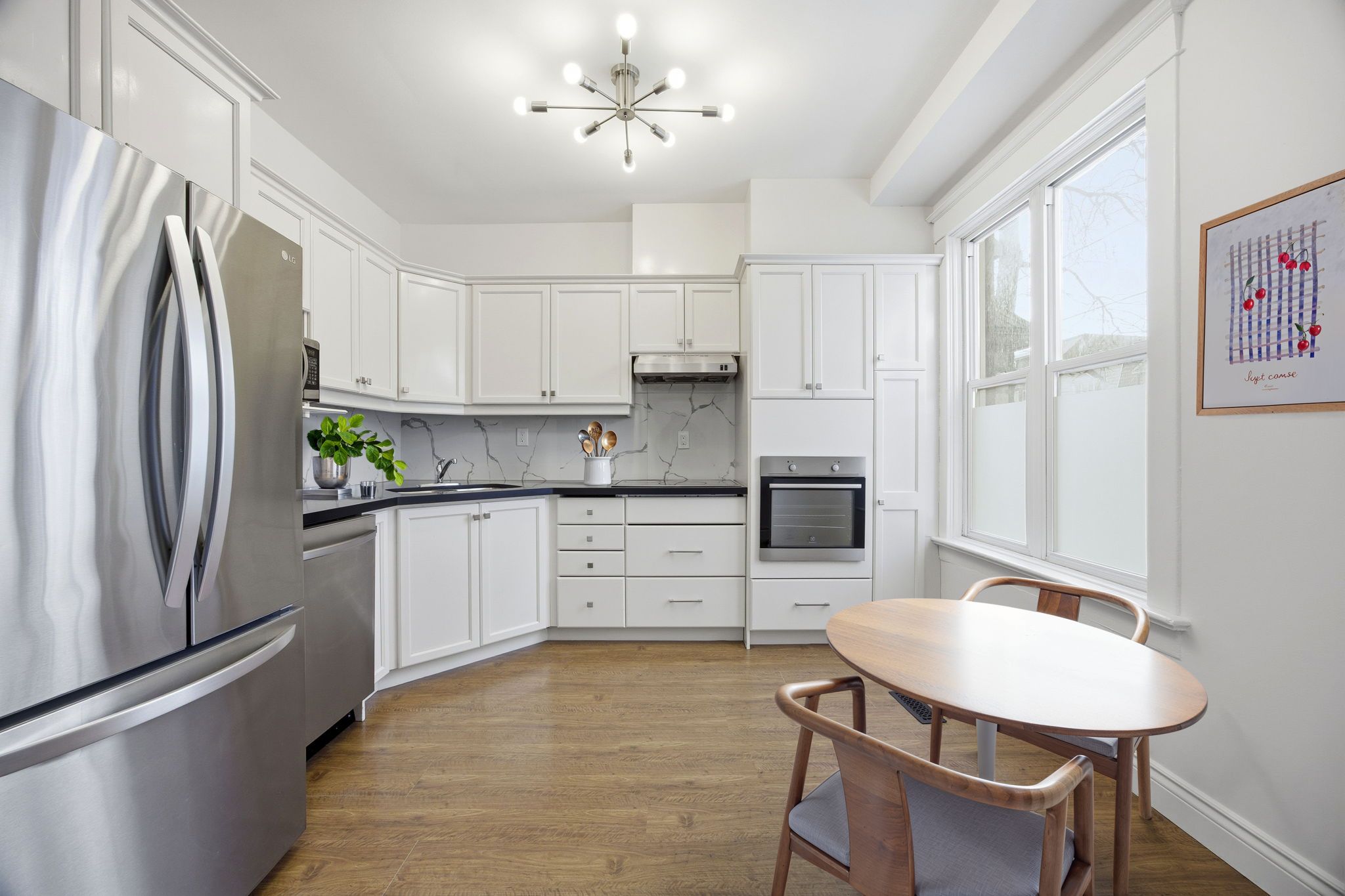 • Updated eat-in kitchen with granite counters and stainless steel appliances.