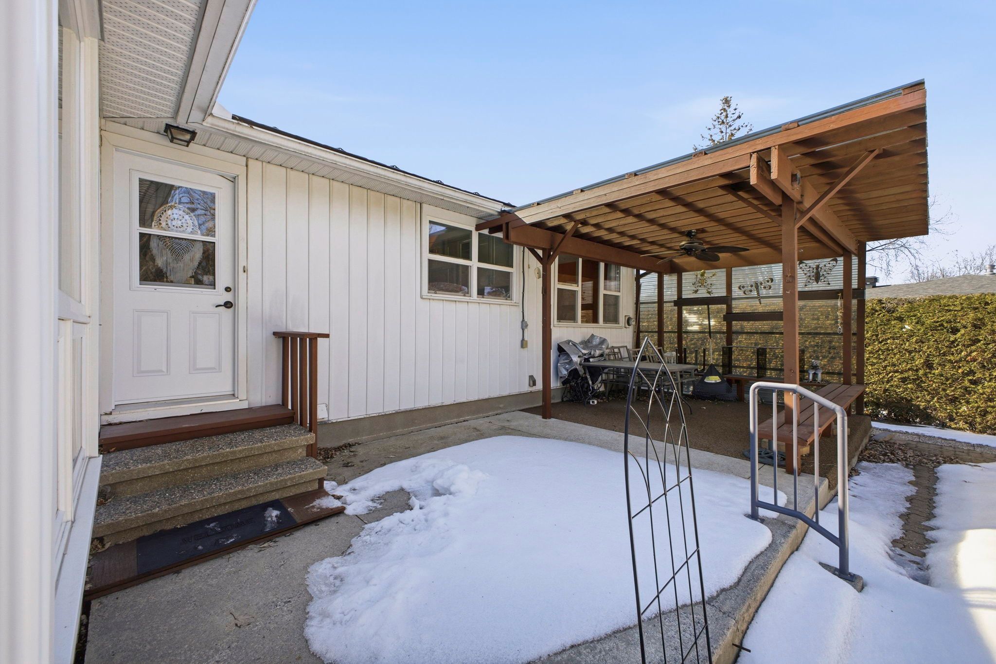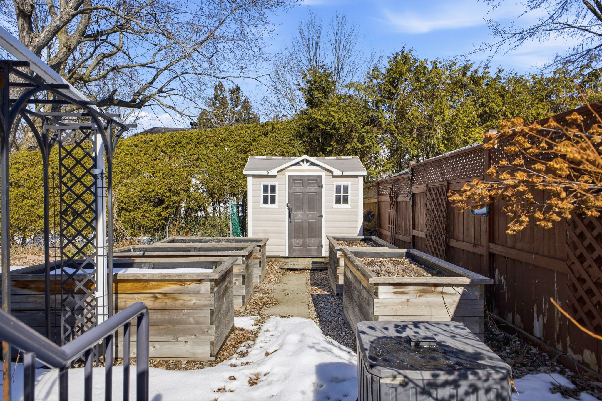 • Private backyard with raised garden beds and covered patio.
