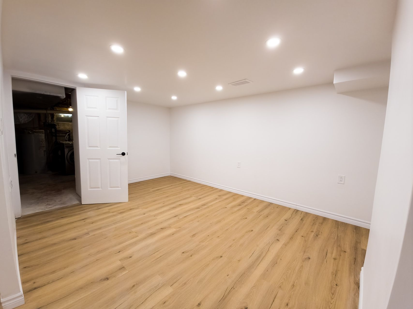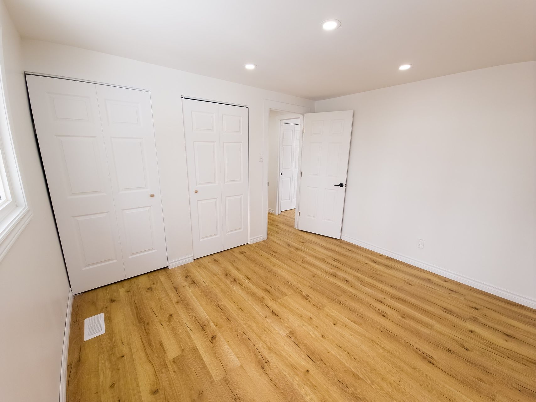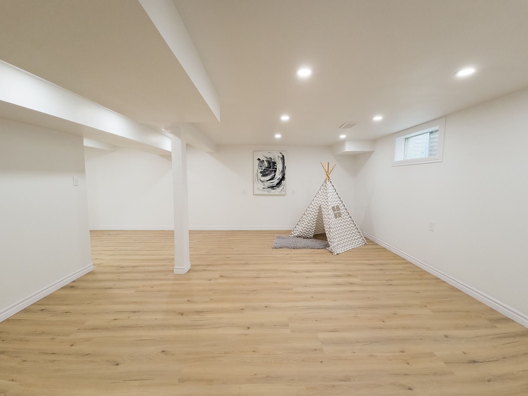 • Bright main living area with natural light and unique feature wall.