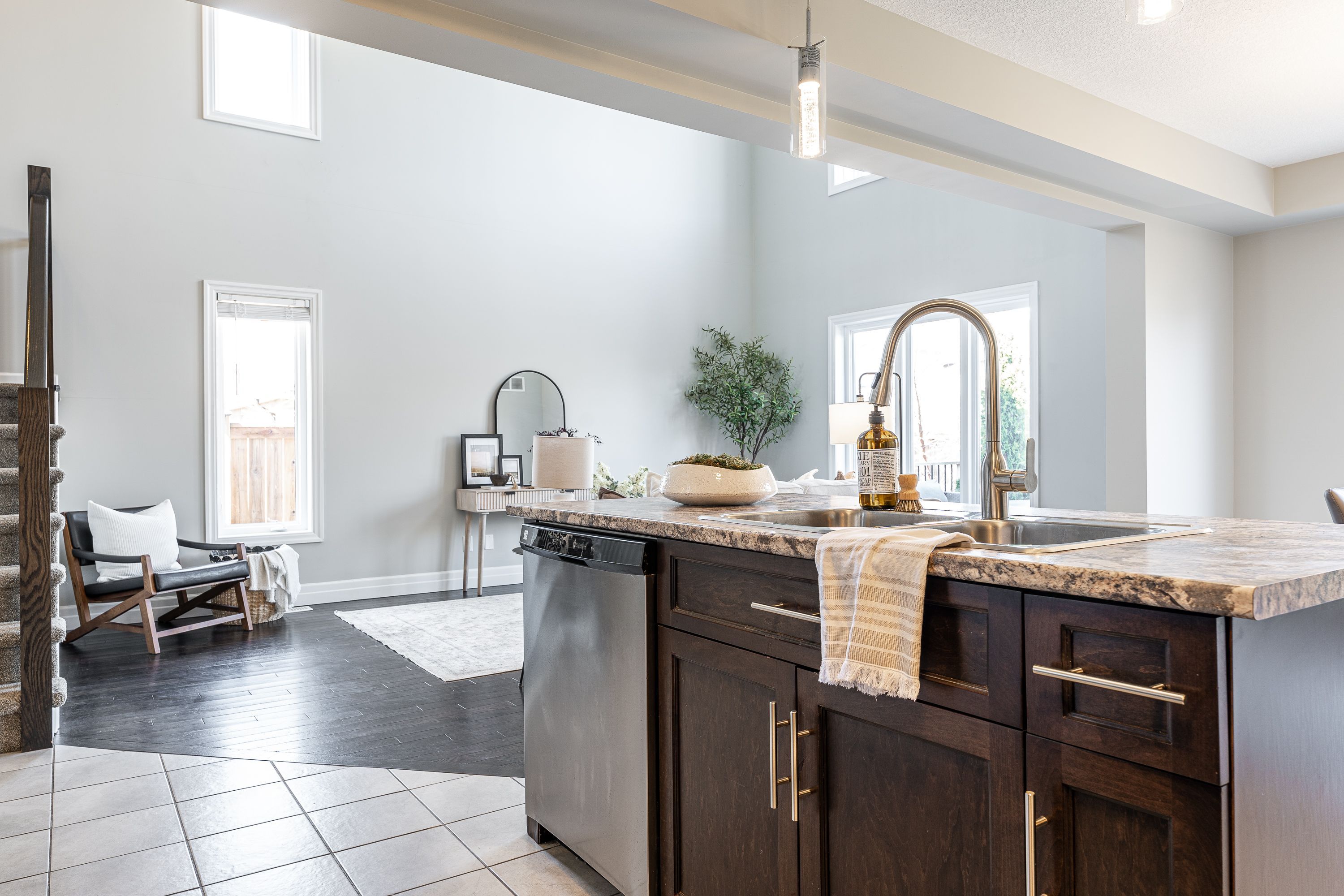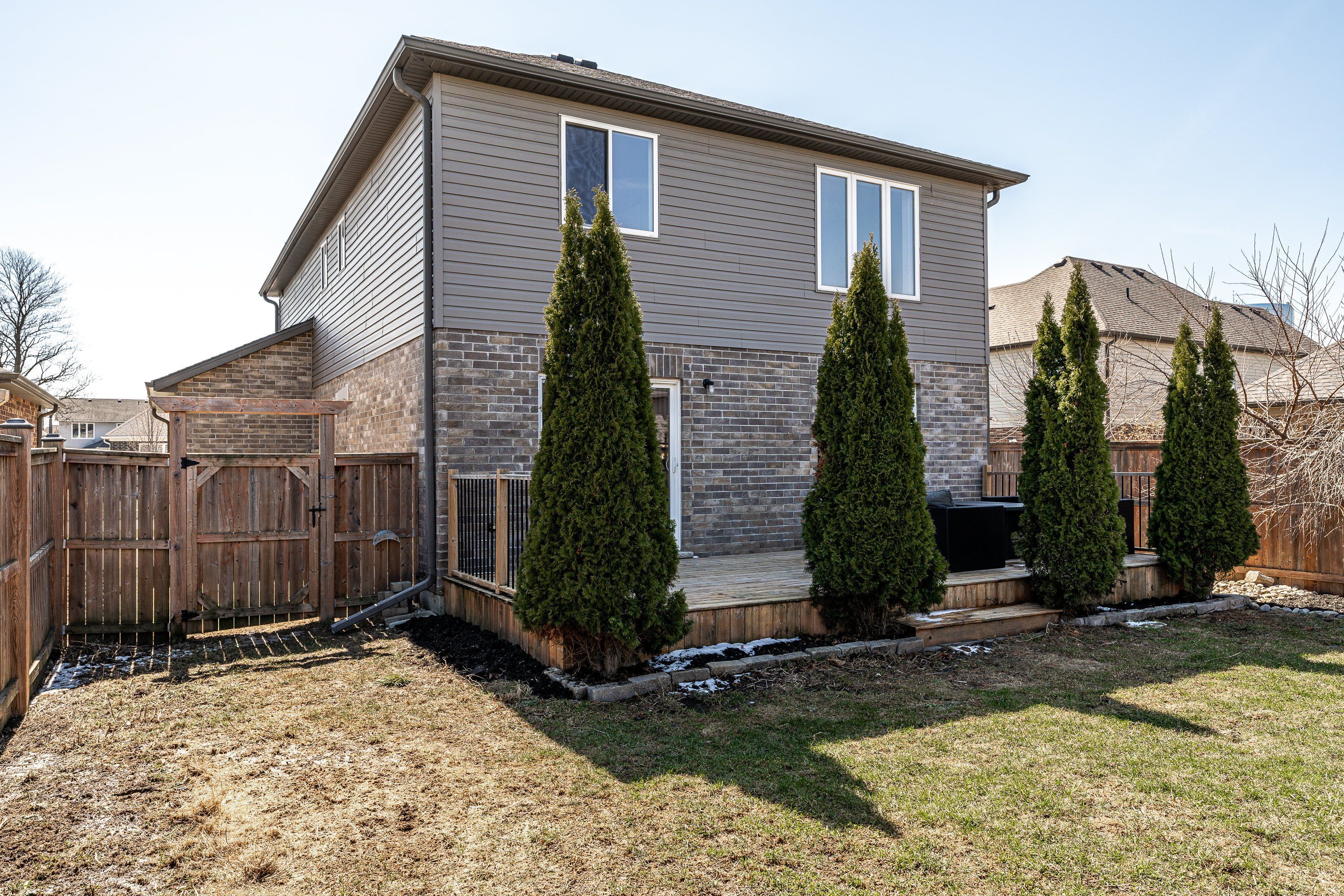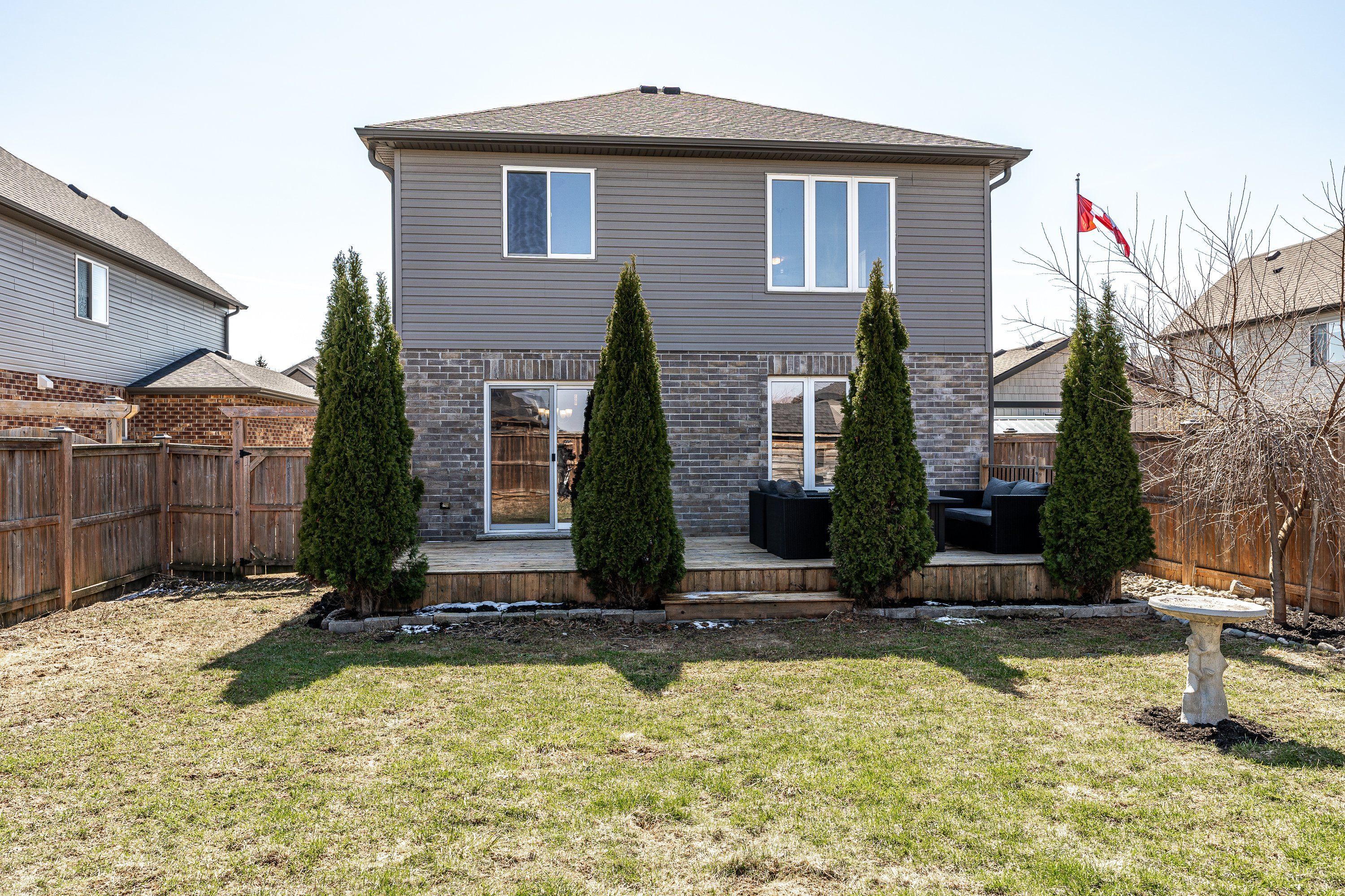 Step through the impressive double front doors at 59 bradshaw drive into a warm and welcoming foyer offering a beautiful introduction to this thoughtfully designed home. The main floor features a stylish powder room and convenient laundry, while the heart of the home unfolds into an open-concept kitchen, dining, and living space. Soaring cathedral ceilings and expansive windows create a light-filled atmosphere, perfectly blending comfort and sophistication for both everyday living and entertaining. Upstairs, an open and airy layout continues with three generously sized bedrooms. The large primary suite is complete with his-and-hers closets that lead seamlessly into a private ensuite. The unfinished basement presents great potential, featuring a bathroom rough-in, an egress window, and abundant storage, ideal for future development into a spacious rec room, additional bedroom, or in-law suite. Outdoors, enjoy a fully fenced backyard designed for both relaxation and gathering, highlighted by a large wood deck and a convenient storage shed. A double car garage completes this beautifully appointed property, ideally located near the stratford rotary complex, parks, schools and amenities. A home where comfort meets style, ready for you to move in and make it your own.