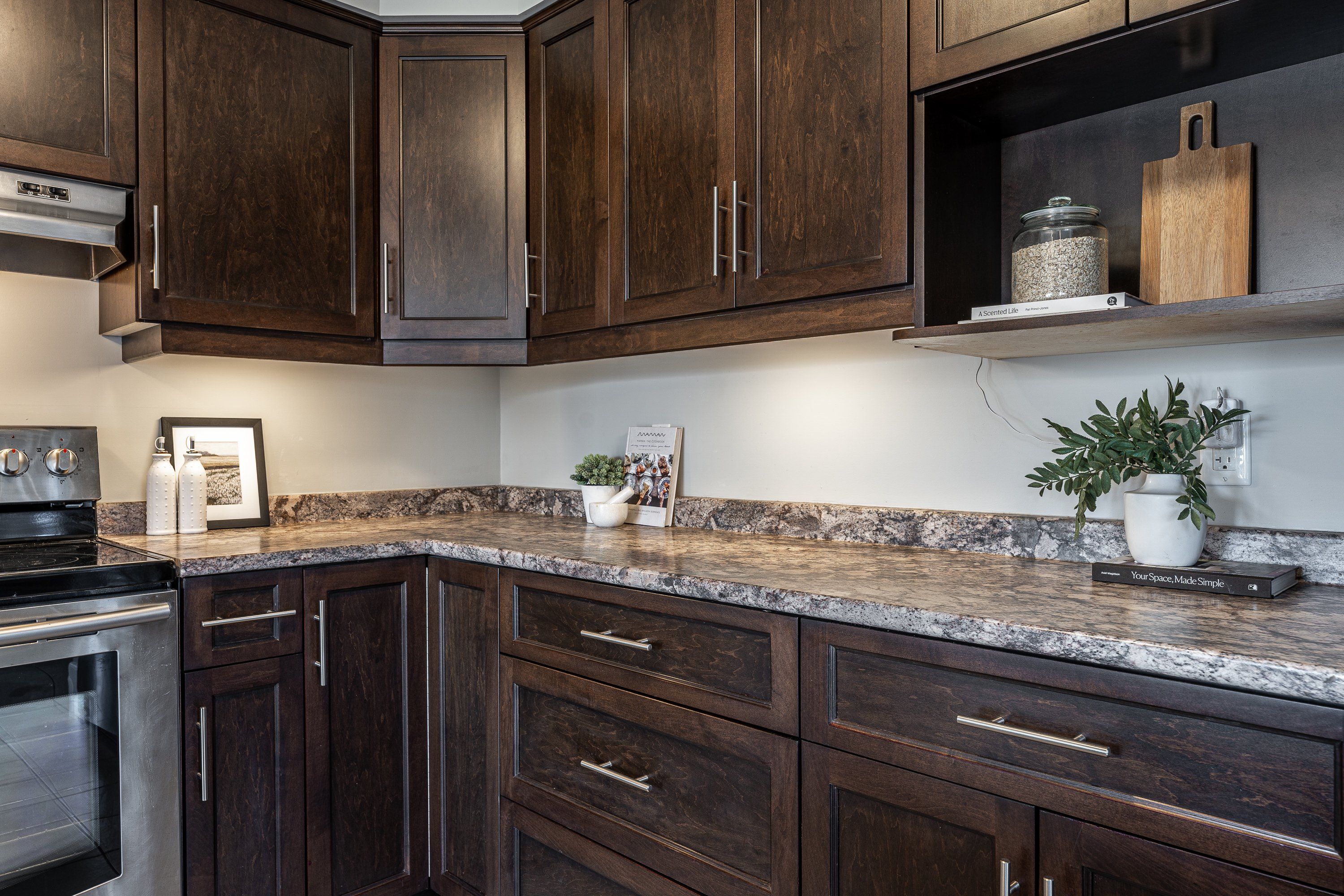 • Open-concept kitchen, dining, and living space with cathedral ceilings invites light.