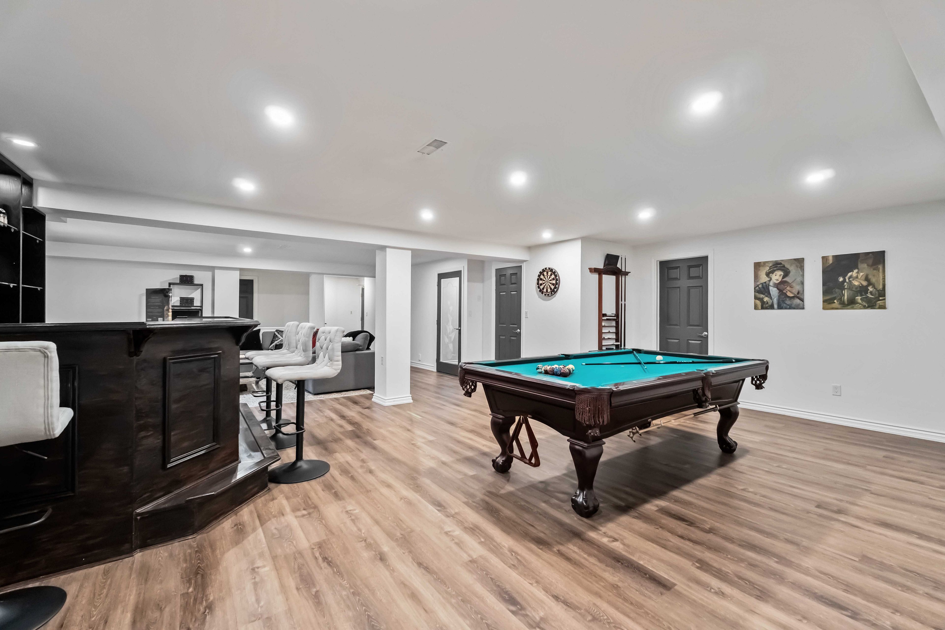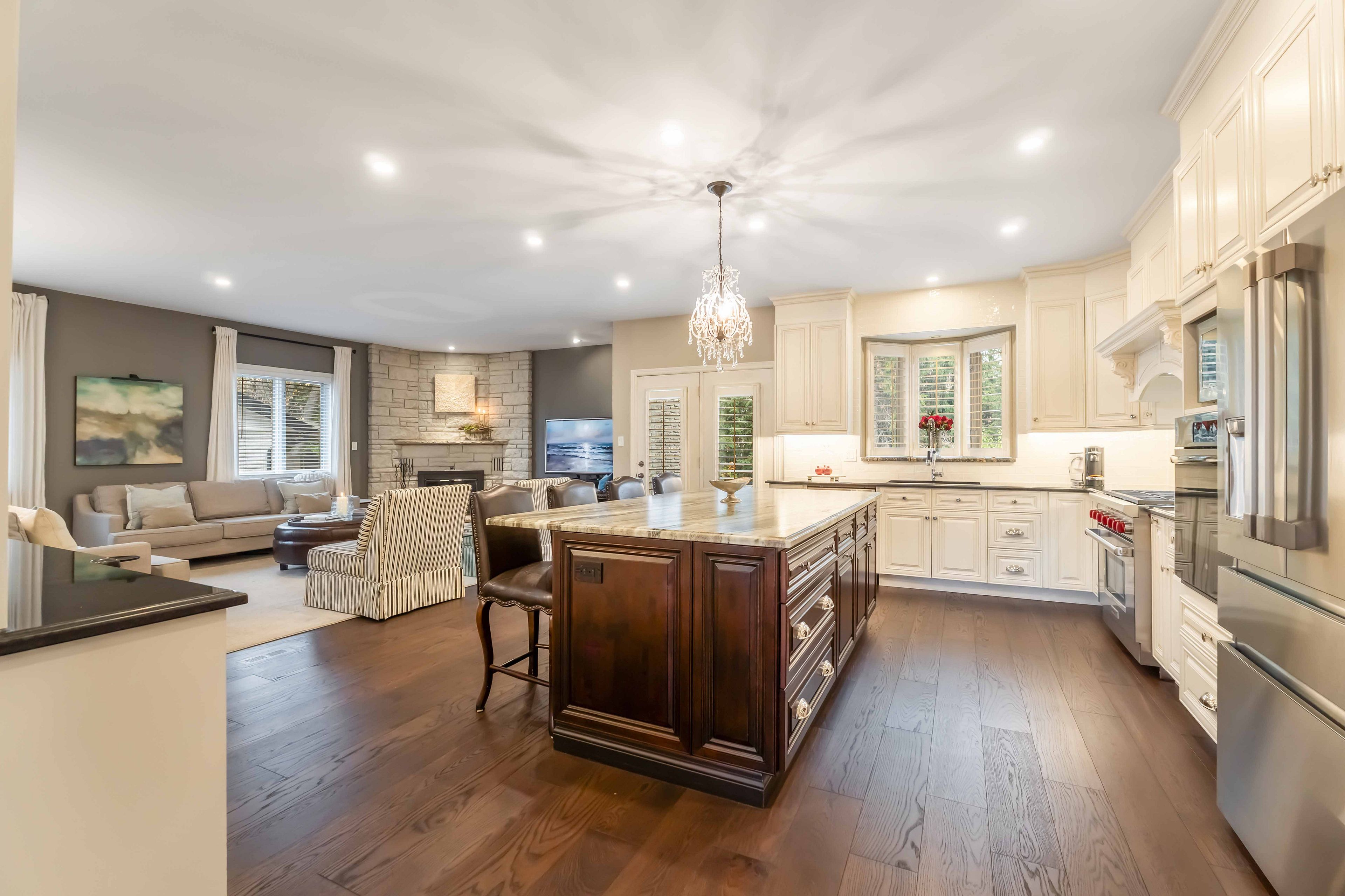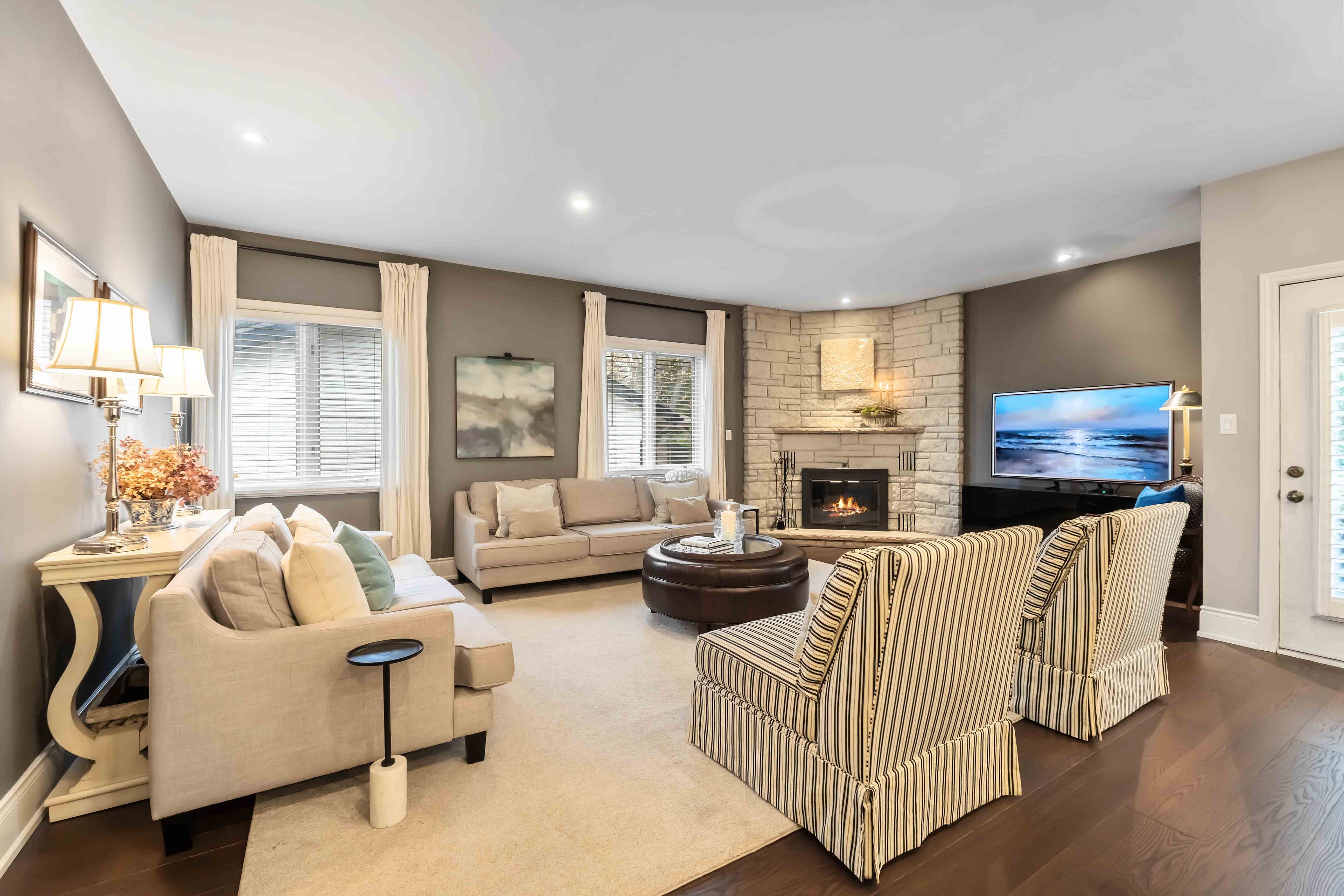 Absolutely gorgeous! This fabulously renovated bungalow offers over 4300 sq ft of refined living in the prestigious lakefront community of fifty point. Renovated within the last five years, the home blends high-end craftsmanship with warm, inviting style for a truly turnkey experience. A dramatic 11 ft foyer welcomes you into sun-filled spaces featuring 9 ft ceilings, elegant lighting, and rich new hardwood floors throughout the main level. The open-concept gourmet kitchen is the centerpiece of the home, boasting stone countertops, premium appliances, custom cabinetry, and an impressive island designed for cooking, gathering, and entertaining. The spacious dining area flows into a warm yet grand great room anchored by a charming wood-burning fireplace-perfect for everyday living or hosting. The primary bedroom feels like a private retreat with a walk-in closet and spa-inspired ensuite featuring a glass shower, deep soaker tub, and modern designer finishes. Two additional large bedrooms, a stylish 4-piece bath, and a chic 2-piece powder room complete the main floor. The professionally finished lower level, with its own separate entrance, offers a full in-law suite ideal for extended family or guests. It includes a generous rec room with a gas fireplace and bar, two big bedrooms with walk-in closets, a renovated 3-piece bath, and a functional eat-in kitchen. Step outside to your private backyard oasis, featuring a new saltwater pool with fibre-optic lighting, lush landscaping, a spacious patio, gazebo, and storage shed-perfect for relaxing or entertaining. With luxury finishes, thoughtful updates, and undeniable curb appeal, this home delivers comfort, style, and resort-like living. Close to the marina, beach, bruce trail, and 50 point conservation area-ideal for nature lovers and outdoor enthusiasts.