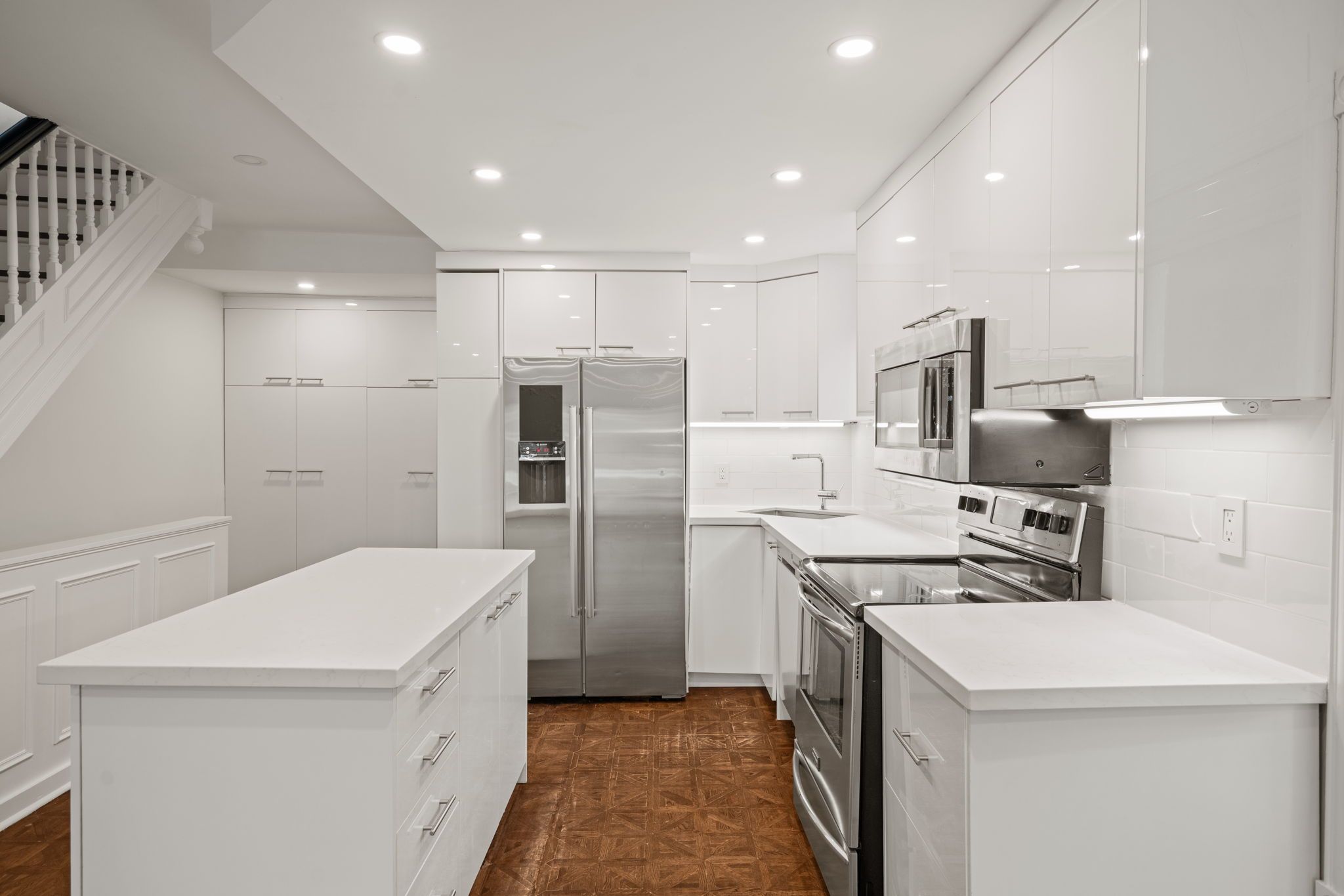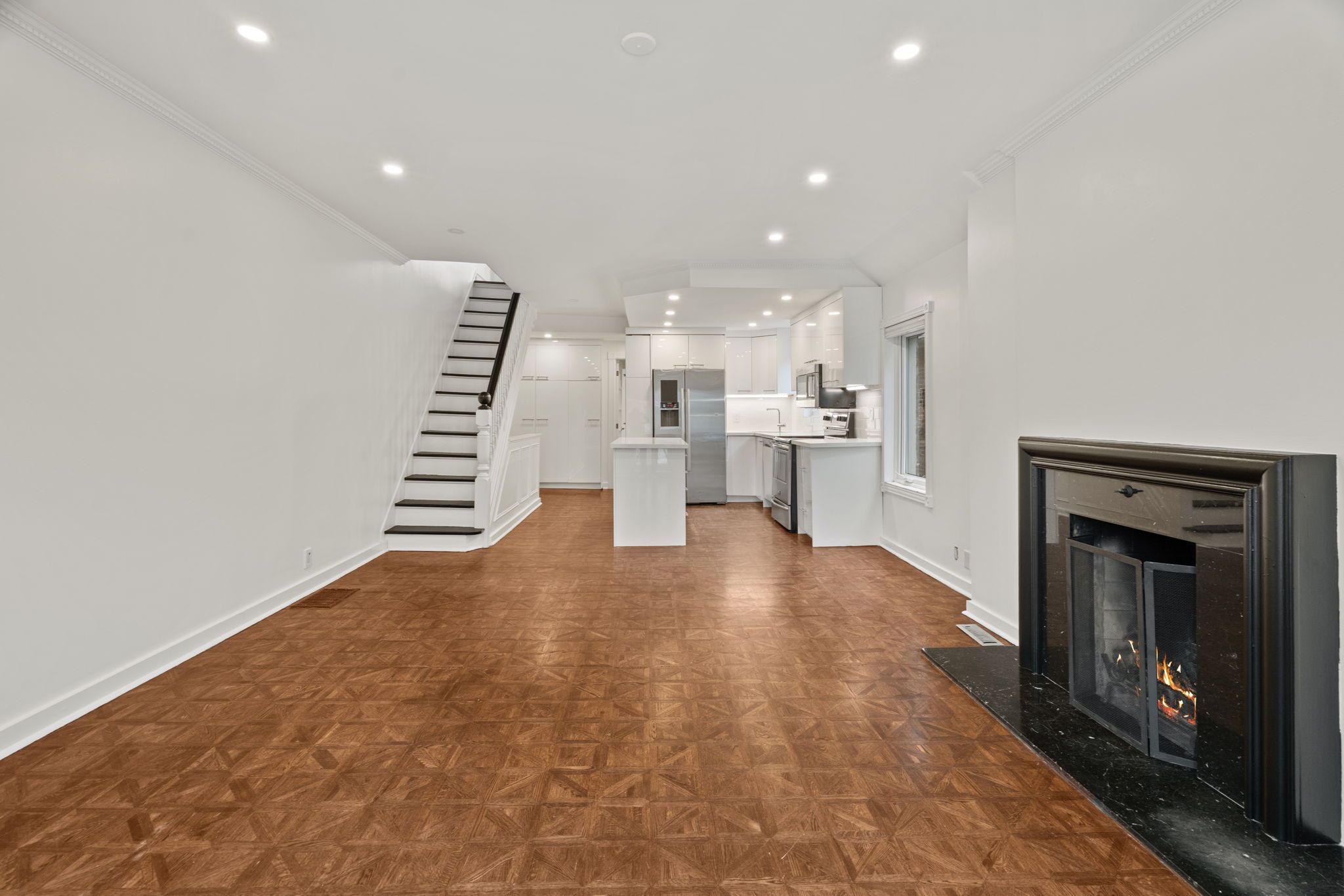 • Stylish exposed brick and open-concept kitchen with modern appliances.