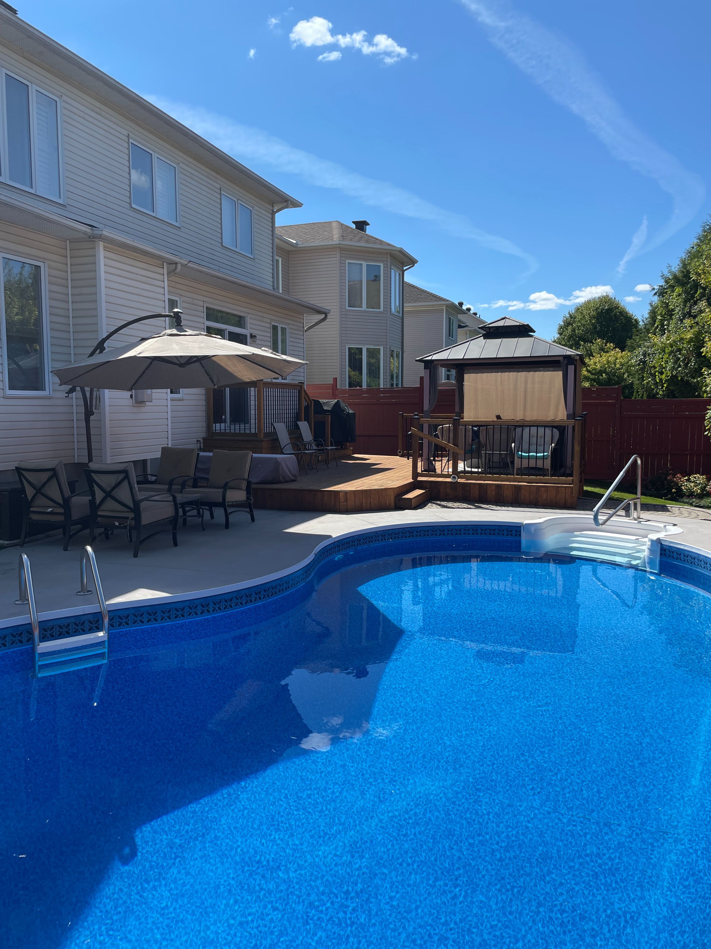 • Backyard oasis with a deck, gazebo, and inground pool.