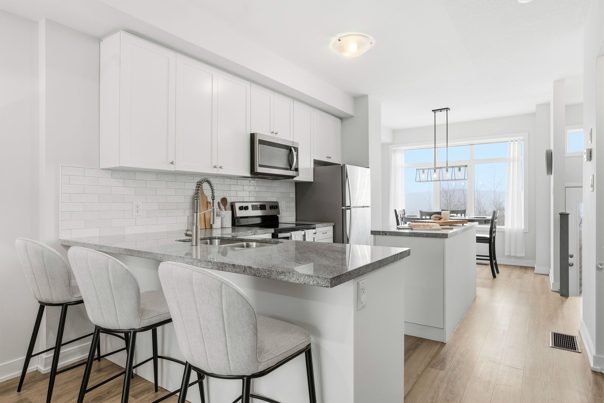 • Kitchen features granite countertops, shakers, and an island for extra space.
