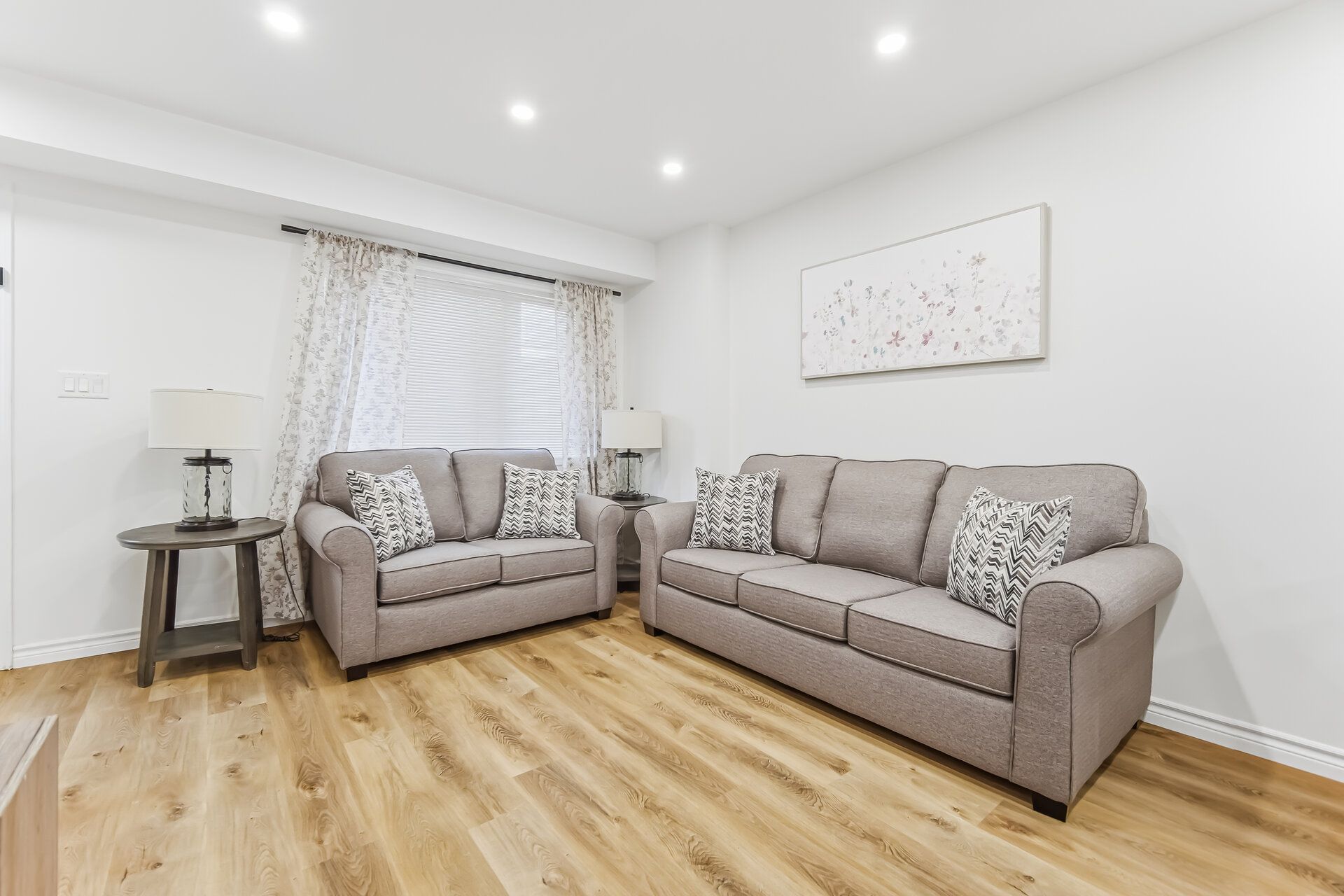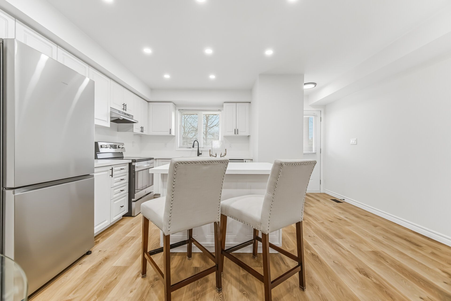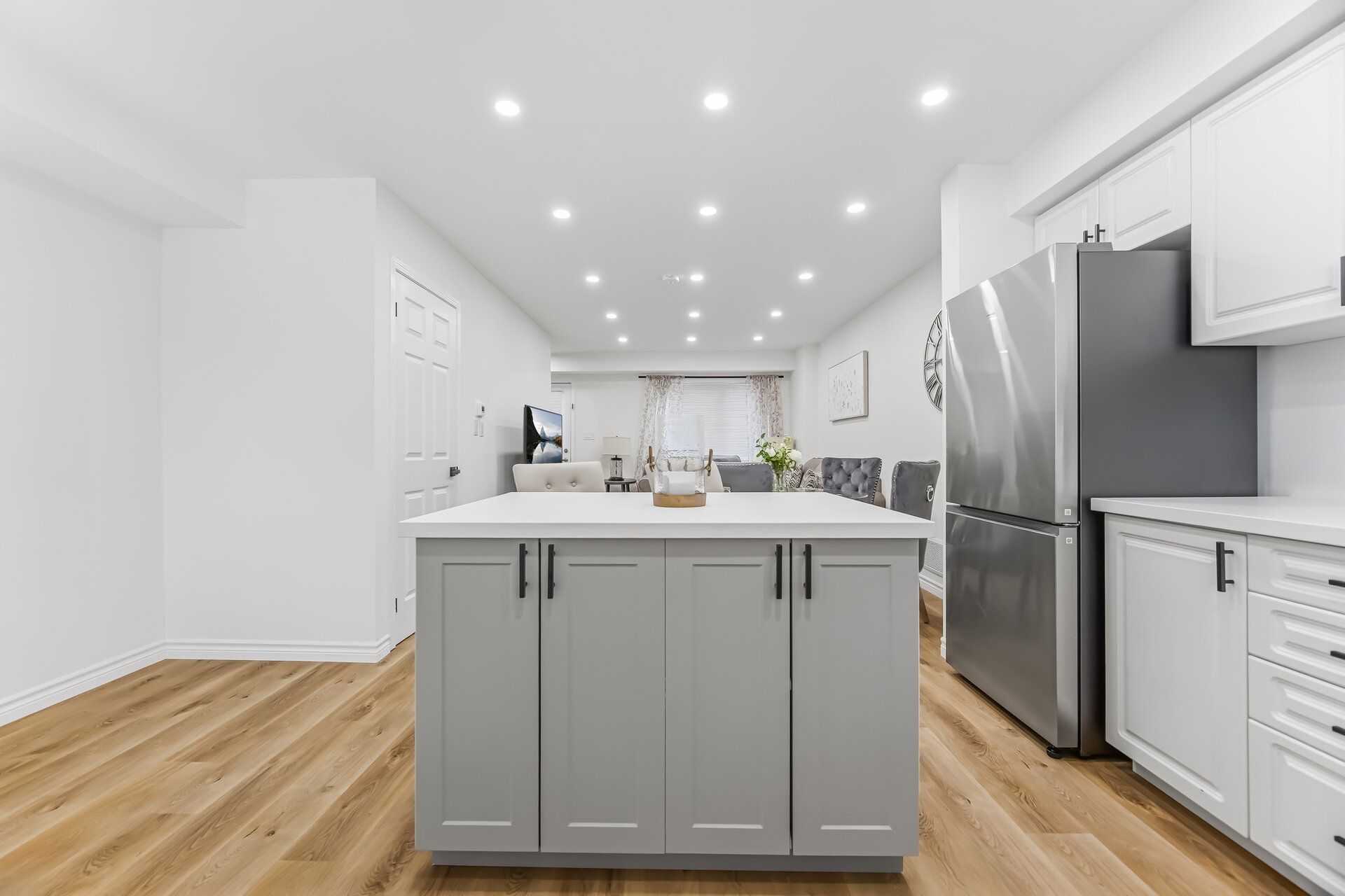Welcome to your dream home. Rare 4 bedroom, 3 bathroom townhome in desirable location in brampton with nearly 2,000 sqft of finished living space. Renovated throughout, this spacious home is move-in-ready featuring updated flooring and a stylish, upgraded kitchen with quartz countertops, an island am brand new stainless steel appliances, perfect for entertaining or everyday living. The open layout is filled with natural light, creating a warm and inviting atmosphere. The basement is tastefully finished with a 2-piece bath and laundry room. The complex offers plenty of visitor parking. Ideally located beside the newly developed recreation centre and just minutes from brampton go station, downtown brampton, shopping plazas, transit, schools, parks, and major commuter routes, and situated directly on a major bus route, this home delivers outstanding convenience and value. This home truly combines modern upgrades with natural surroundings and everyday conveniences. Don't miss it!