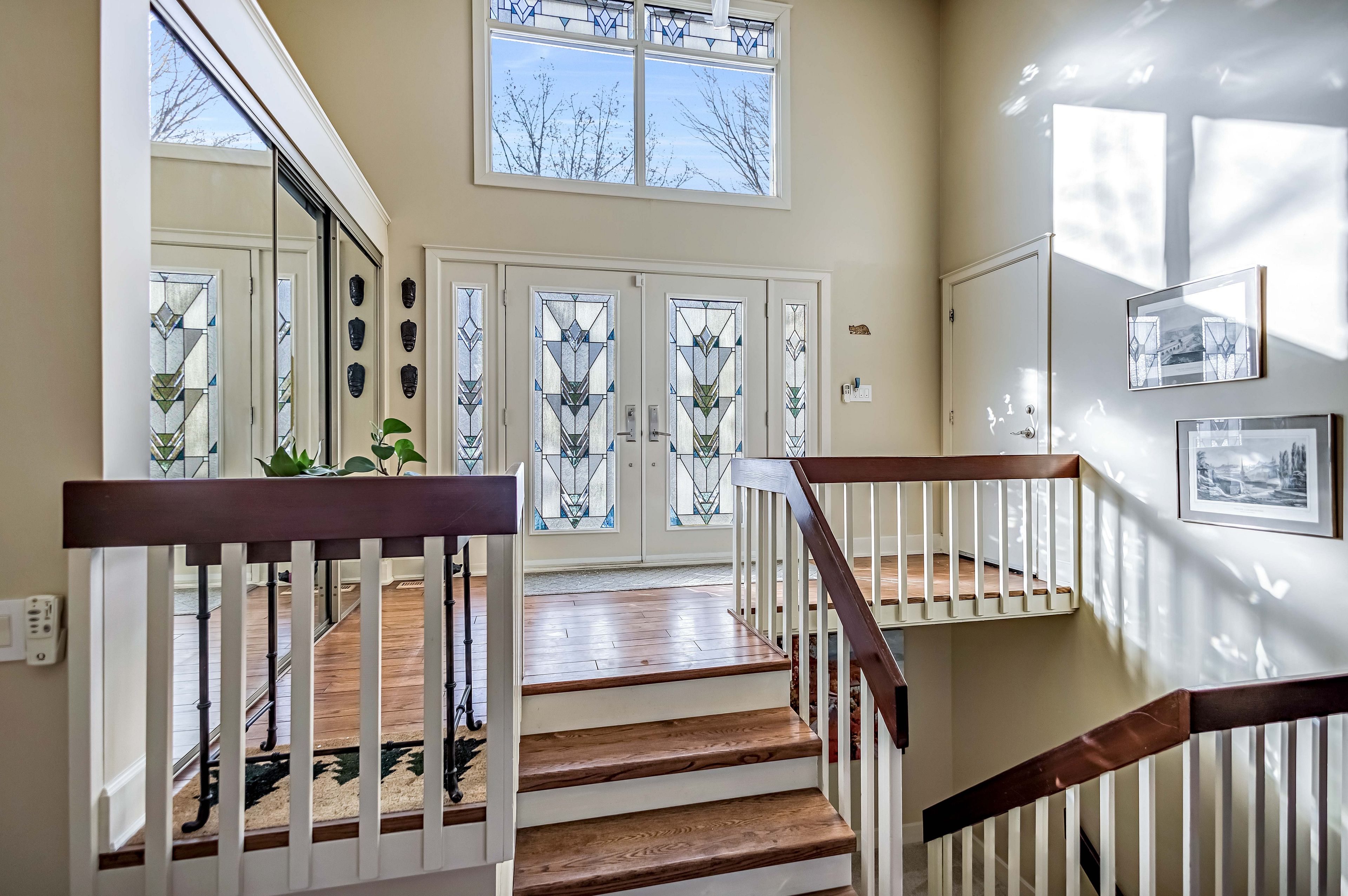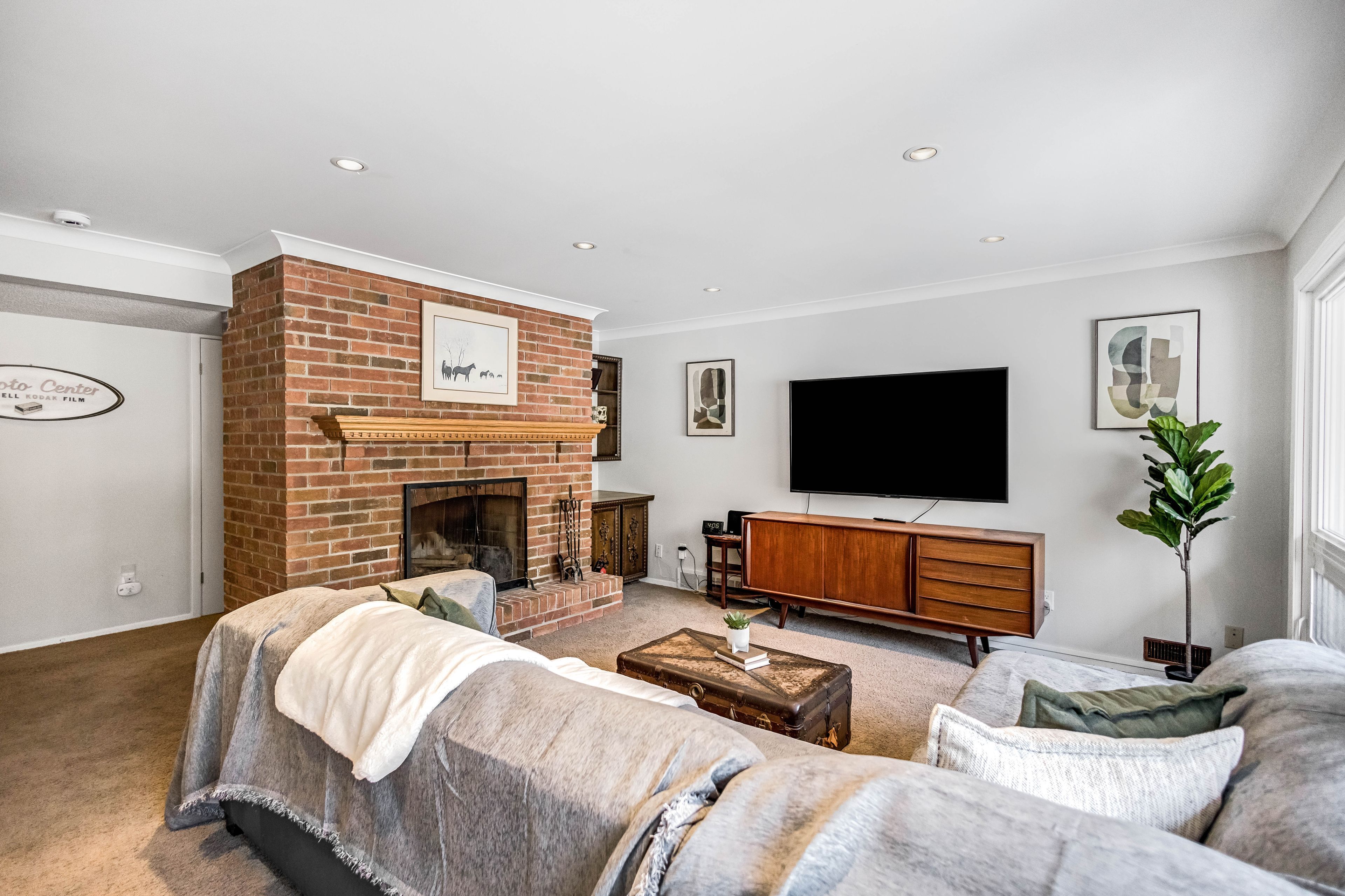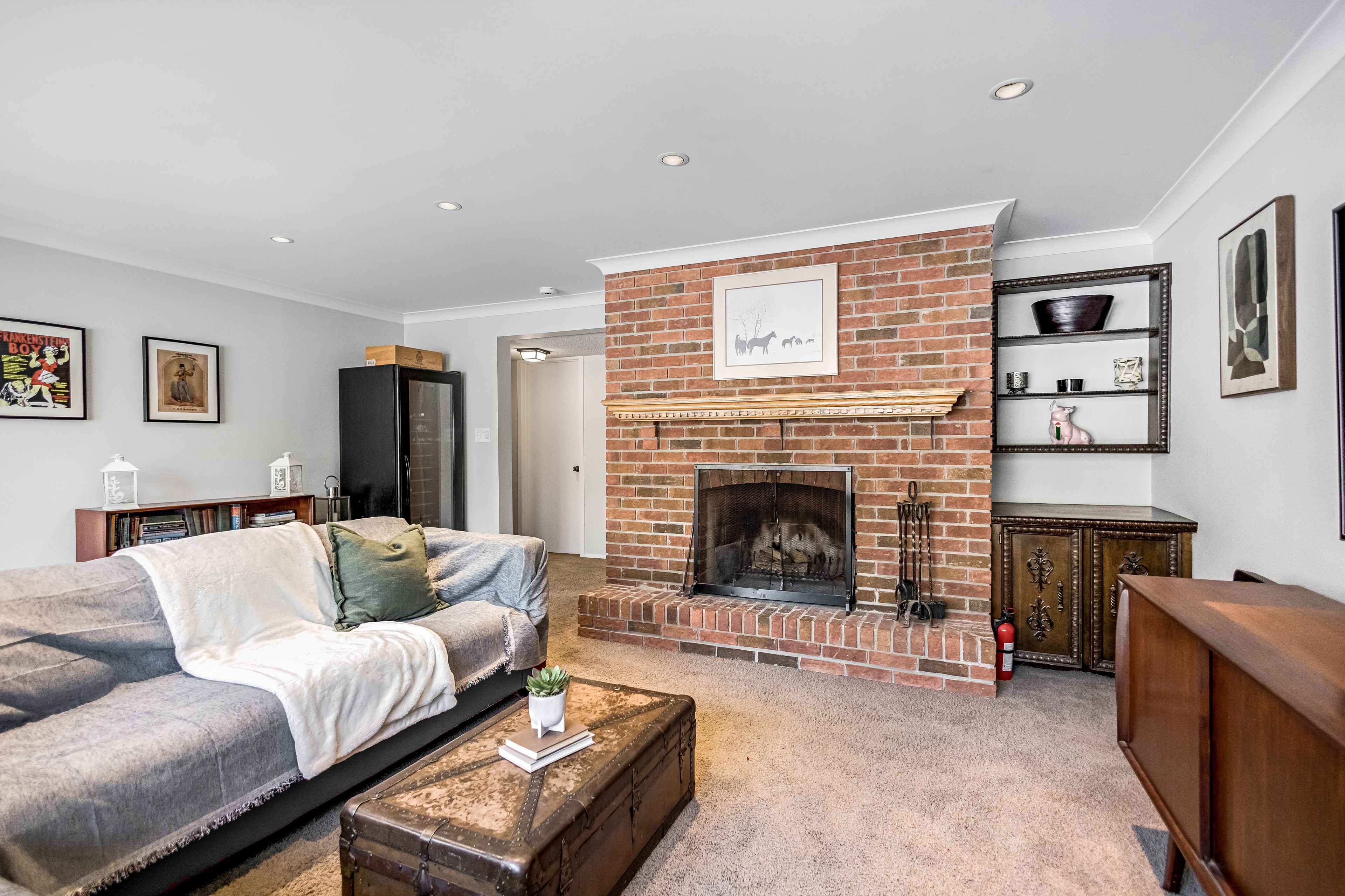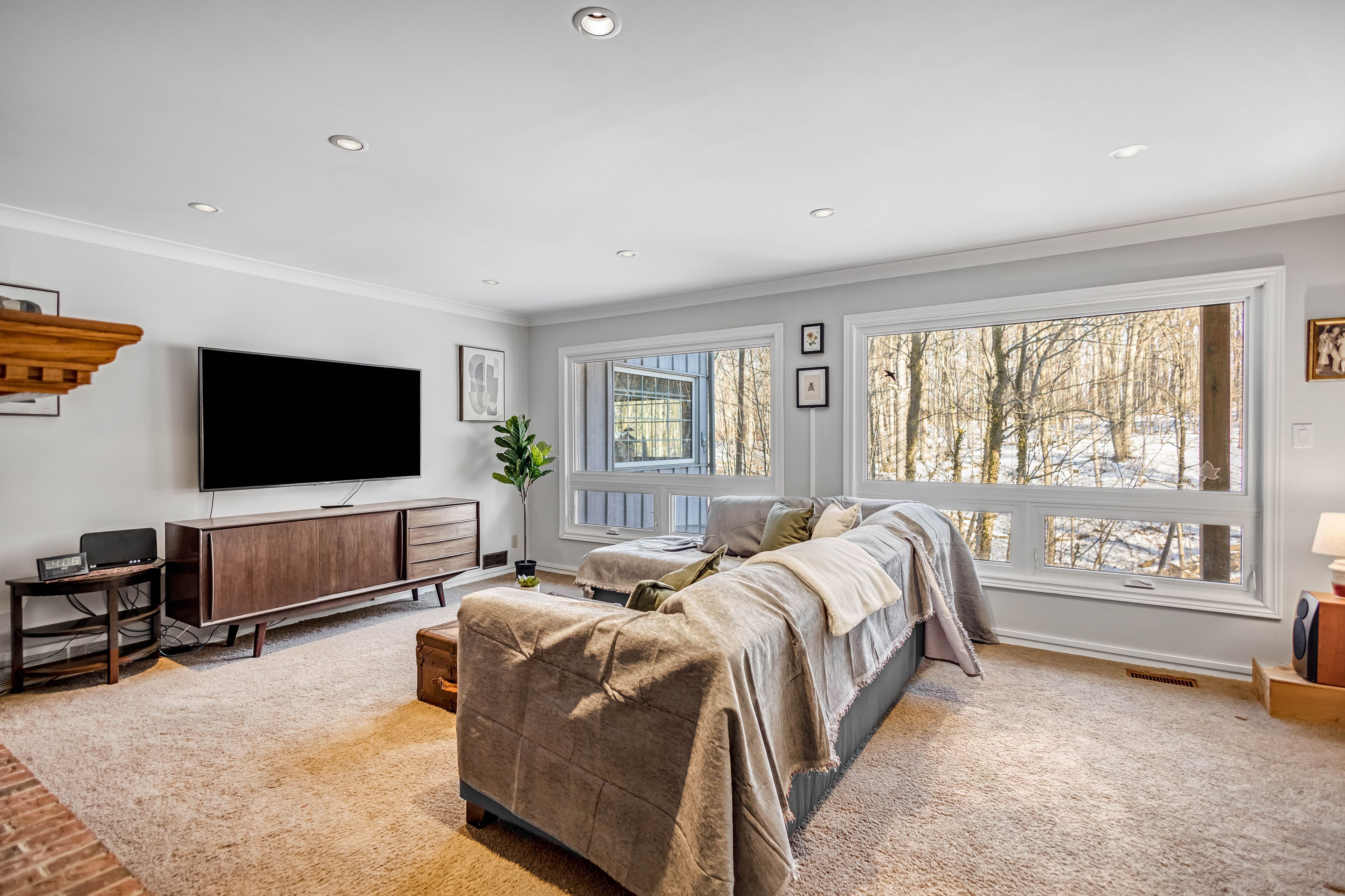 • Dramatic living space with a three-way wood-burning fireplace and large windows.