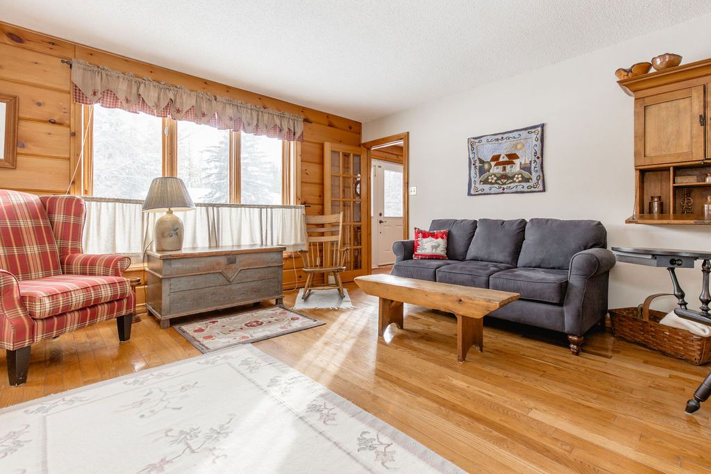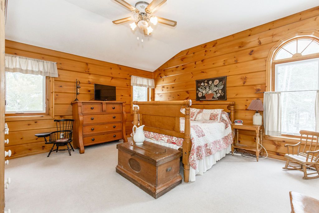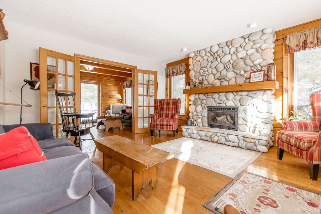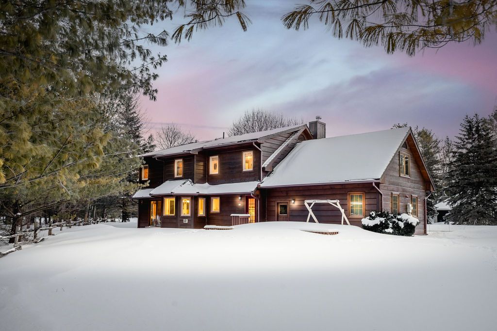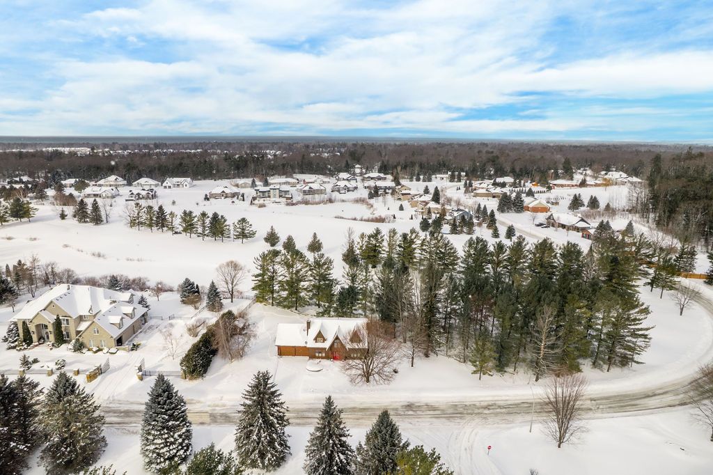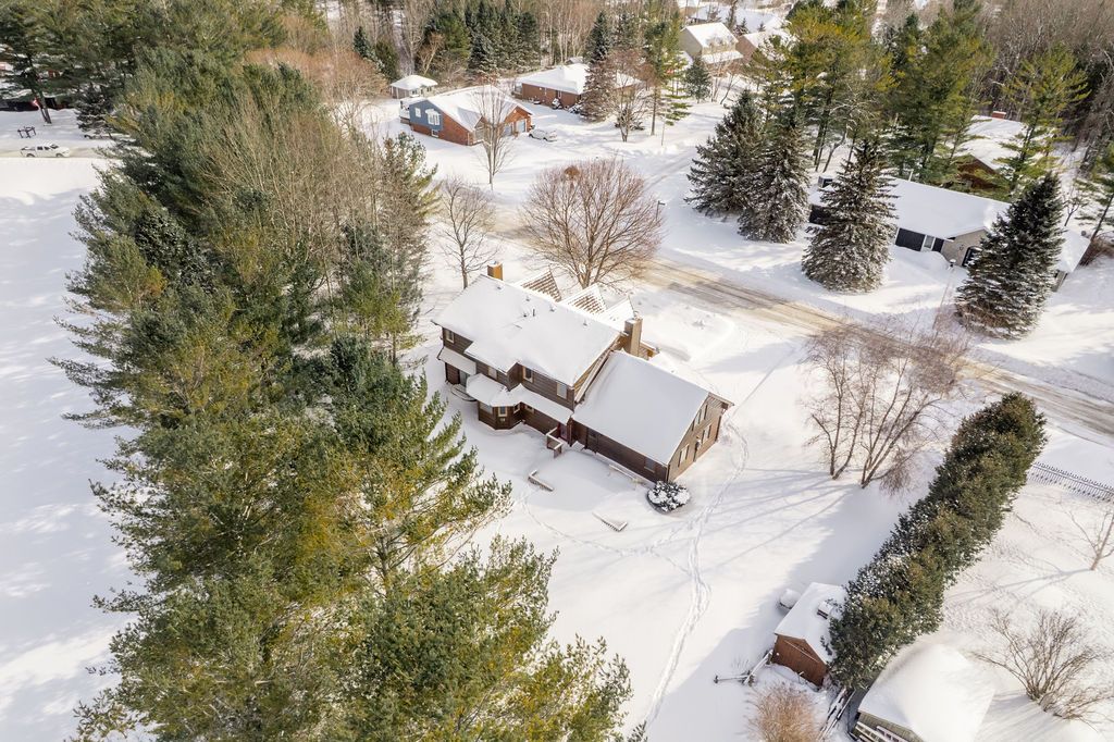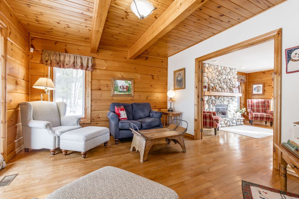 Stunning log home nestled on a large, private lot in a sought-after estate community, surrounded by mature trees and natural beauty in every season. Built in 1989, this warm and inviting home offers 3 bedrooms, 2 full bathrooms plus a powder room, and approximately 2,371 sq ft of finished living space, with an additional 260 sq ft of finished space above the garage. This is the kind of home where winter evenings are spent watching the snow fall through the trees, getting cozy by the gas fireplace after a day of skiing or snowshoeing, and summer nights are made for long walks through the quiet estate neighbourhood. A true four-season lifestyle. The updated kitchen features new quartz countertops and all new stainless steel appliances, including top-of-the-line fridge and stove just two years old. The primary bedroom includes an updated ensuite with soaker tub, separate shower, and modern vanity. The main floor is designed for connection, with hardwood flooring throughout the living room, family room, and formal dining room, and durable tile in the kitchen, hallway, powder room, and laundry room. Enjoy a gas fireplace with stone surround and wood beam mantle, a family room with sliding doors to the backyard, and french doors opening into the living room. Main-floor laundry includes washer, dryer, hot water tank, and direct access to the backyard. Upstairs, an open loft provides extra space for a home office or reading nook, along with two oversized bedrooms with double closets and a spacious primary bedroom. Additional features include, furnace- two years old - serviced annually, 200-amp electrical panel, owned water softener, reverse osmosis system, alarm system, irrigation system, 18 new windows, new front door, cedar shake roof, large rear deck, shed, double car garage with inside entry, garage door openers, and driveway parking for four vehicles. Move north to a beautiful lifestyle.