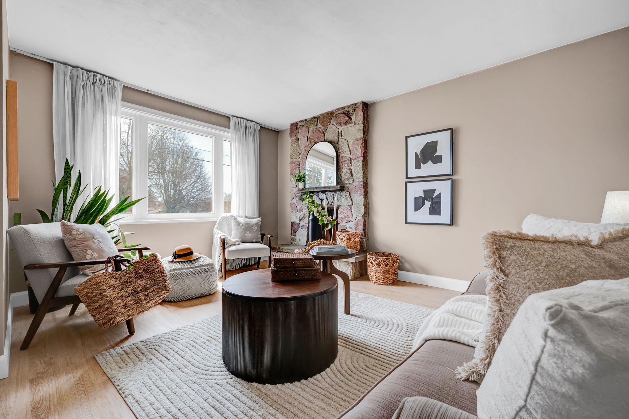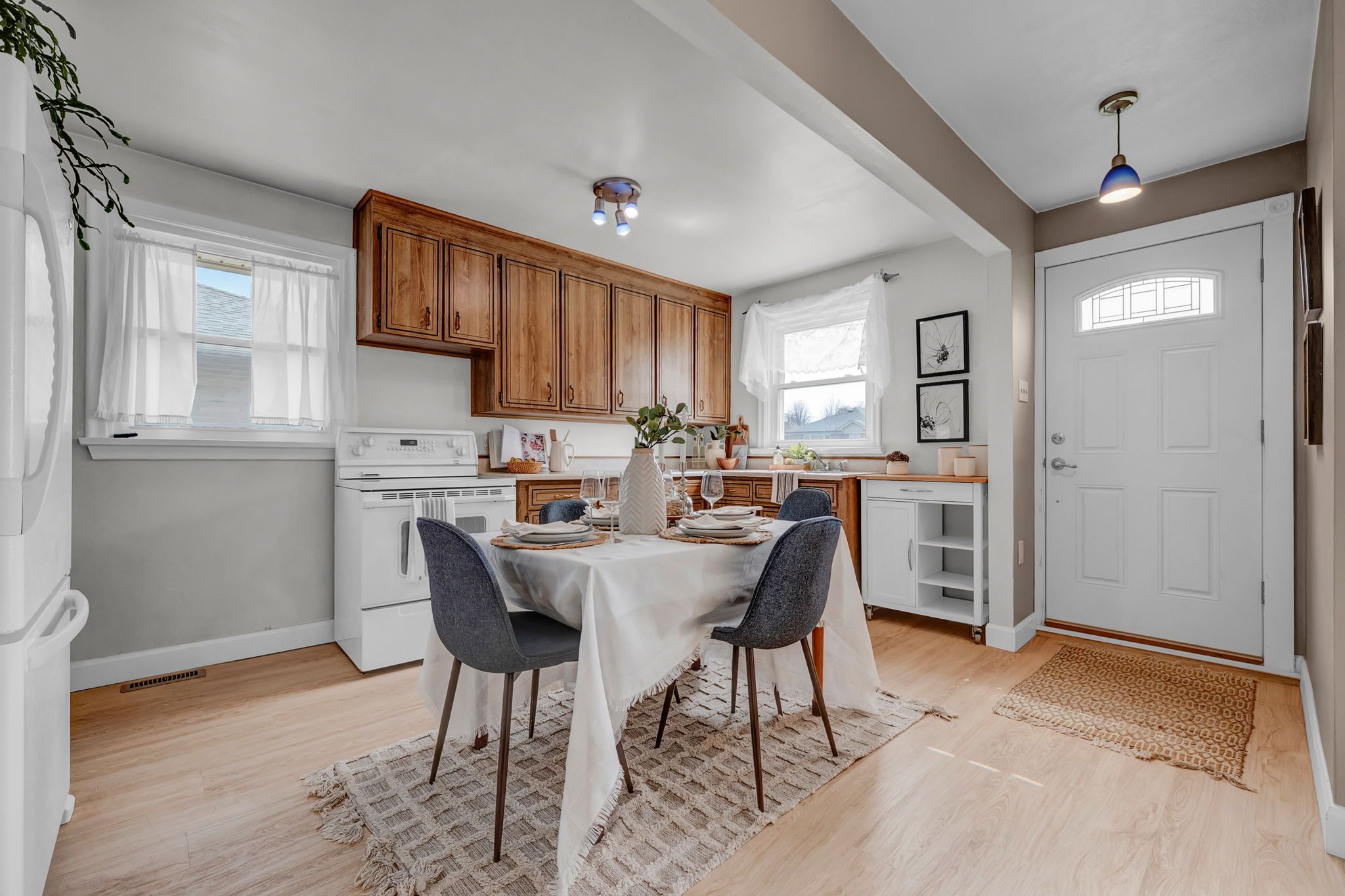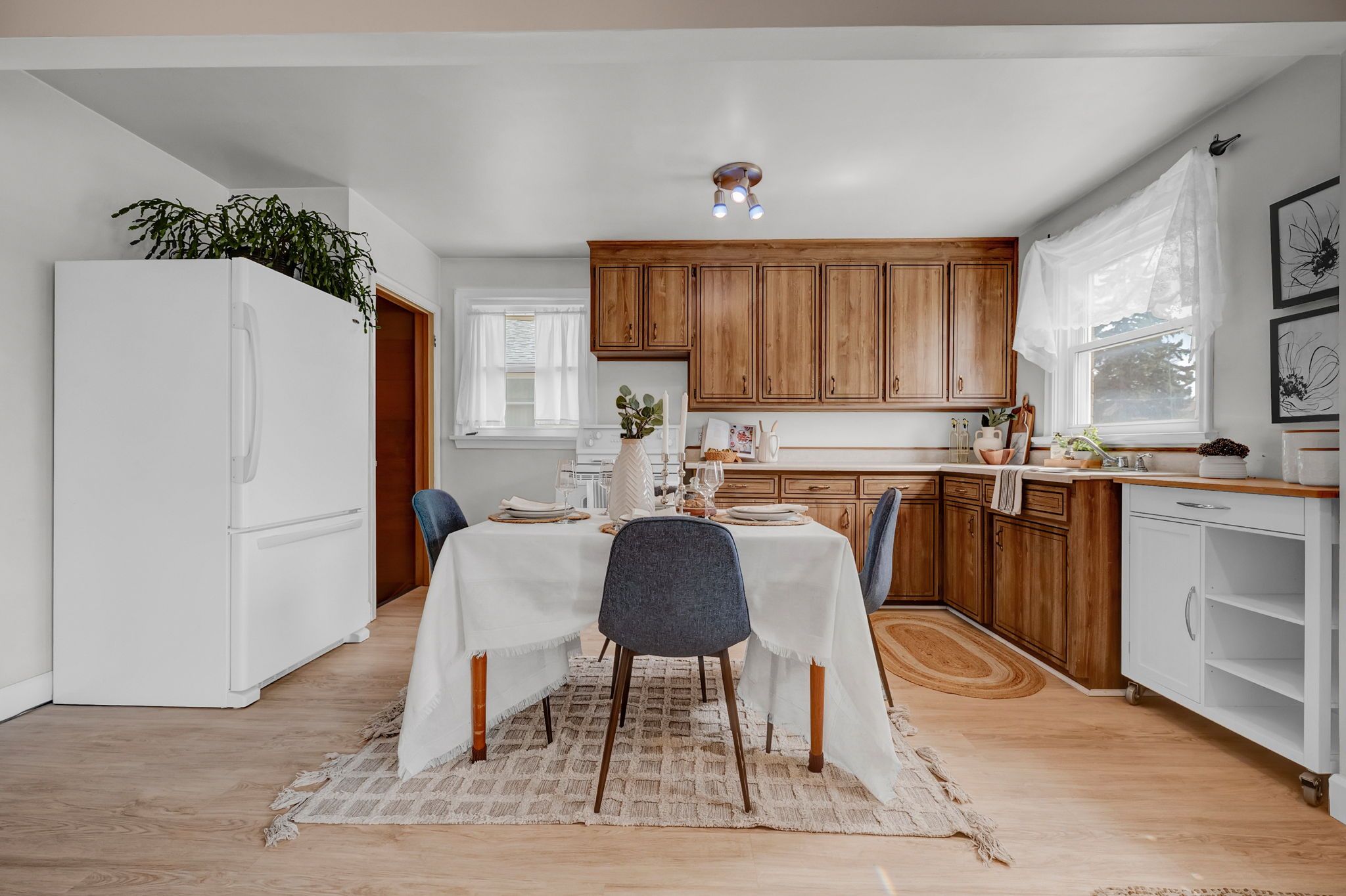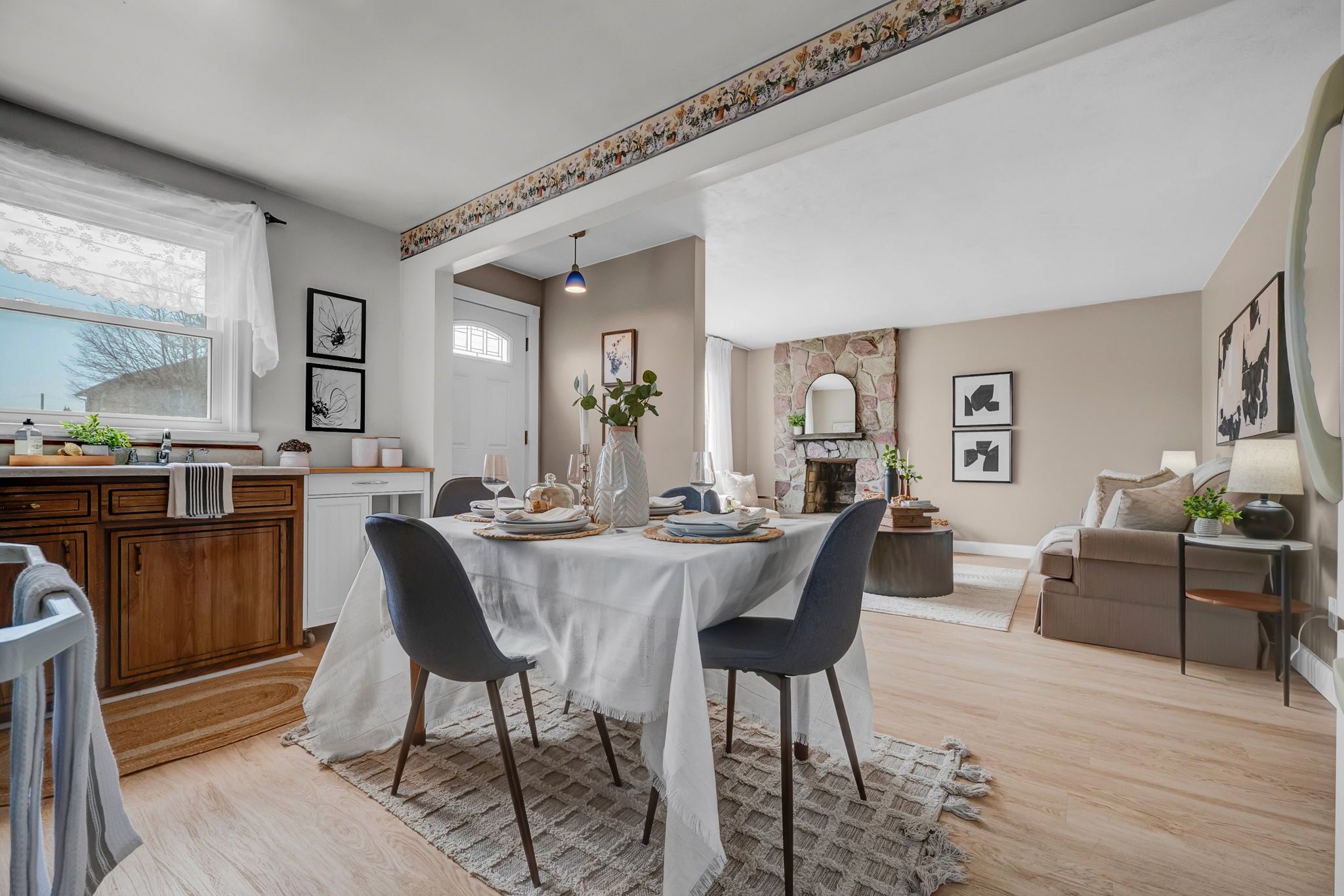 • Bright main floor layout with large windows and classic bathroom.