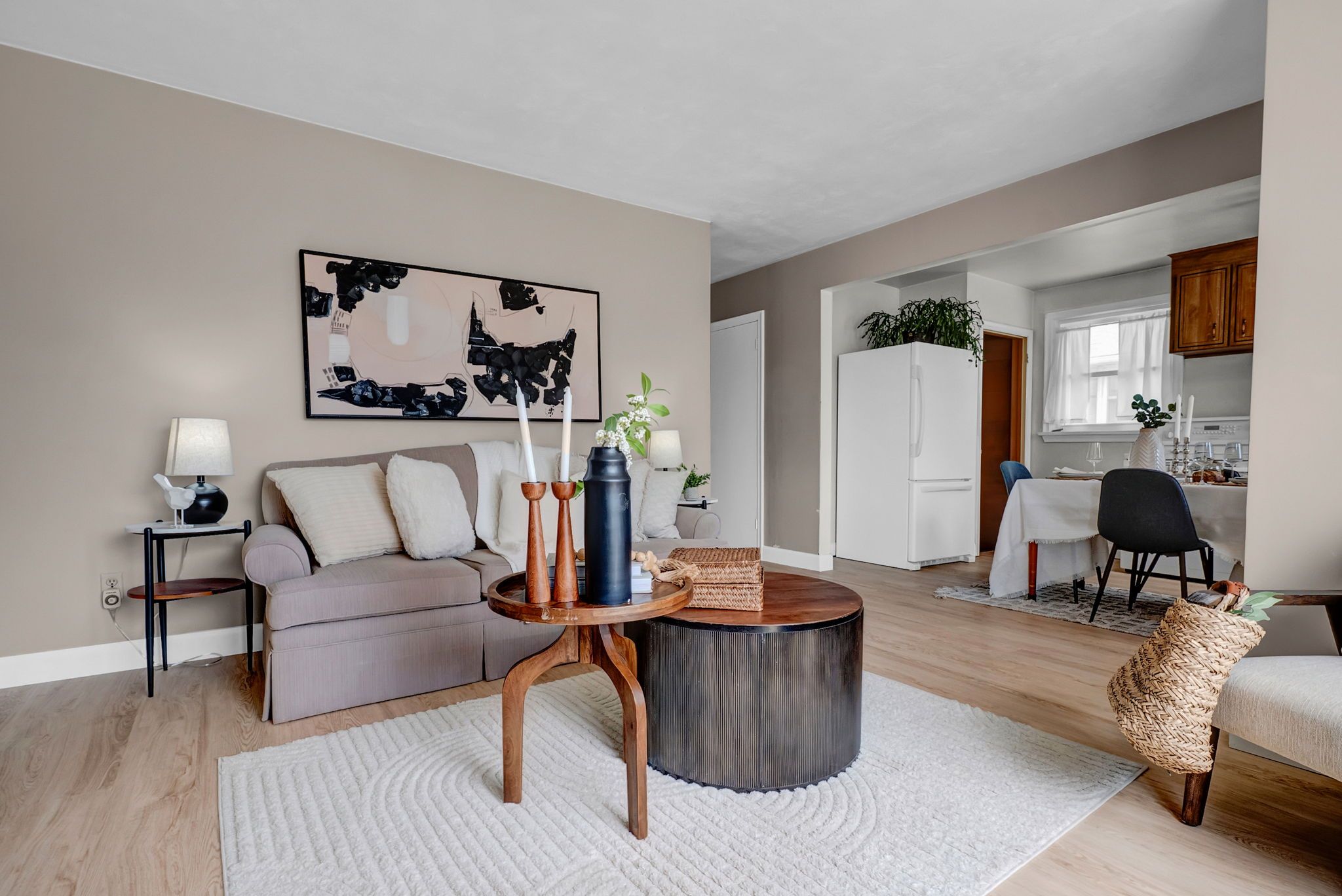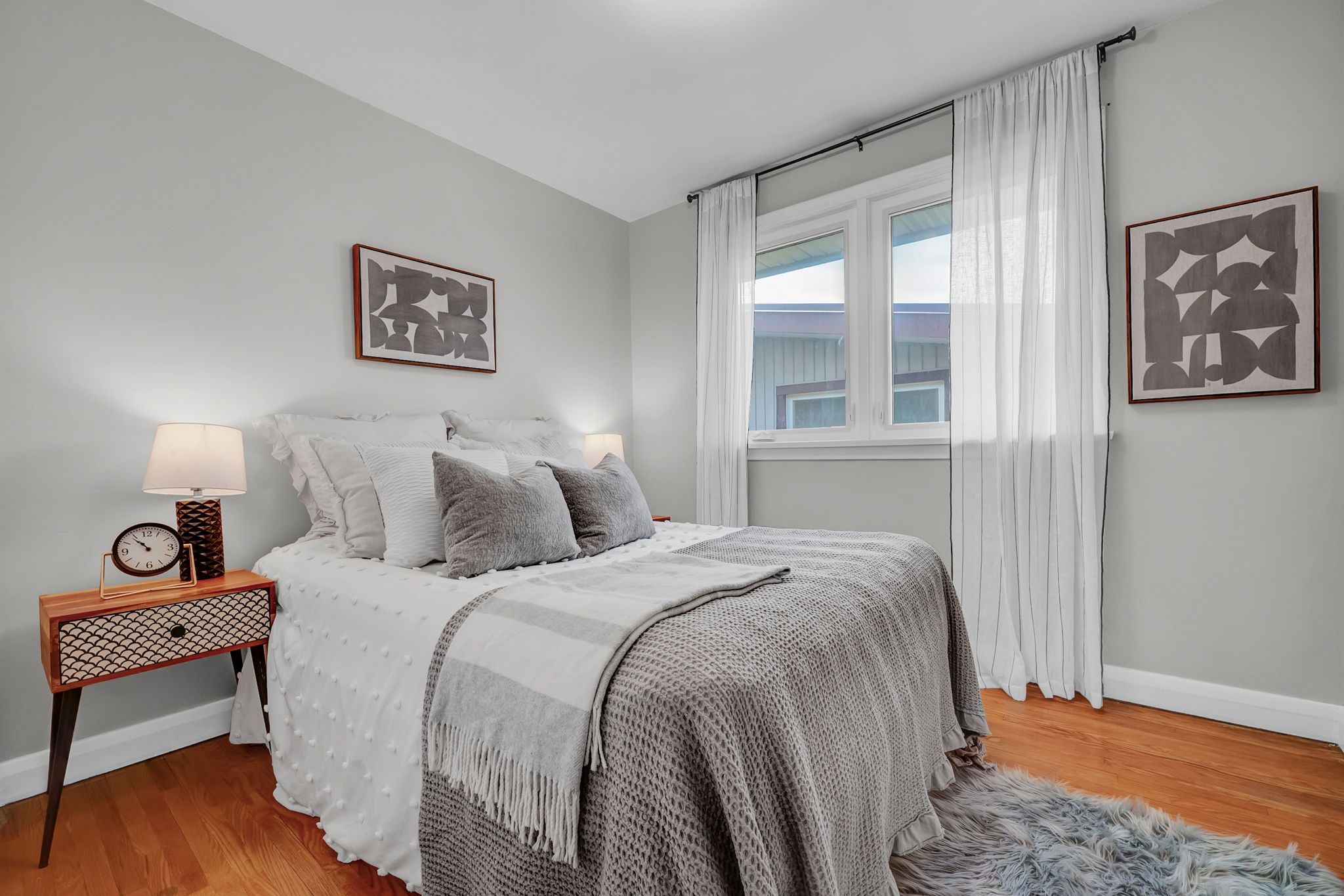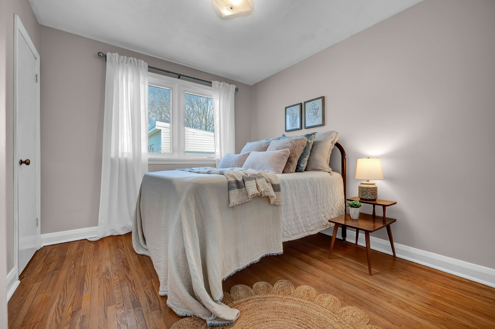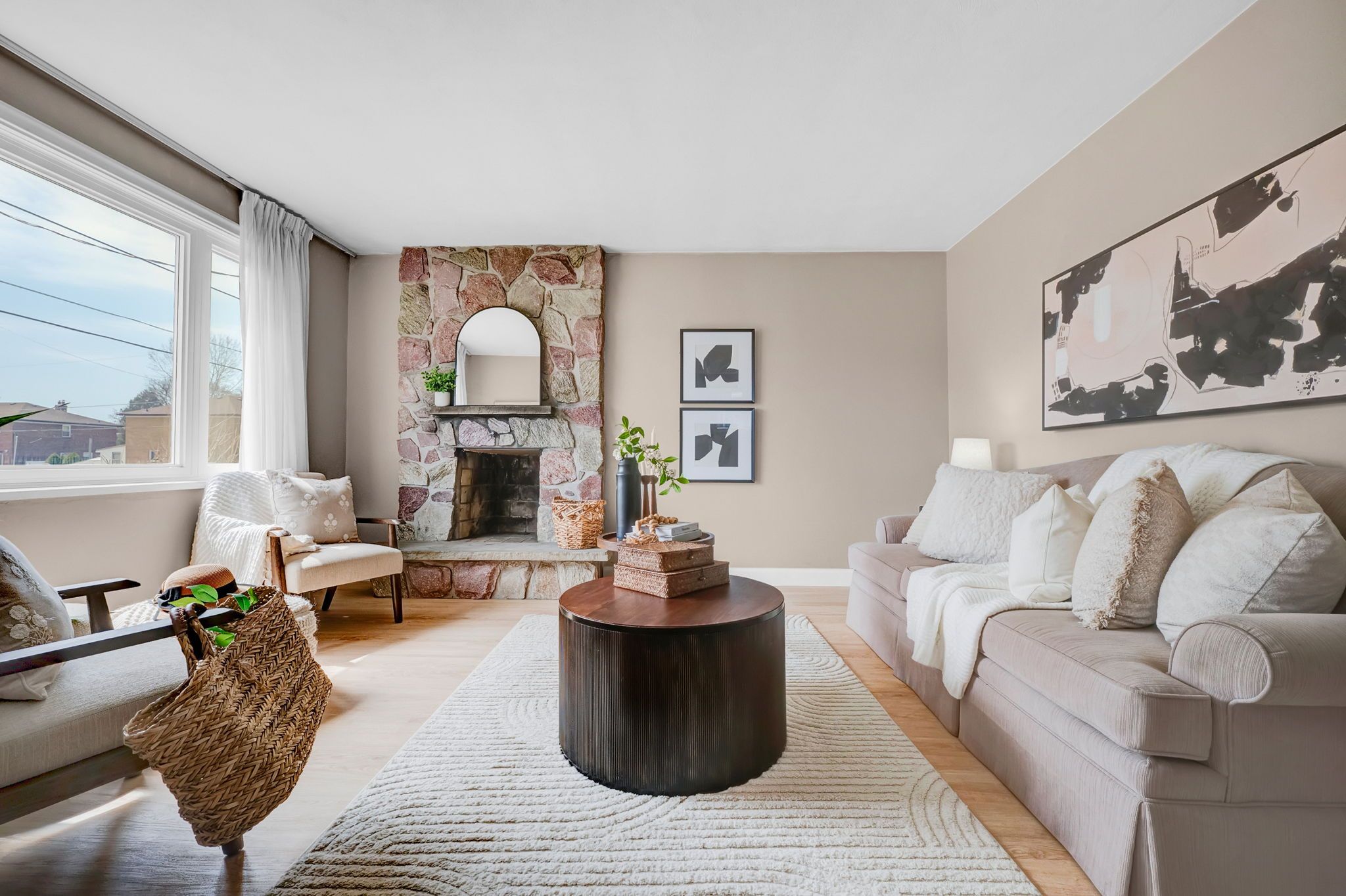 • Bright main floor layout with large windows and classic bathroom.