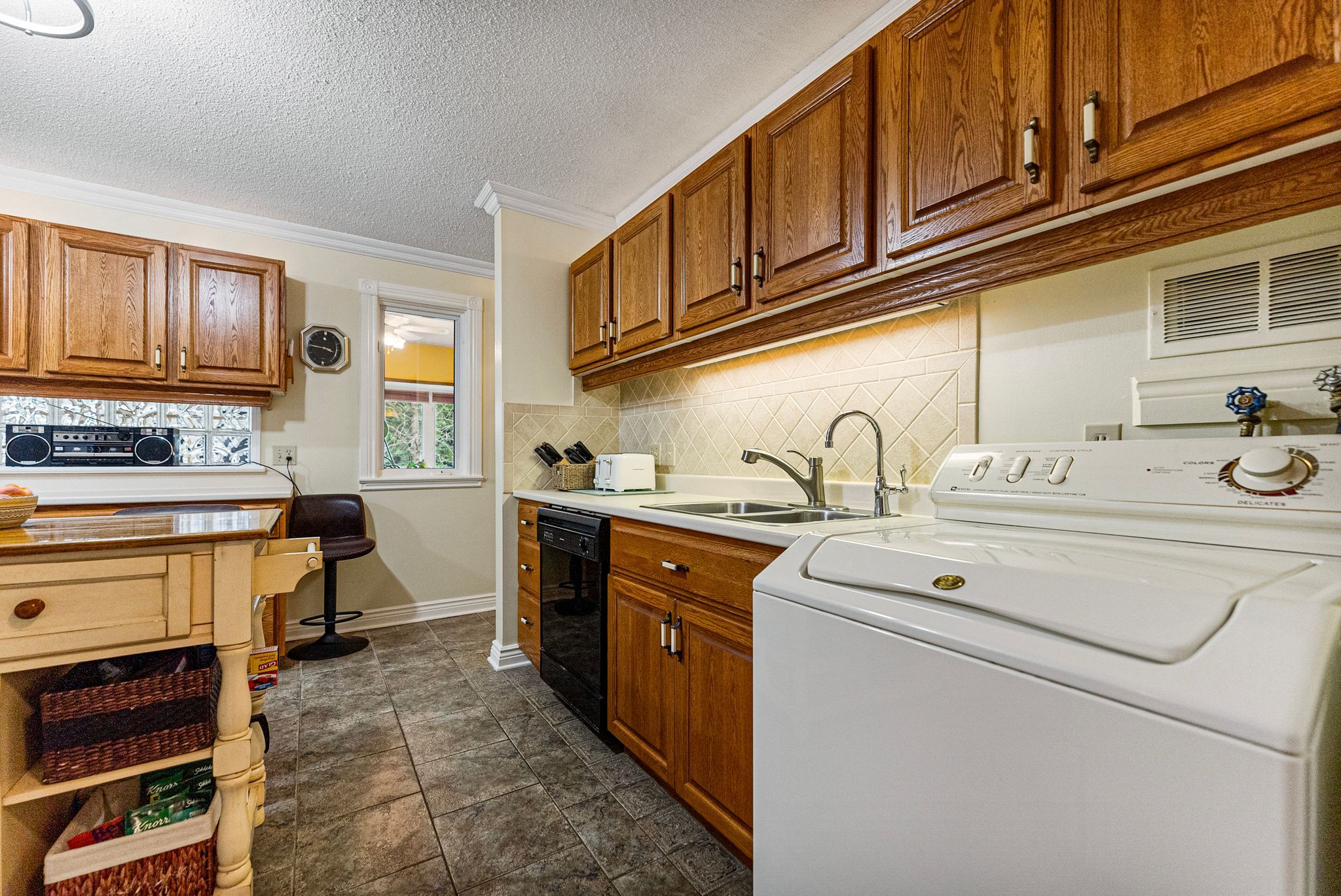 • Bright living room flowing into a kitchen and separate dining area.