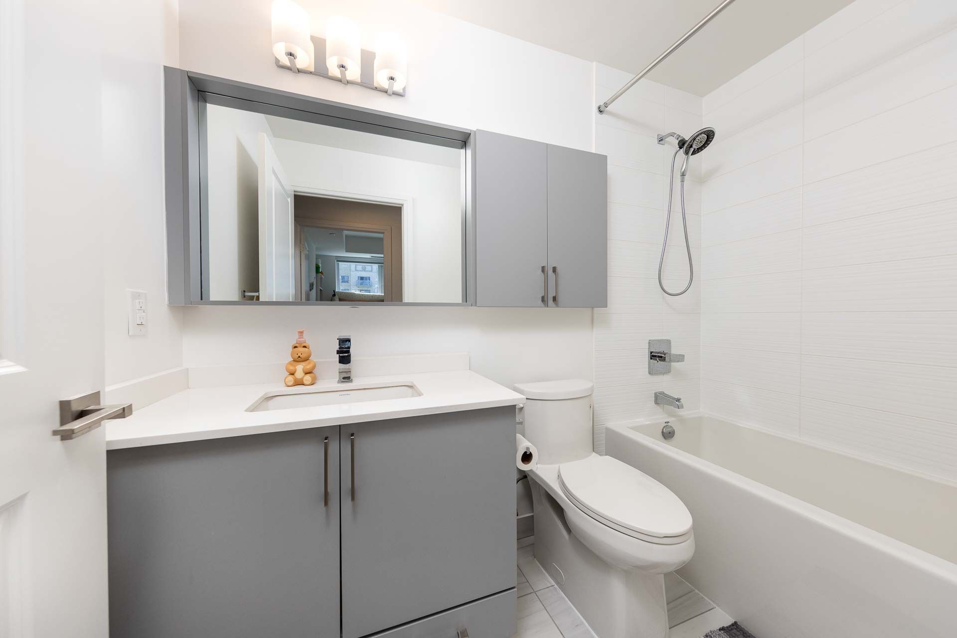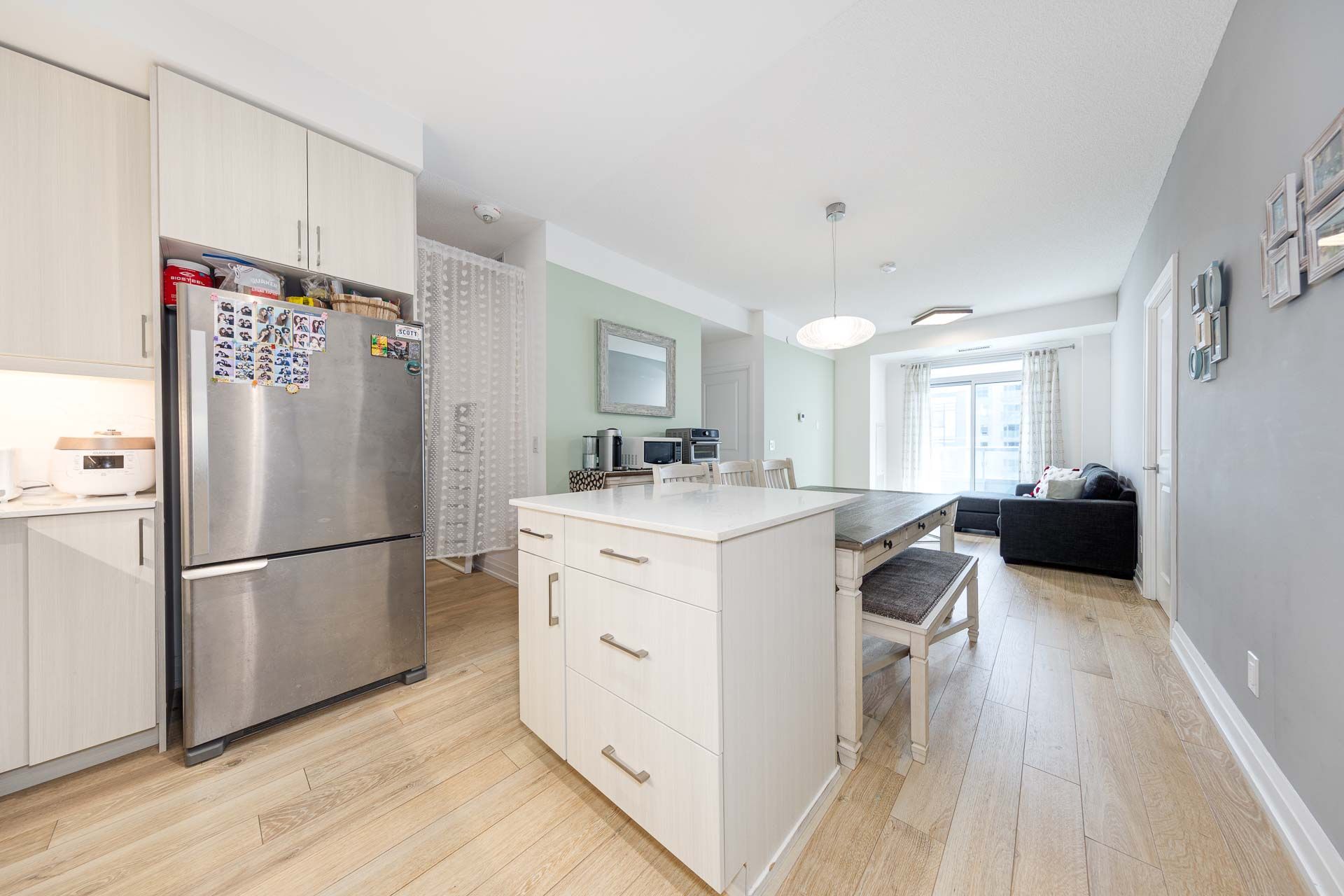 • Modern kitchen features quartz countertops and backsplash.