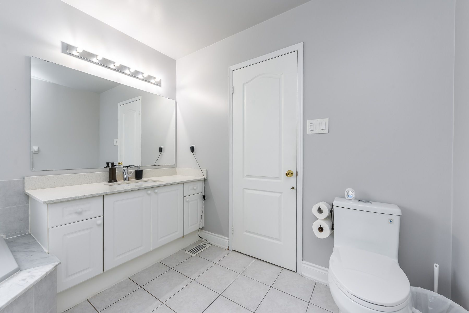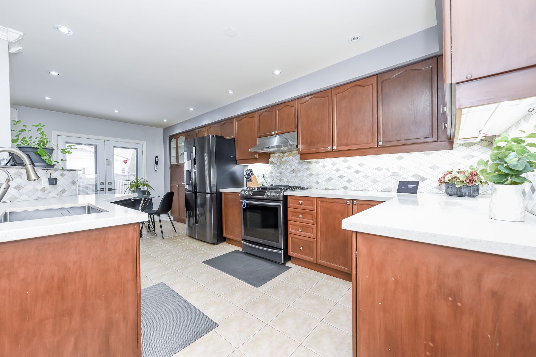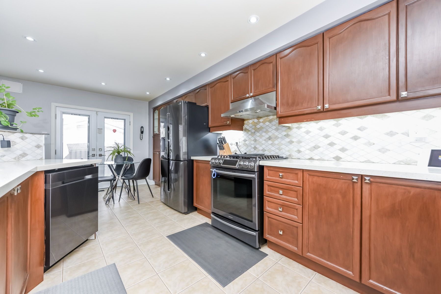 • Modern kitchen with quartz countertops and stainless steel appliances.