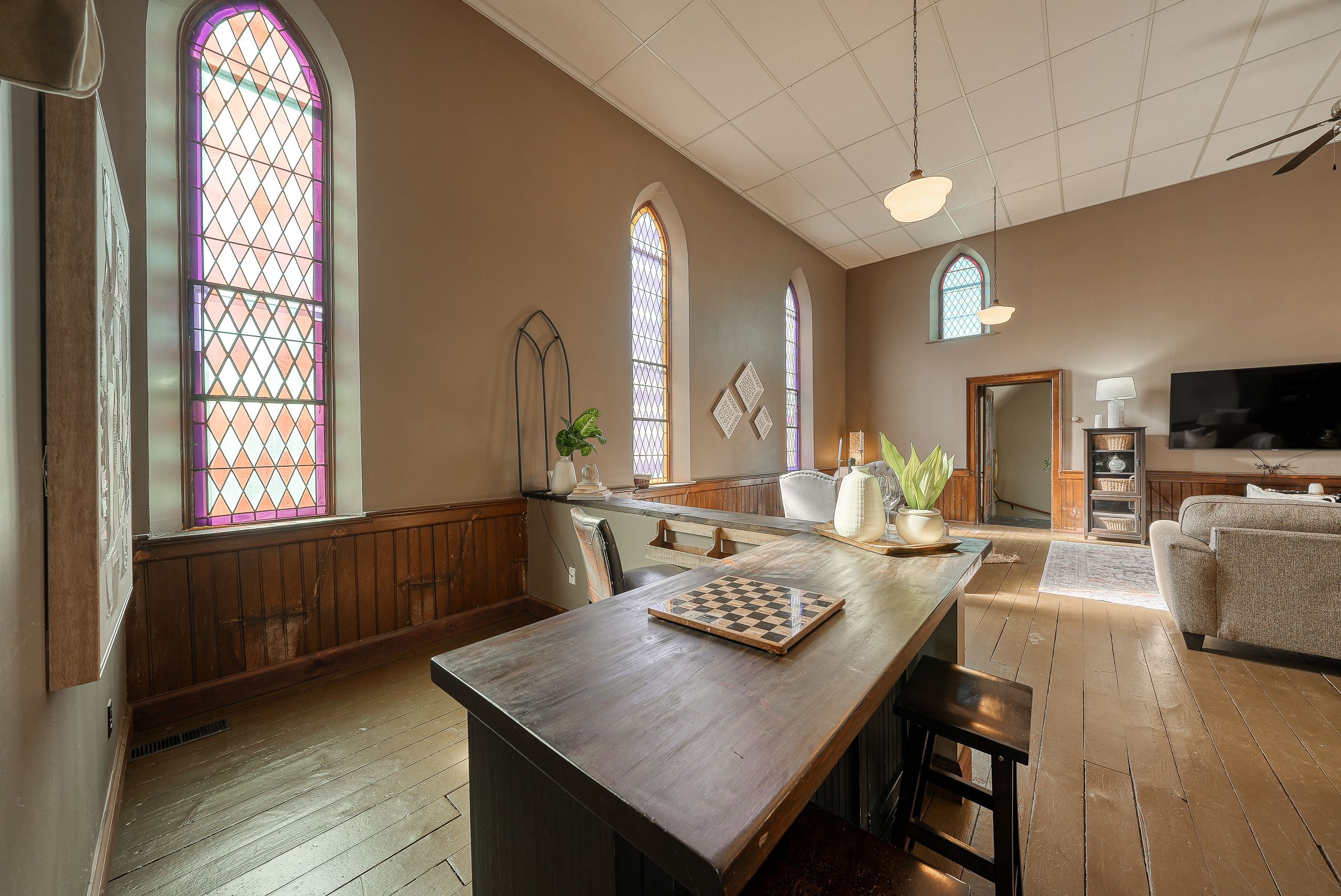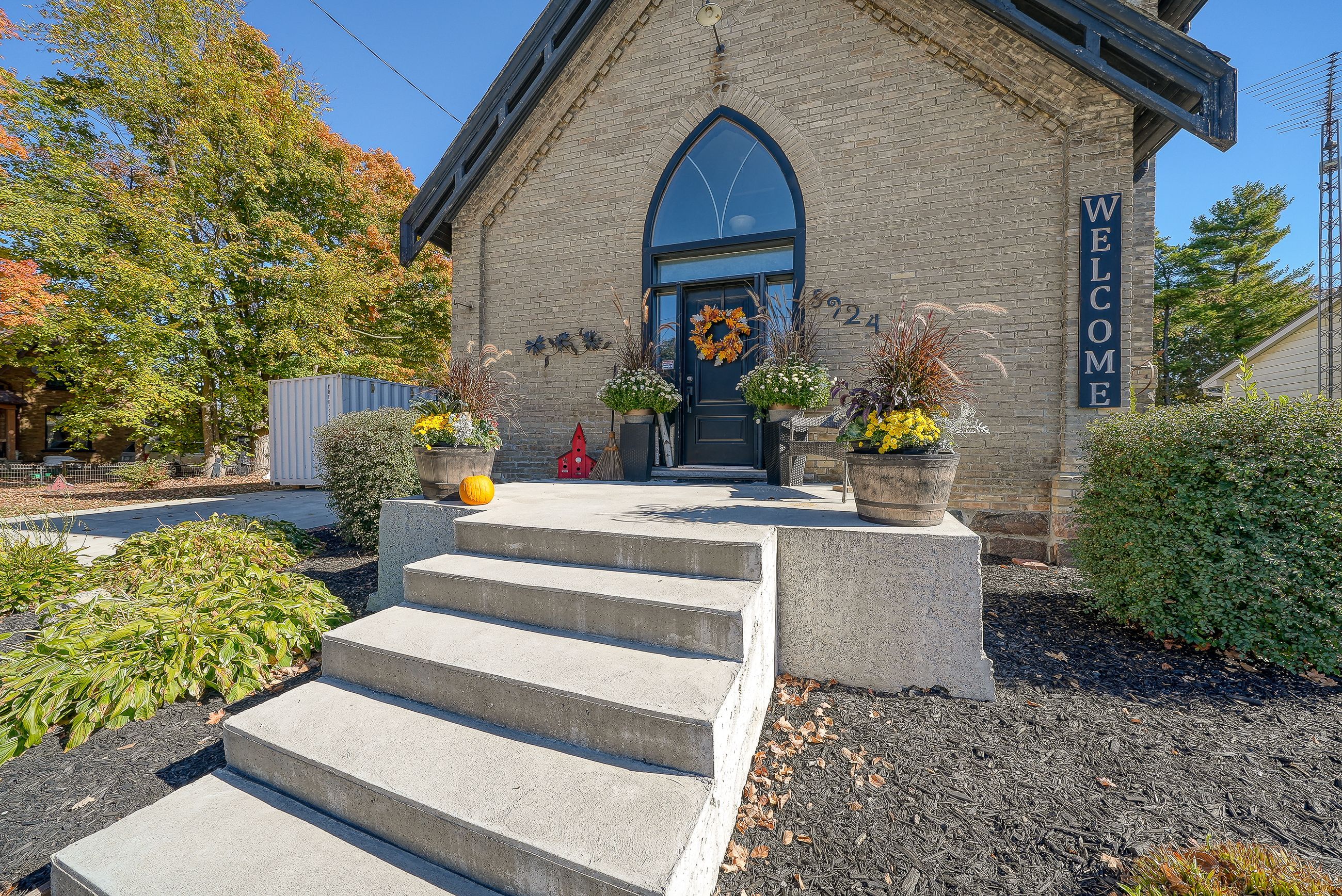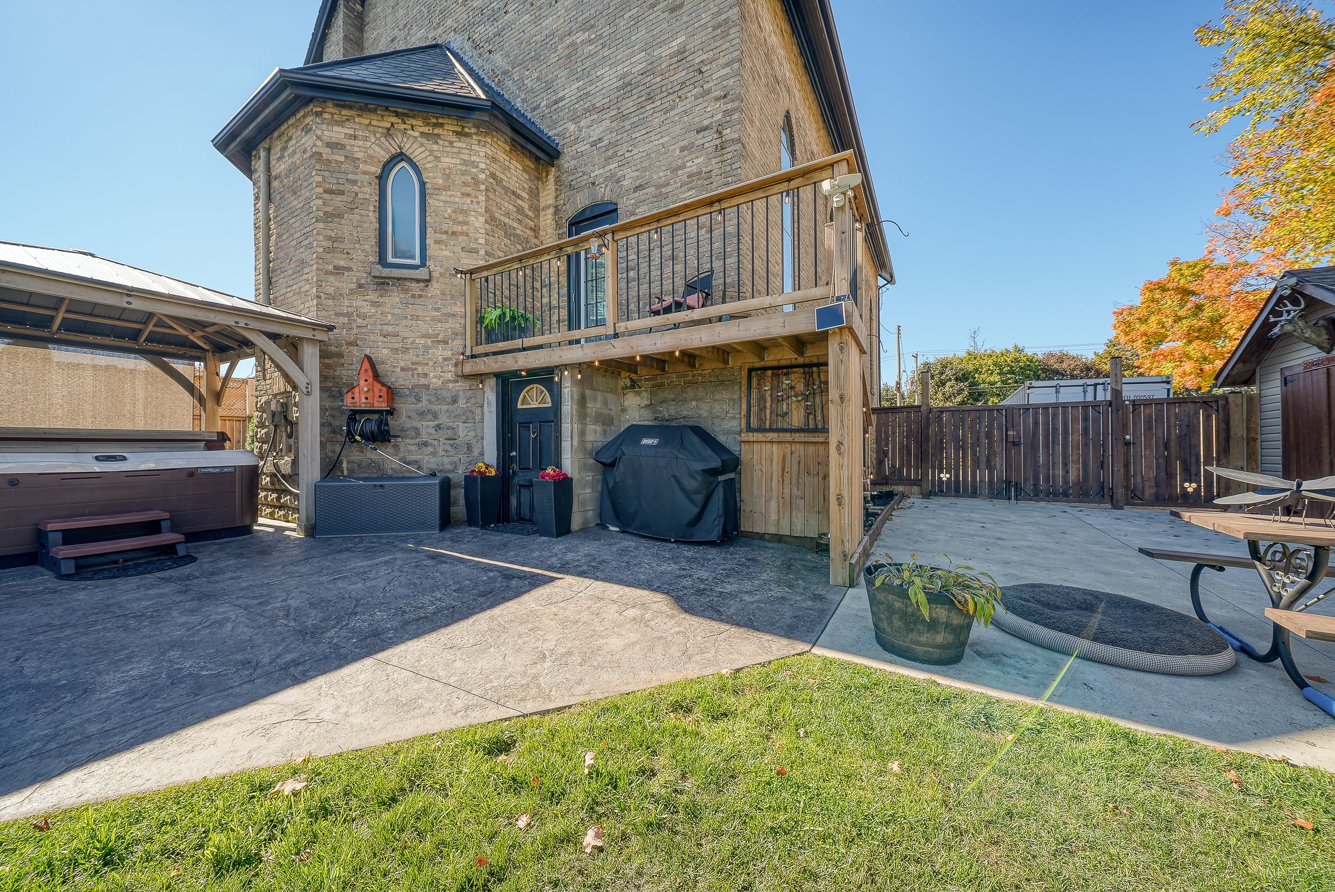Gorgeous character home with historic charm -circa 1890. This impressive former church has been renovated into a residential home, offering over 3300 sq. Ft. Of finished living space across two levels. From its striking curb appeal to its blend of preserved natural finishes and modern updates, this one-of-a-kind property is sure to impress. Step inside to a welcoming front landing leading to the main living area, where you'll find a spacious living room, dining area, and a bar nook perfect for entertaining. The upper level also features two bedrooms, including a primary suite with a walk-in closet and a private walkout to the yard. The four piece bathroom is a very unique, showcasing soaring, cathedral style ceilings that highlight the homes historic character, along with a sunken tub, a truly unique and inviting space. The lower level offers even more versatility with a third bedroom, a recreational room currently used as a billiards area, and a convenient two piece bathroom... An ideal setup for extended family or guests. Original architectural details, including solid wood doors, stained glass windows, slate roof.. All enhance this homes rich heritage. Numerous updates over the years completed to accommodate modern day conveniences: gas furnace, air conditoning, wiring, plumbing, double hung windows in lower level, water treatment devices, and most recent its own water source-a new drilled well. Outdoors, enjoy your own private backyard oasis featuring a hot tub covered by a gazebo, fire pit area, above ground pool, shed with hydro, and a fully fenced yard... Perfect for relaxing or entertaining year round. Whether you're looking for a unique family home or a multi level generational living opportunity with separate entrances, this exceptional property delivers character, comfort, and endless possibilities. All measurements taken from public record and iguide.