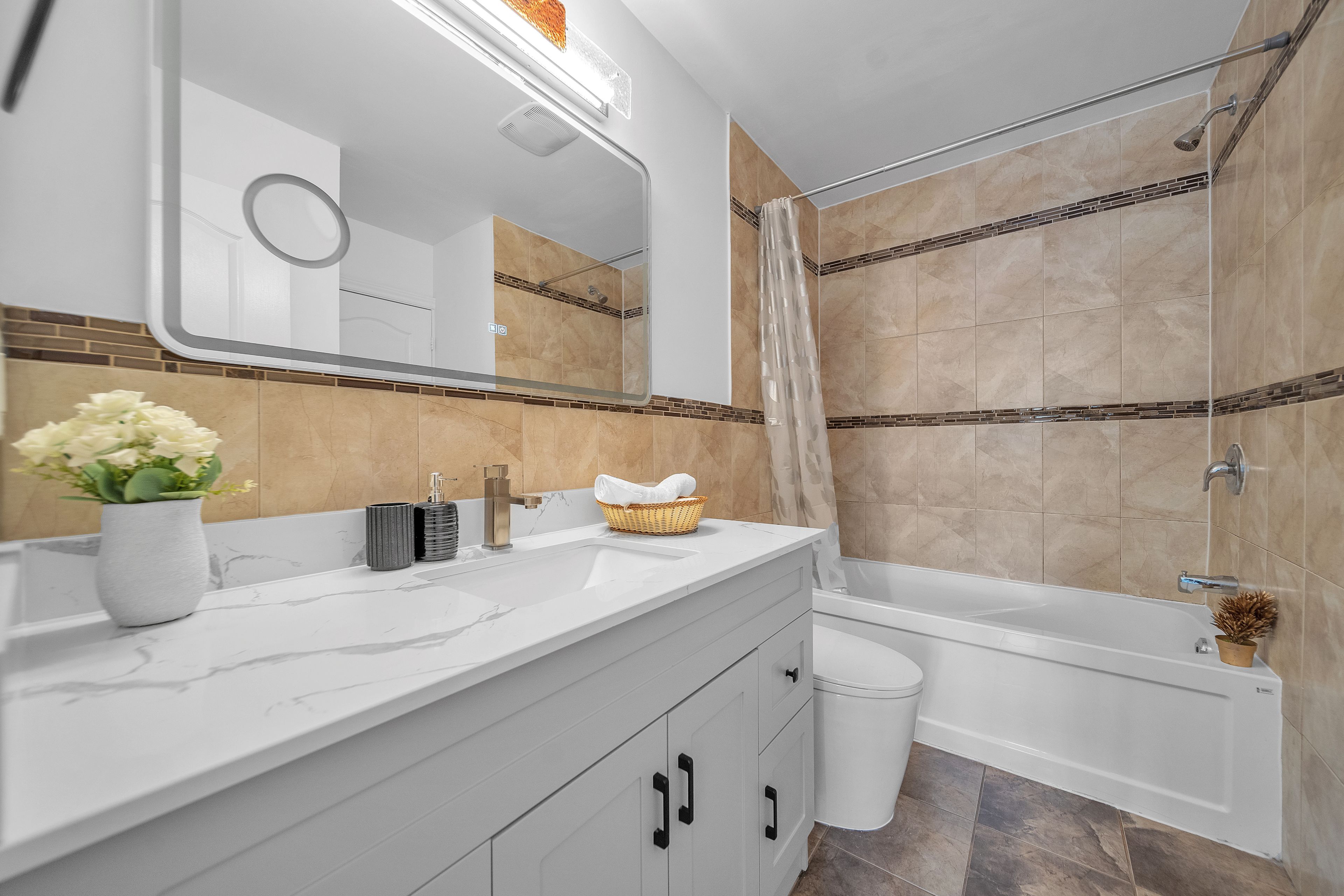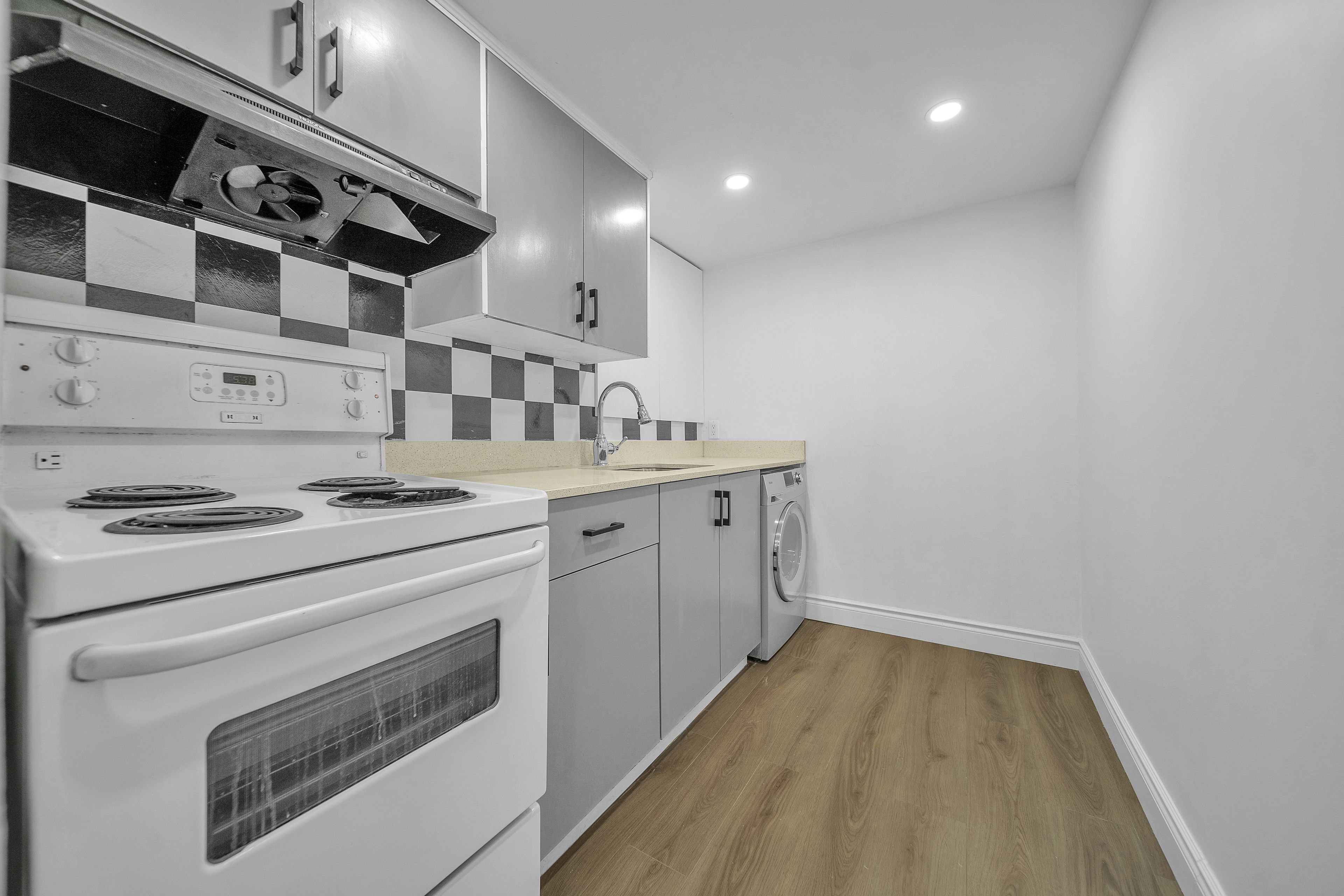 • Modern kitchen with stainless steel appliances and ample cabinet space.