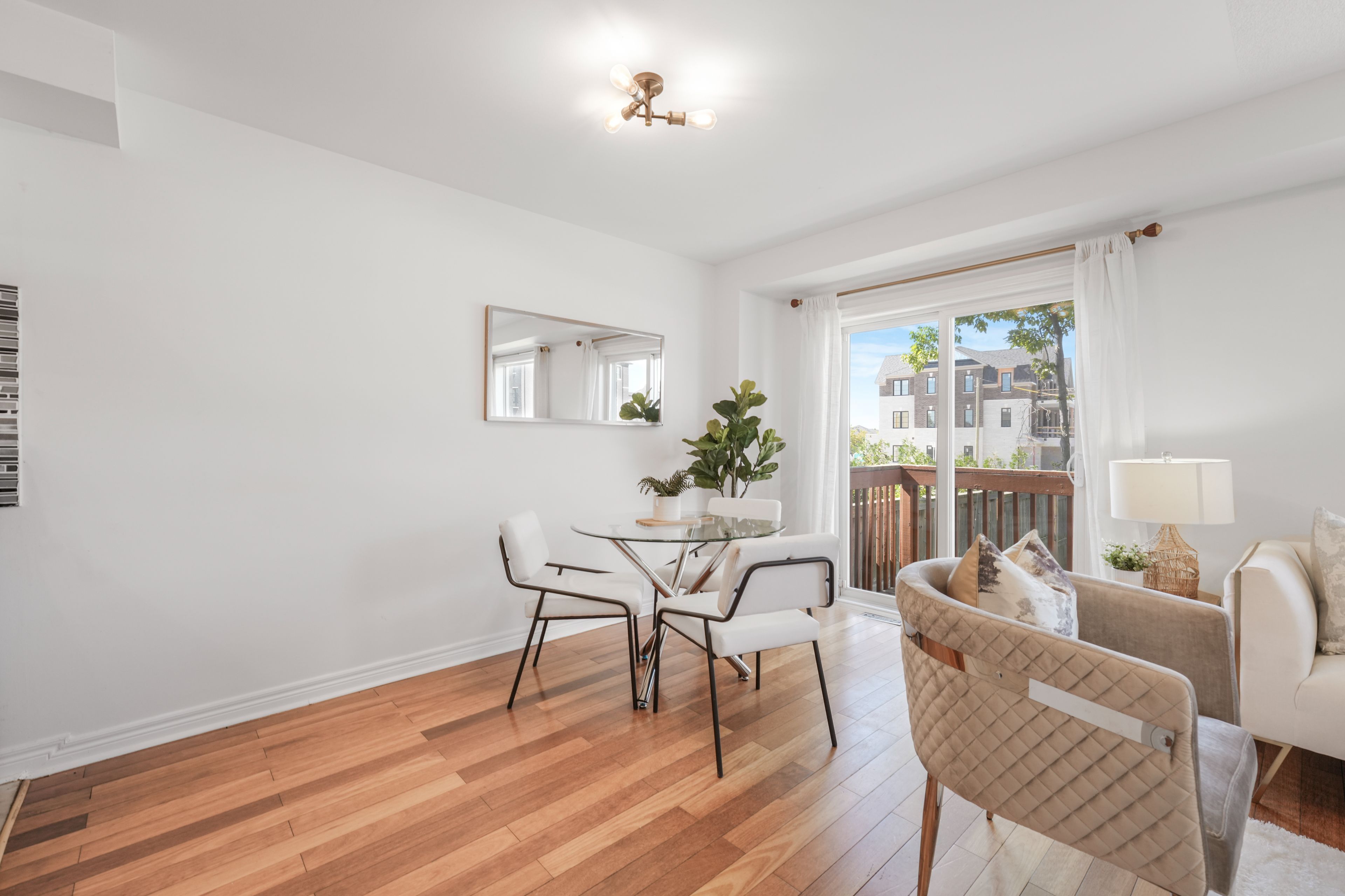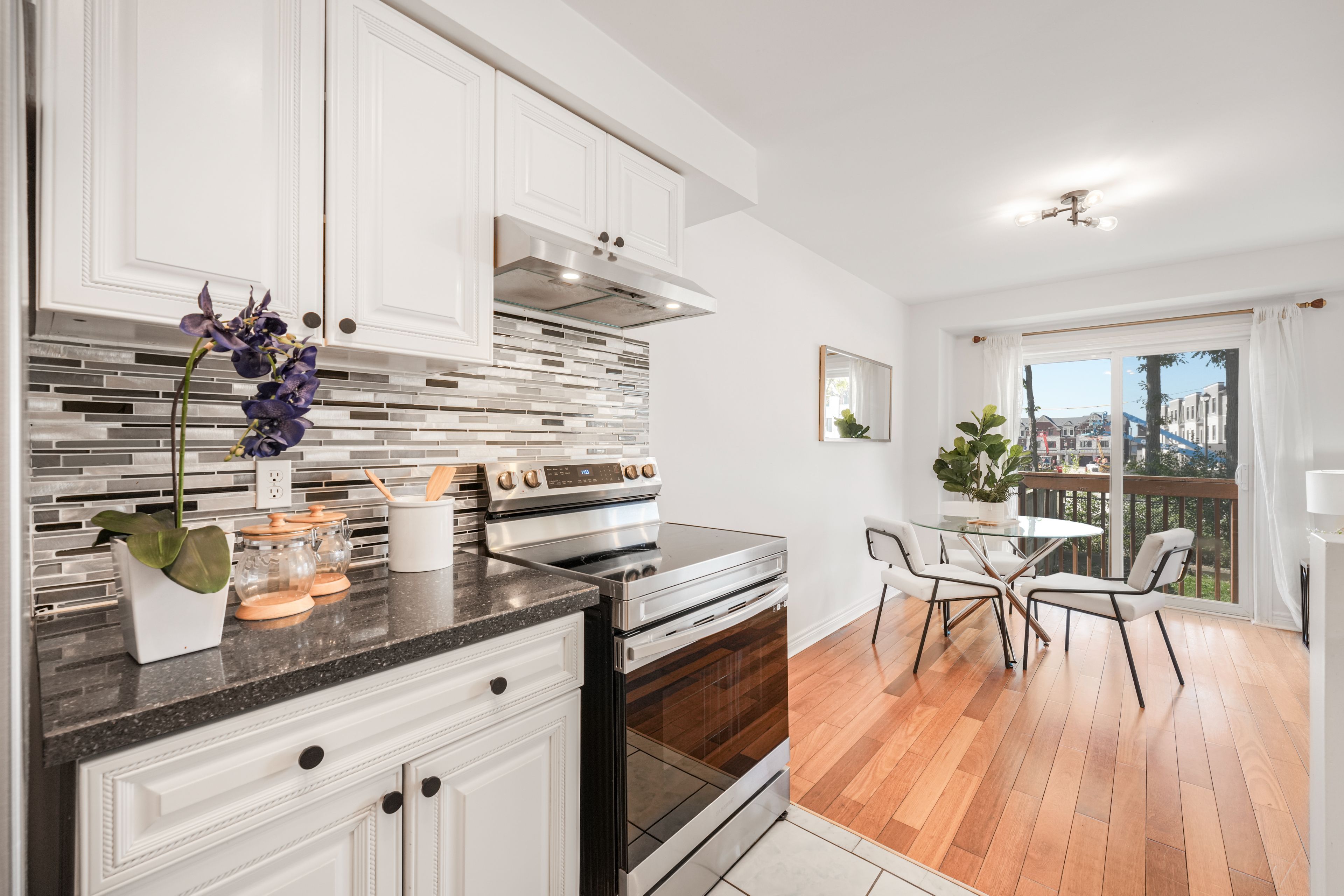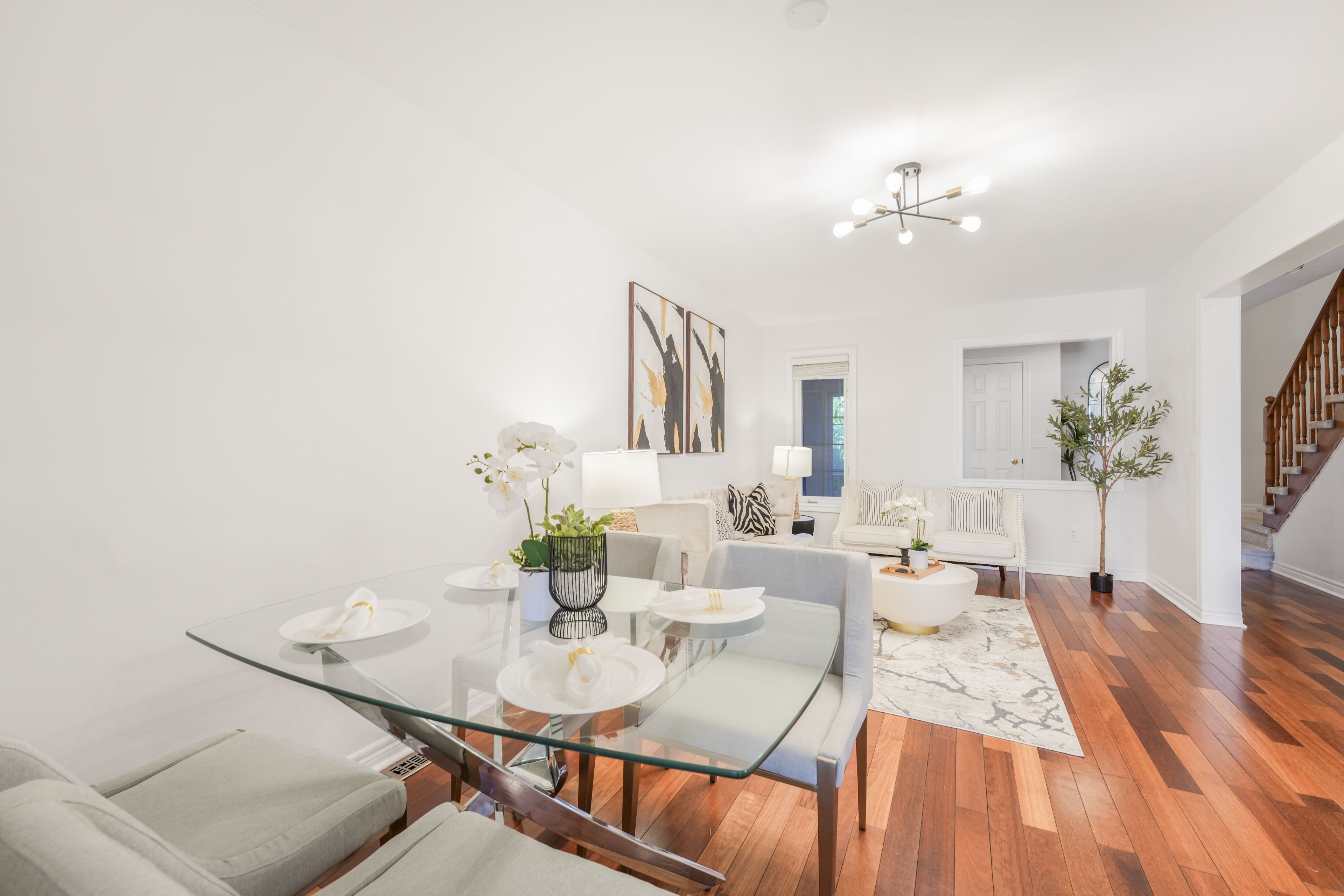 • Bright open-concept layout with spacious living-dining areas and hardwood flooring.