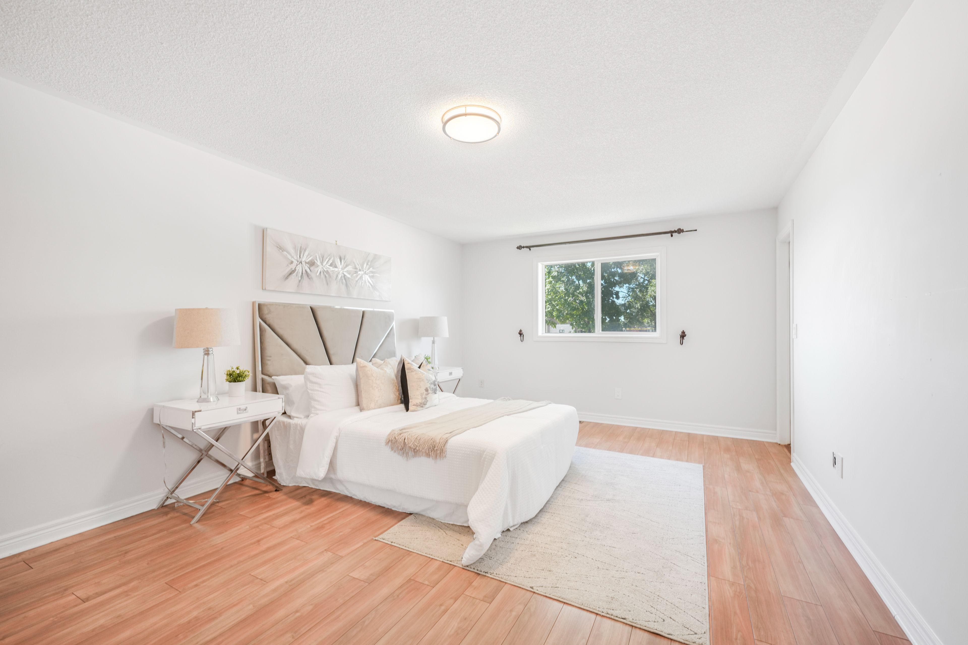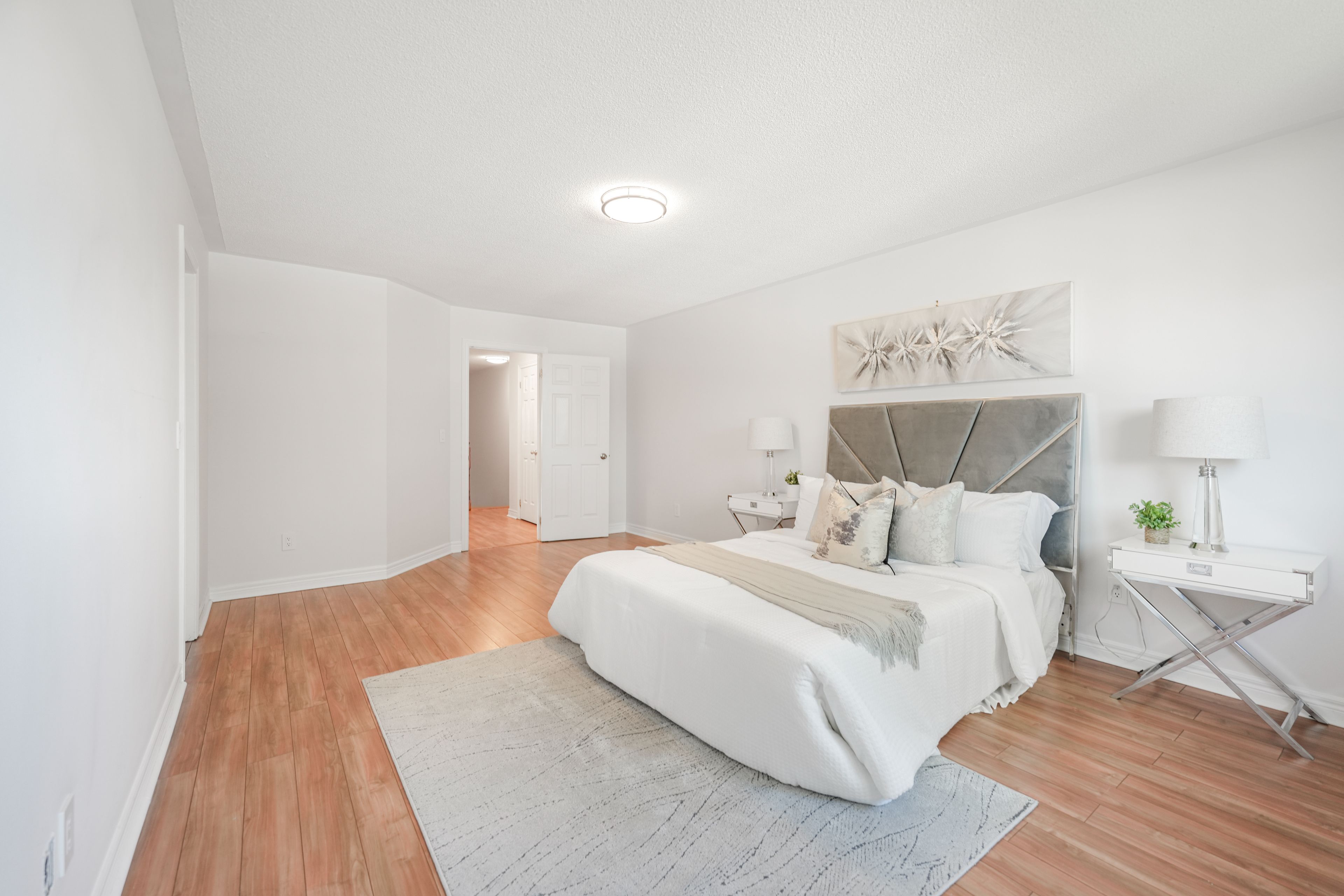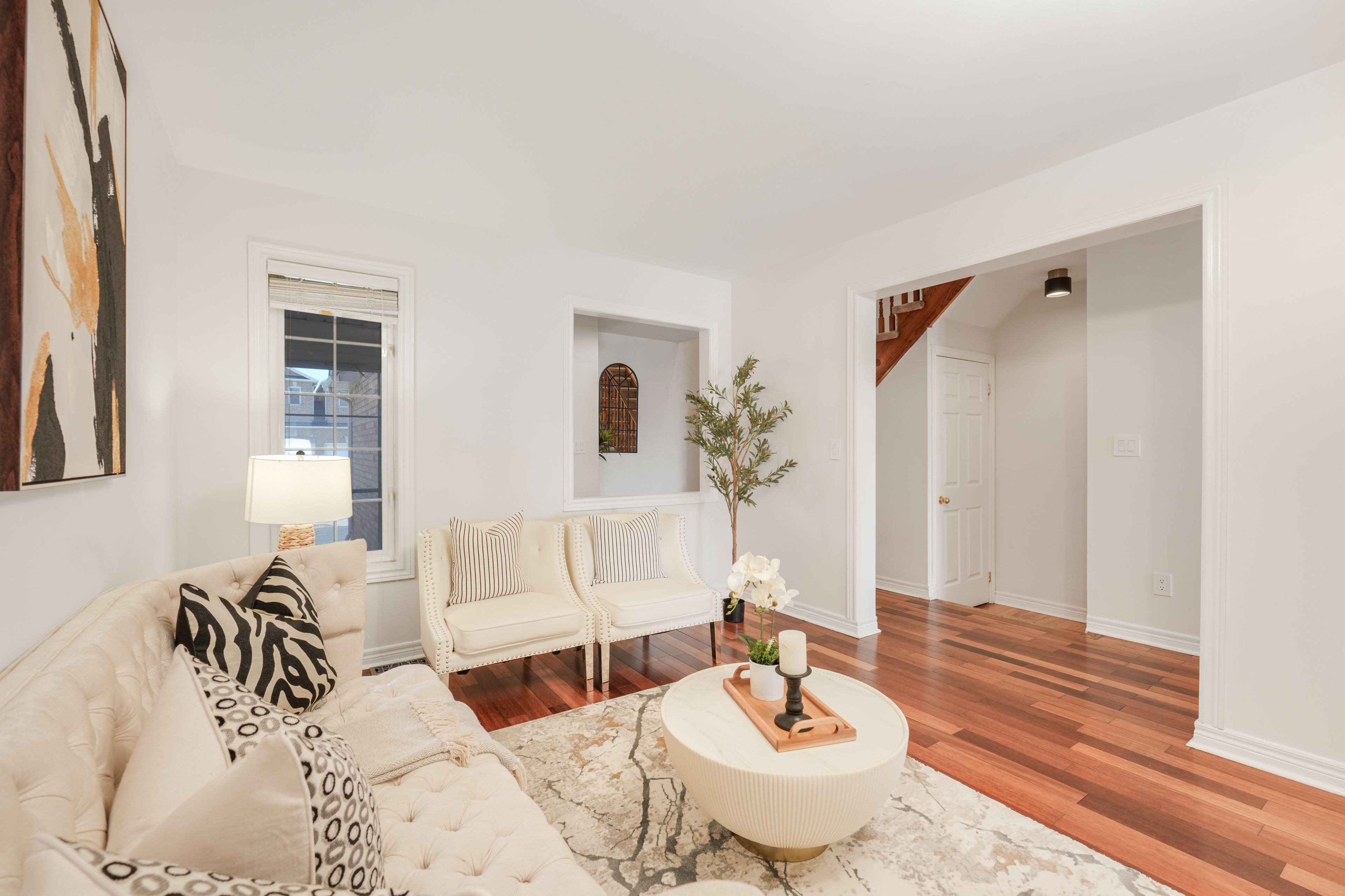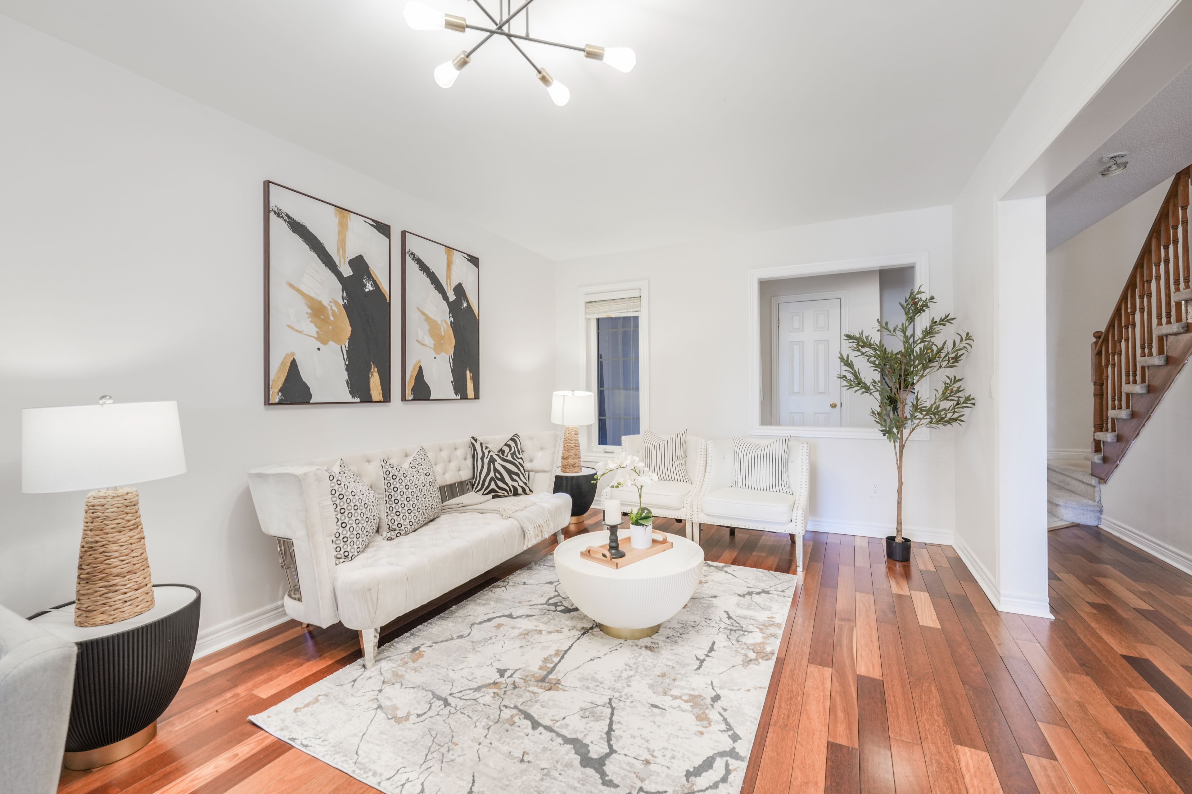 • Bright open-concept layout with spacious living-dining areas and hardwood flooring.