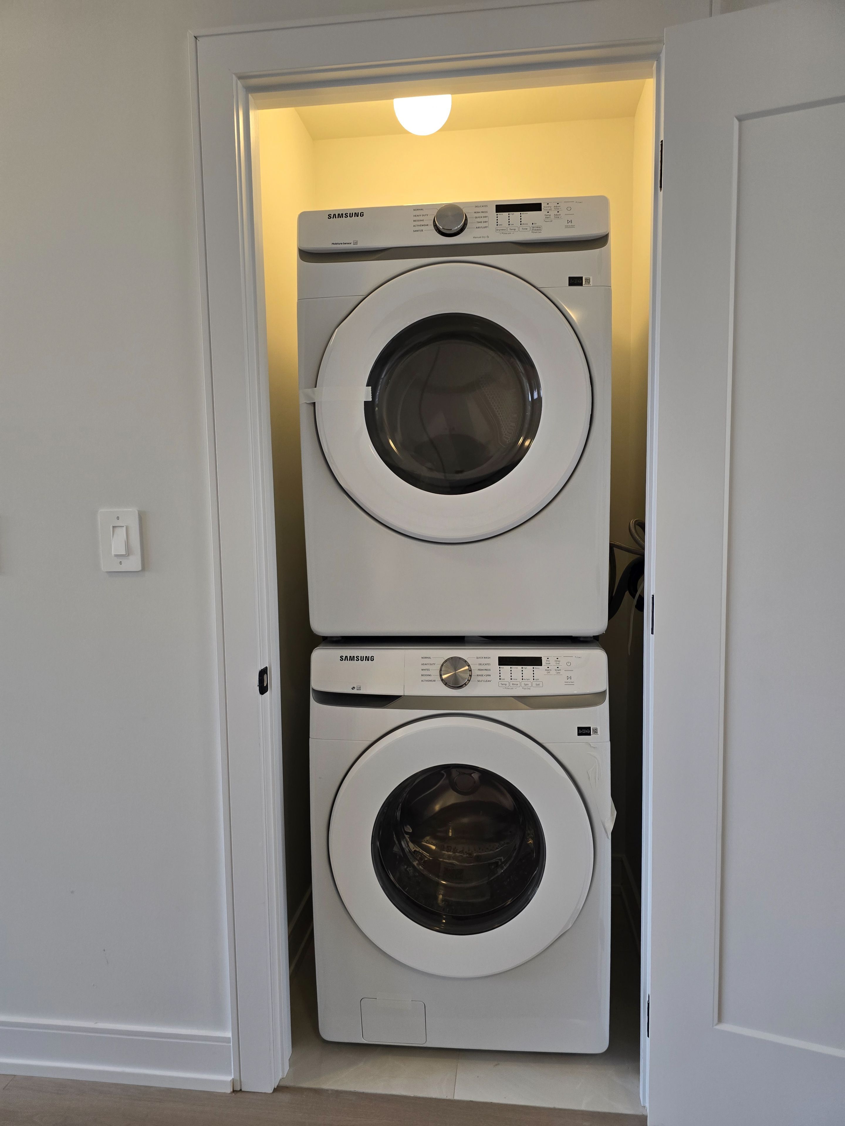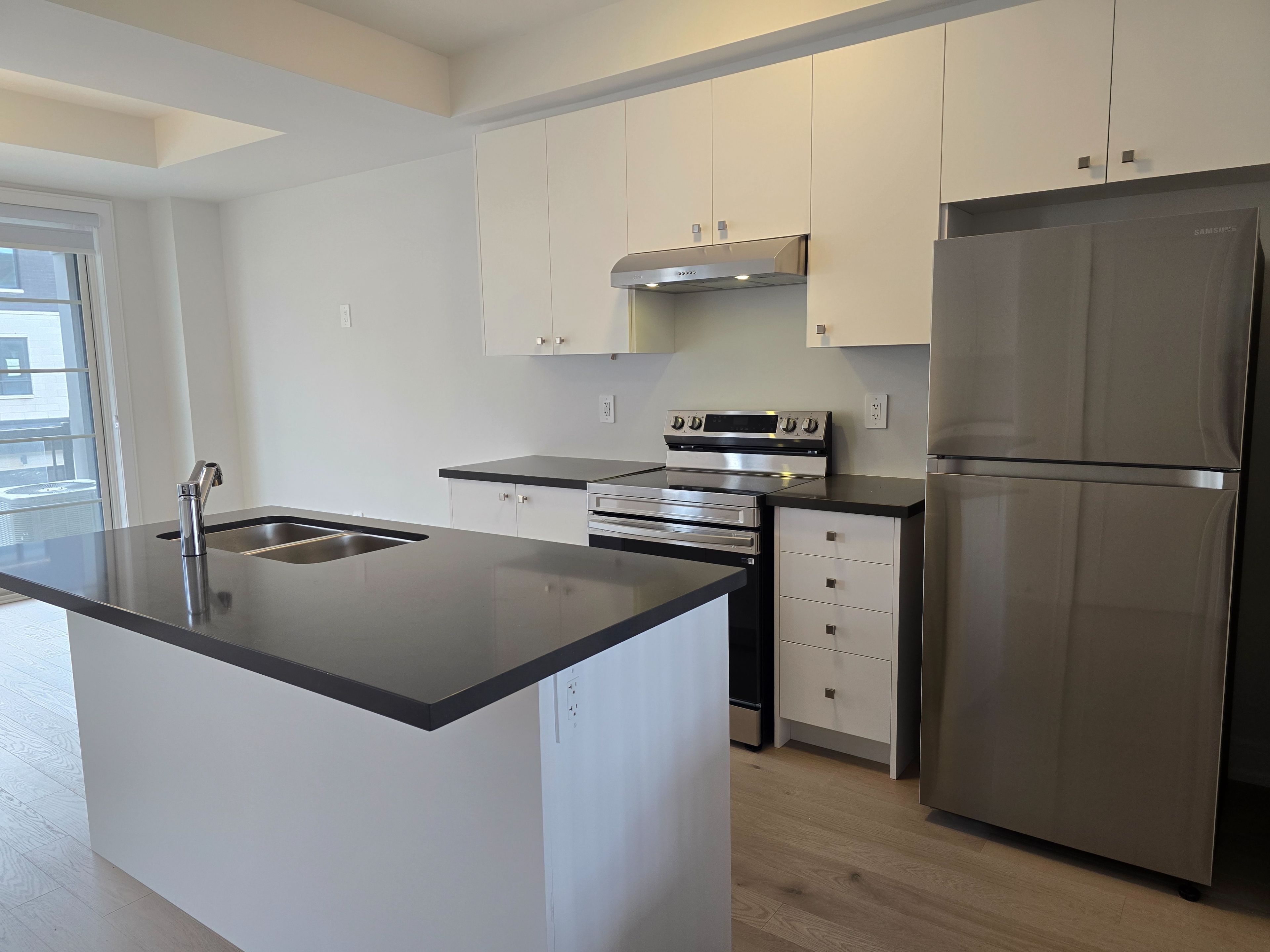 • Sleek contemporary kitchen with quartz countertops and upgraded fixtures.