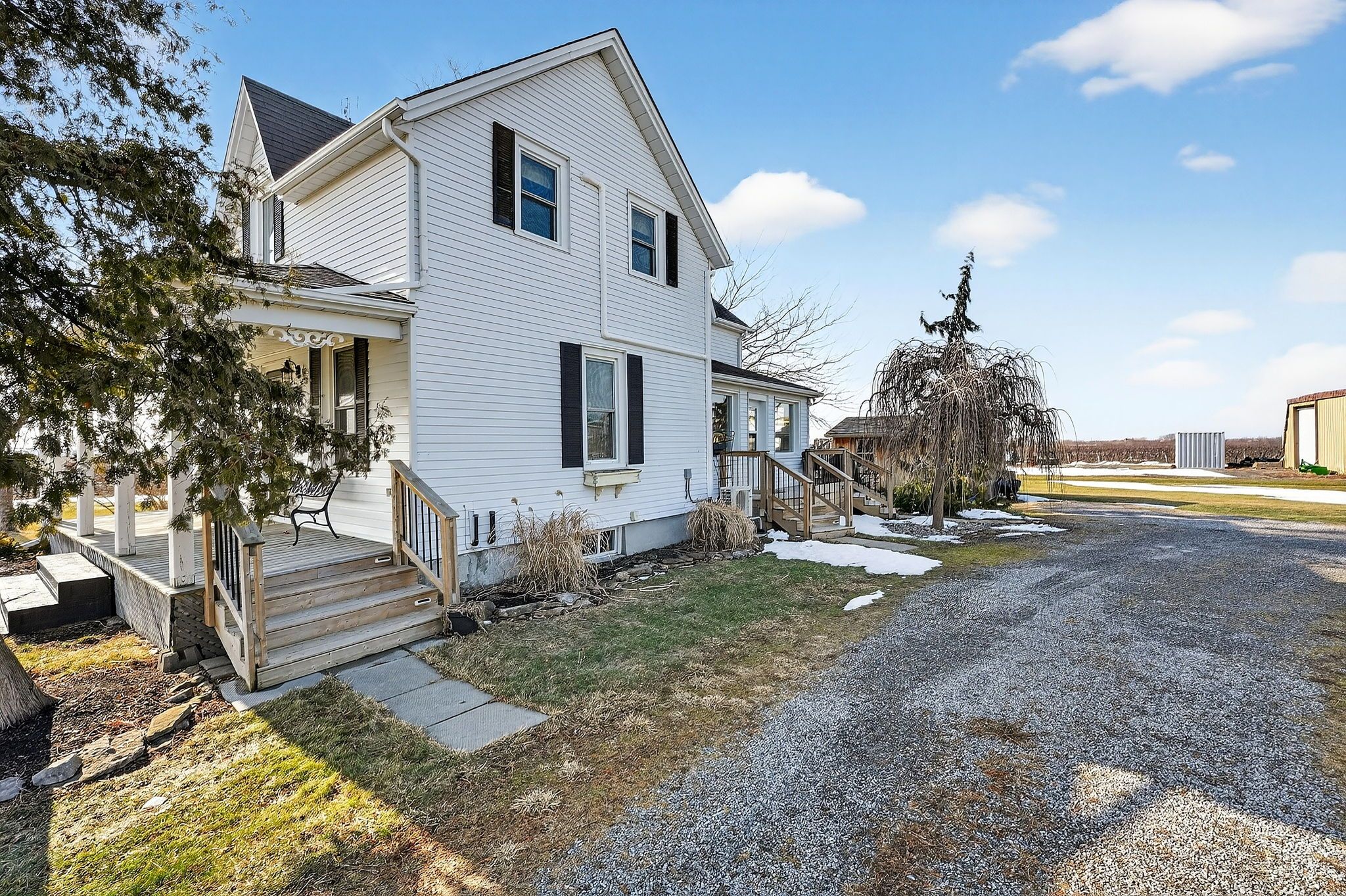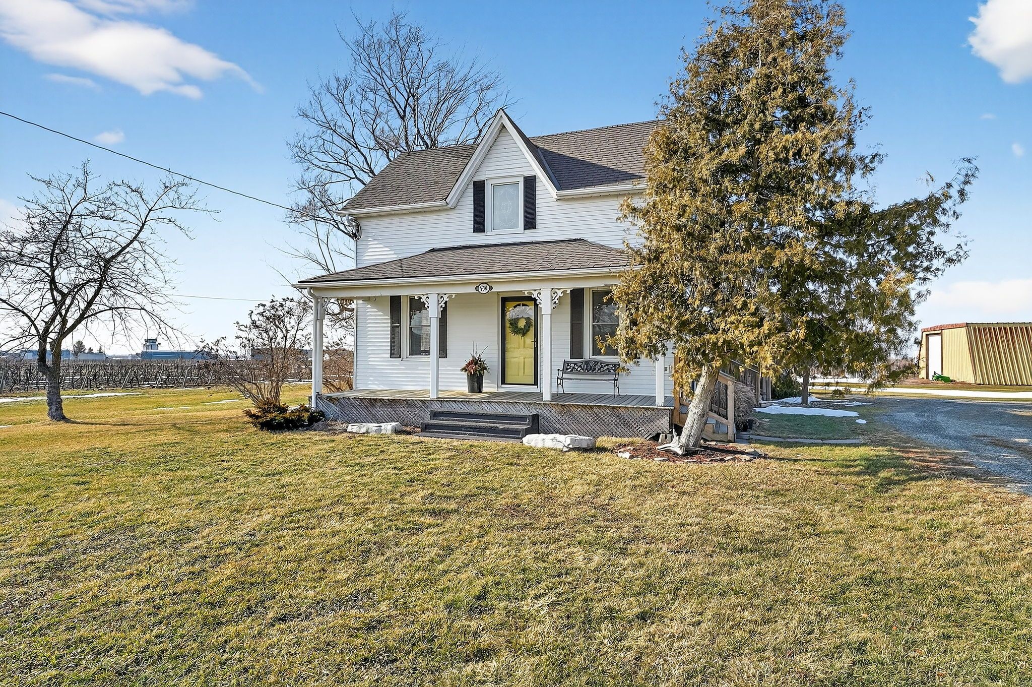 Beautifully maintained century home on approximately 1 acre property in rural niagara-on-the-lake! In the same family for several generations, this home features a welcoming covered front porch on which to enjoy morning sunrises or relax in the evening with a glass of local wine from southbrook organic wines, right across the street! Fantastic main floor layout, ideal for entertaining! Enter into the sunroom off the driveway with plenty of storage for coats/shoes. Gorgeous period door with stain glass feature. Bright and spacious eat-in kitchen with oversized centre island, plenty of cupboards and counter space and gleaming stainless steel appliances. Formal living room as well as relaxed family room off of kitchen, separated by tasteful barn door that opens the space or closes for privacy. Laundry/mud room located at the back of the house off the large deck, which is complete with extra privacy fencing and ideal for dining al fresco spring, summer and fall. Convenient 2-piece bath located in the laundry room with barn door for privacy. Upstairs you will find three spacious bedrooms, all with stunning views all around! The primary bedroom has a large walk-in closet with built-in shelving and has hardwood floors. The other bedrooms are also a very good size, great for family or guests. The landing offers a comfortable nook ideal as office space or quiet reading/study area. Large 4-piece family bath completes the upstairs. The basement is spacious and unfinished. Great additional space could be finished for whatever purpose required. Large horseshoe-shaped driveway, makes it easy to get in and out. Detached double car garage with hydro and extra storage space. Cutes she-shed would be a great craft or office space as well. Fantastic sunrises and stunning sunsets, this period home is at a great price point for families looking to move to niagara-on-the-lake! Down road from 2 elementary schools. 10 min drive to old town. 2 mins drive to qew. Call for a showing today!