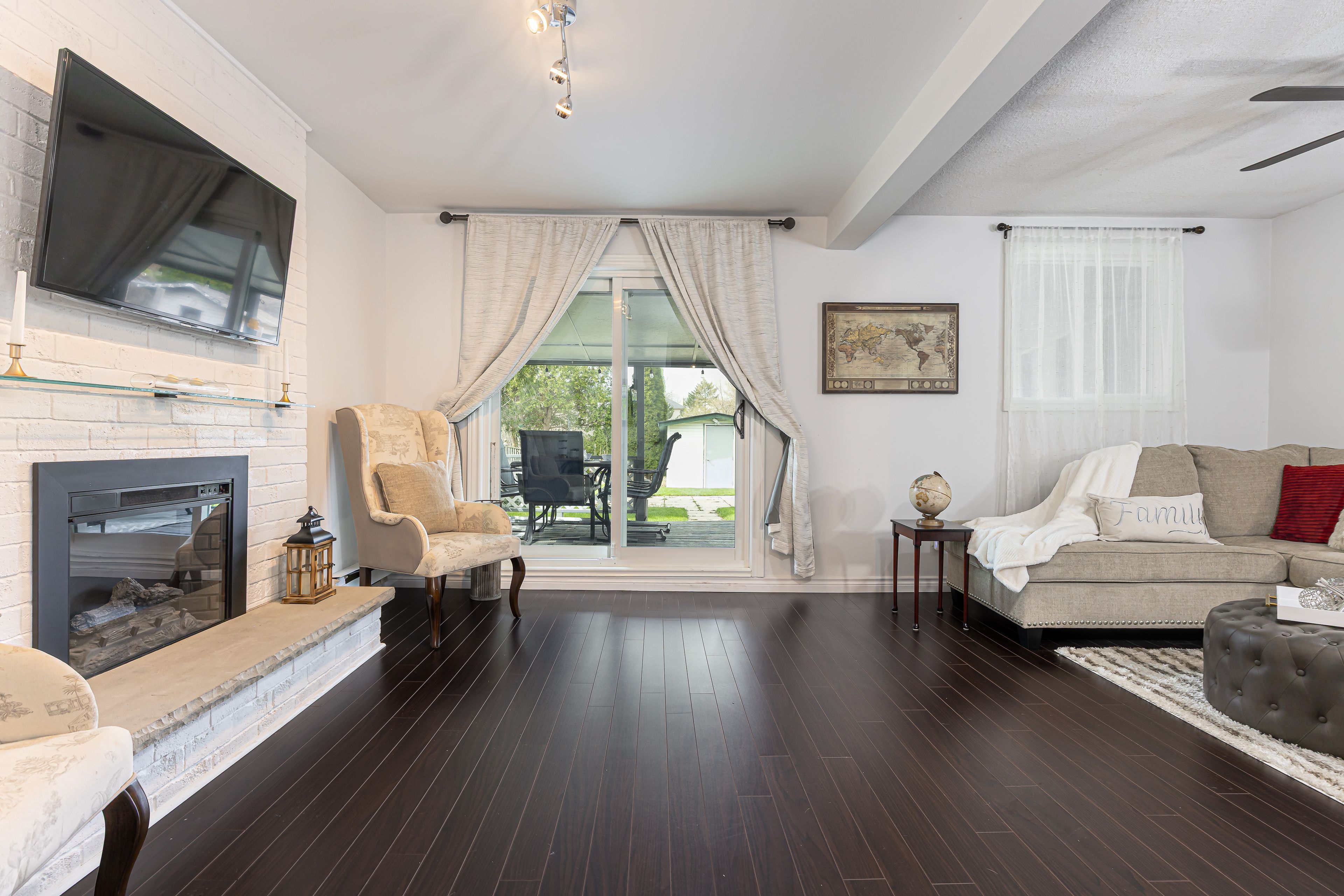 • Spacious family room features an electric fireplace for a cozy ambiance.