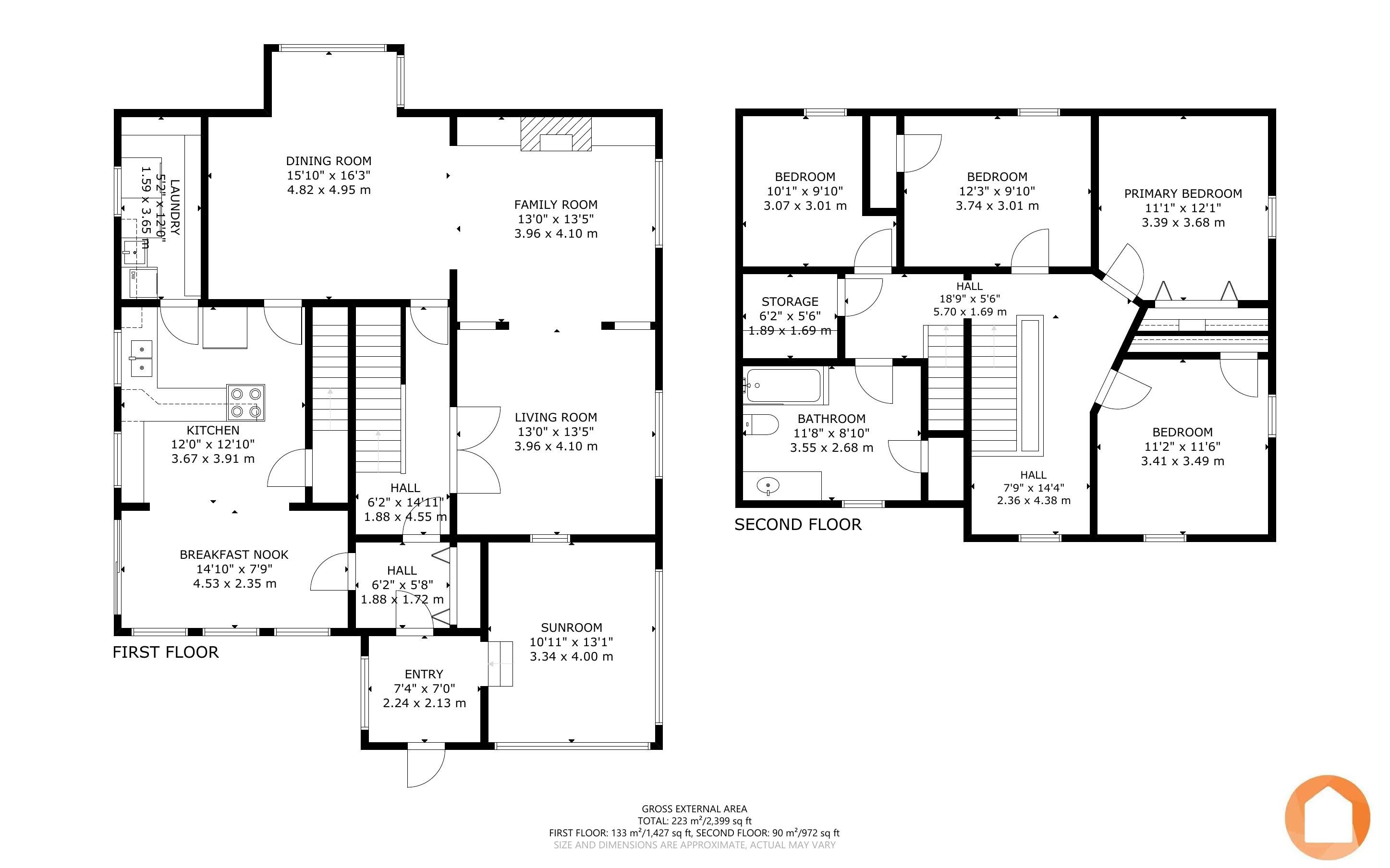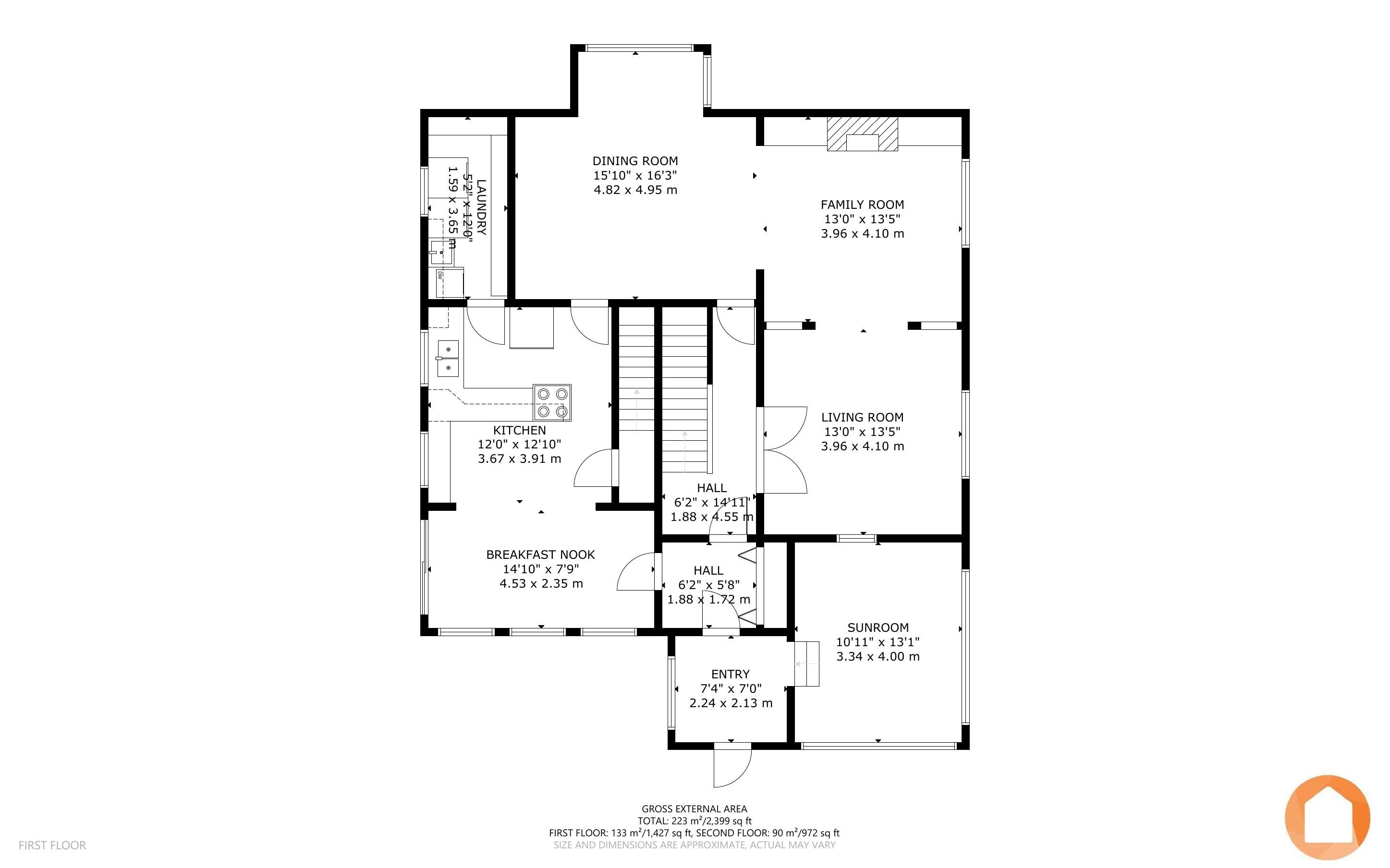 • Versatile spaces with a sunroom, multiple living areas, and two staircases.