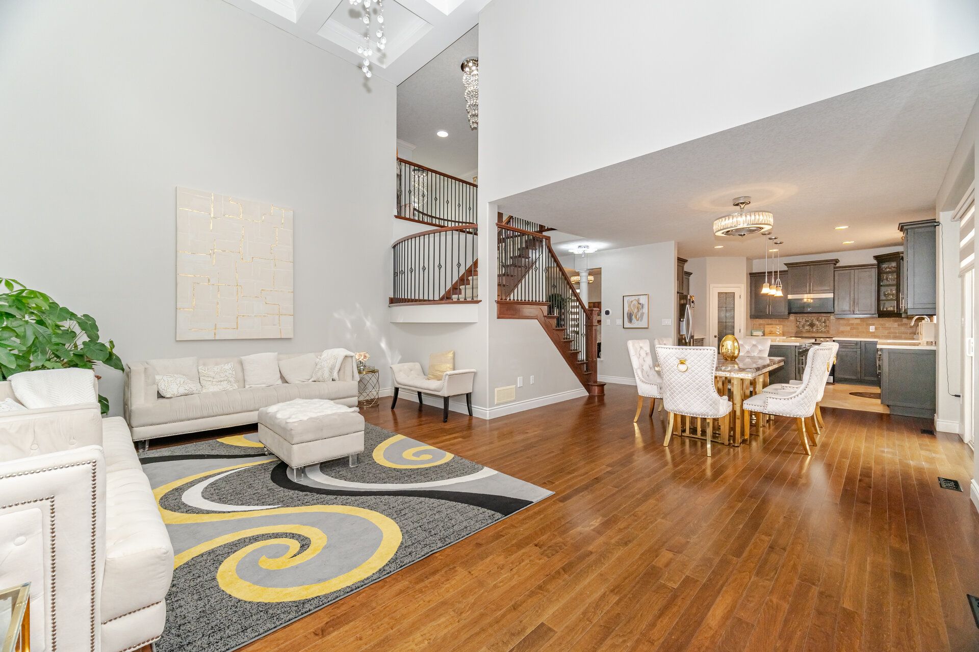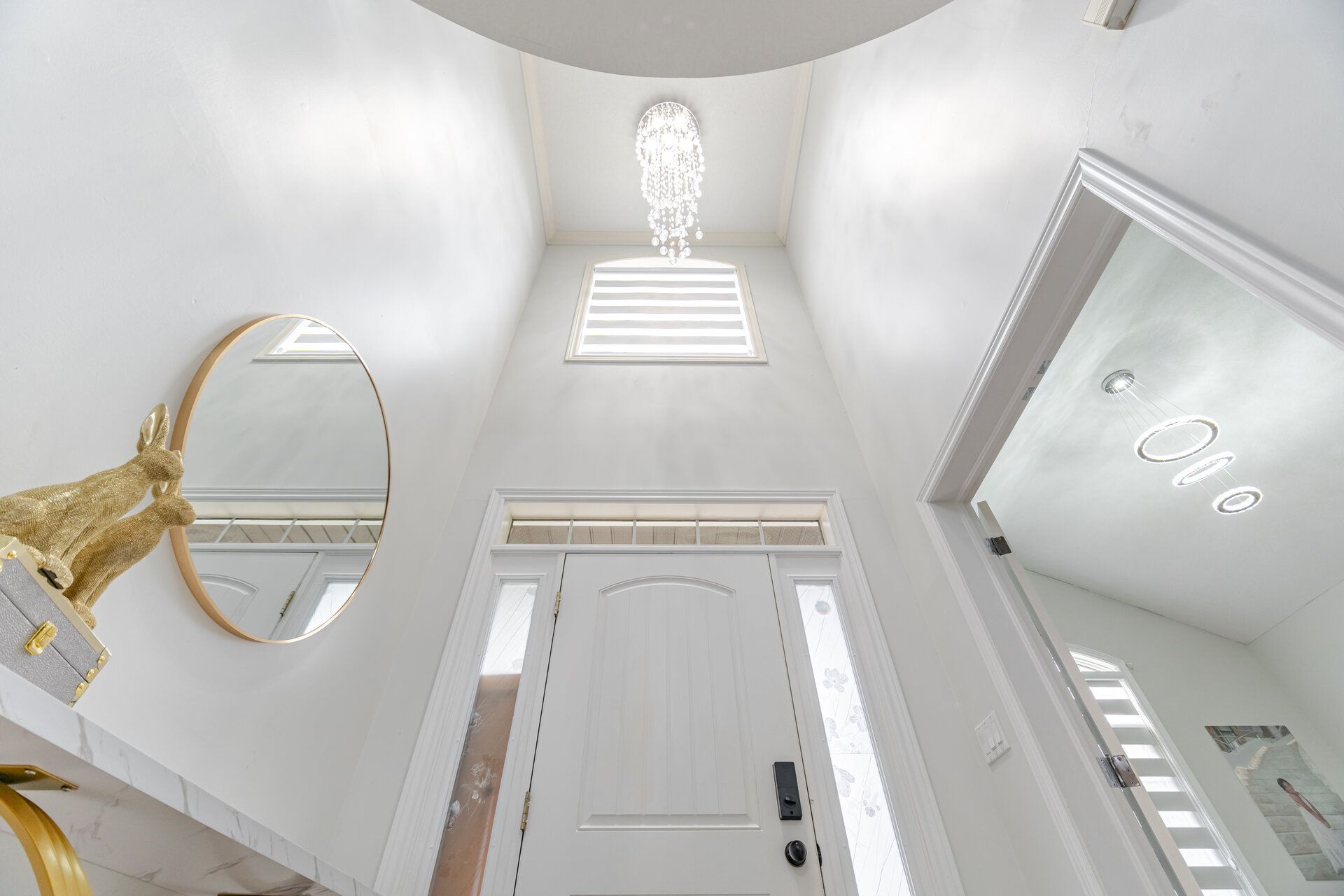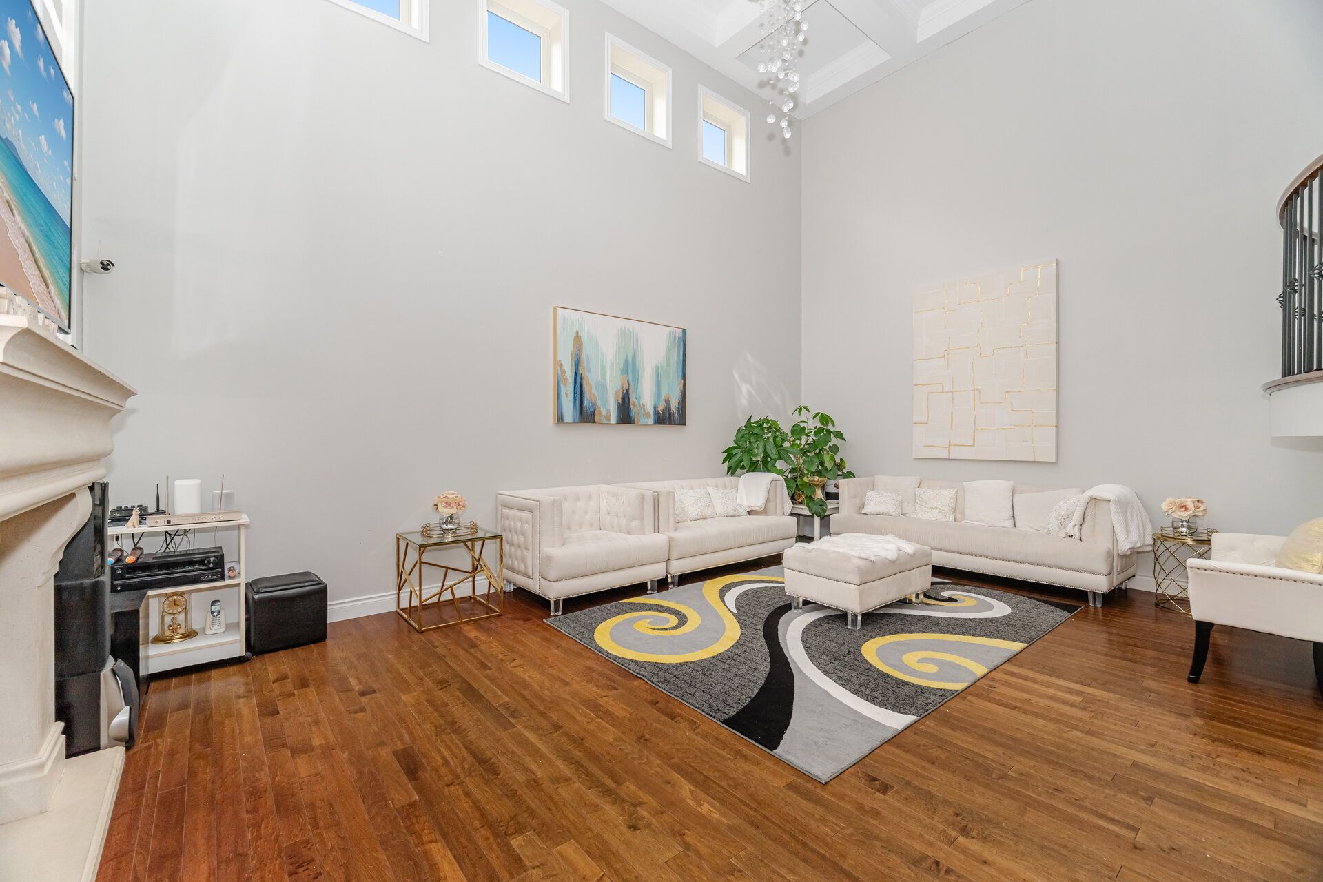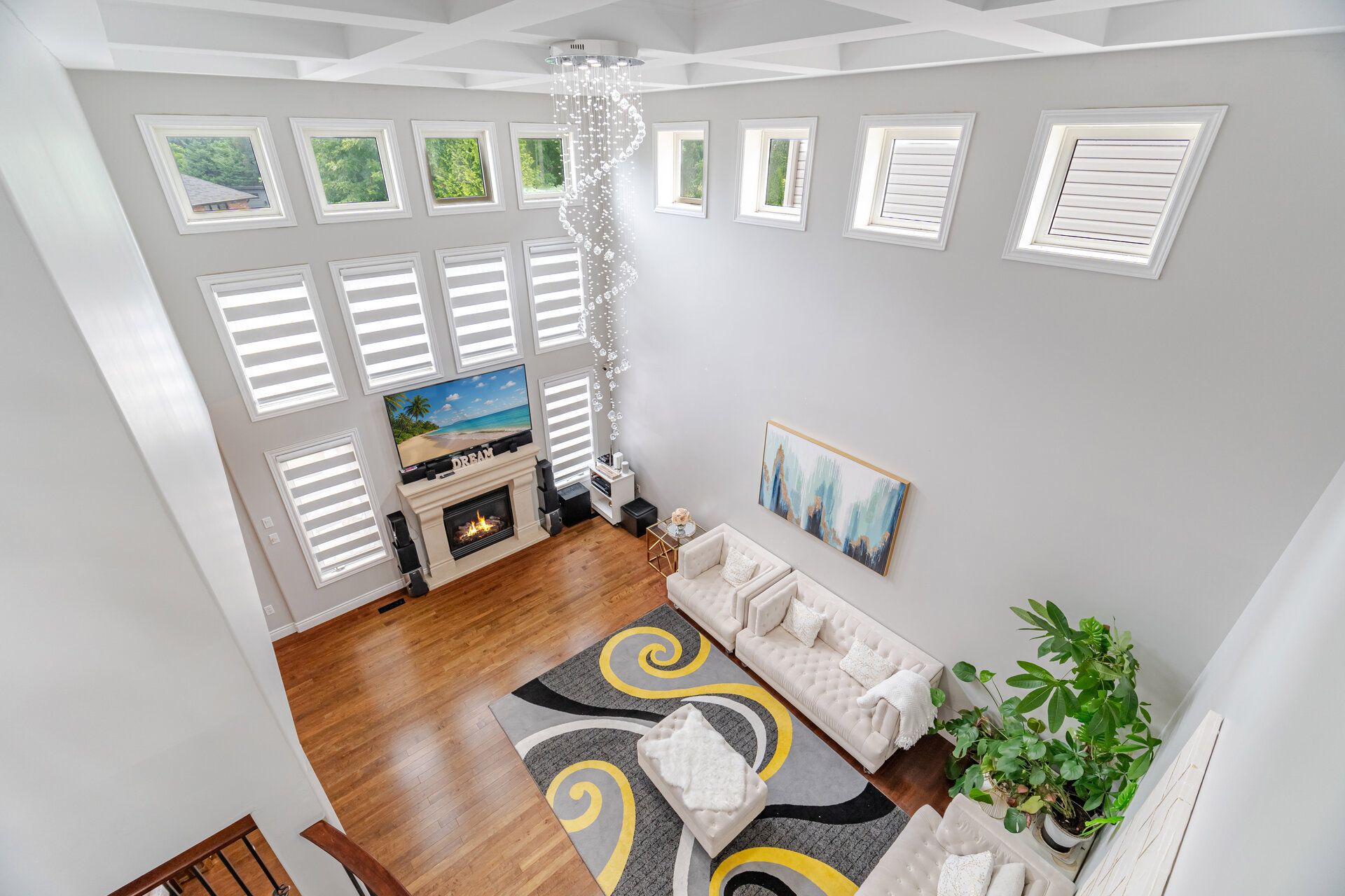 • Open-concept main level with dramatic 18-ft ceiling and large windows.