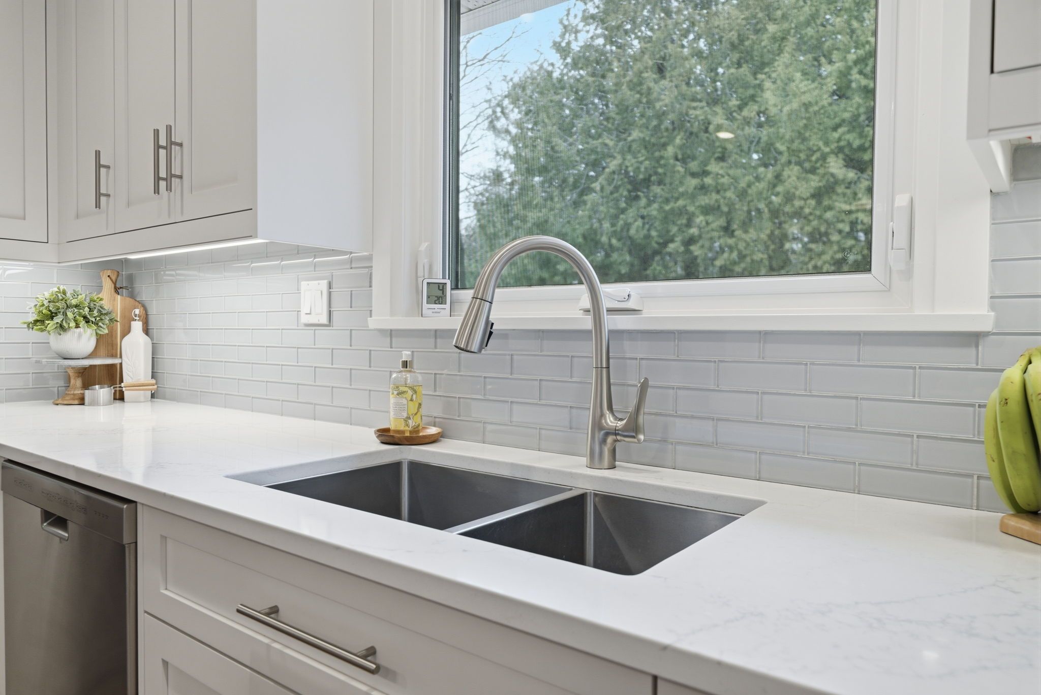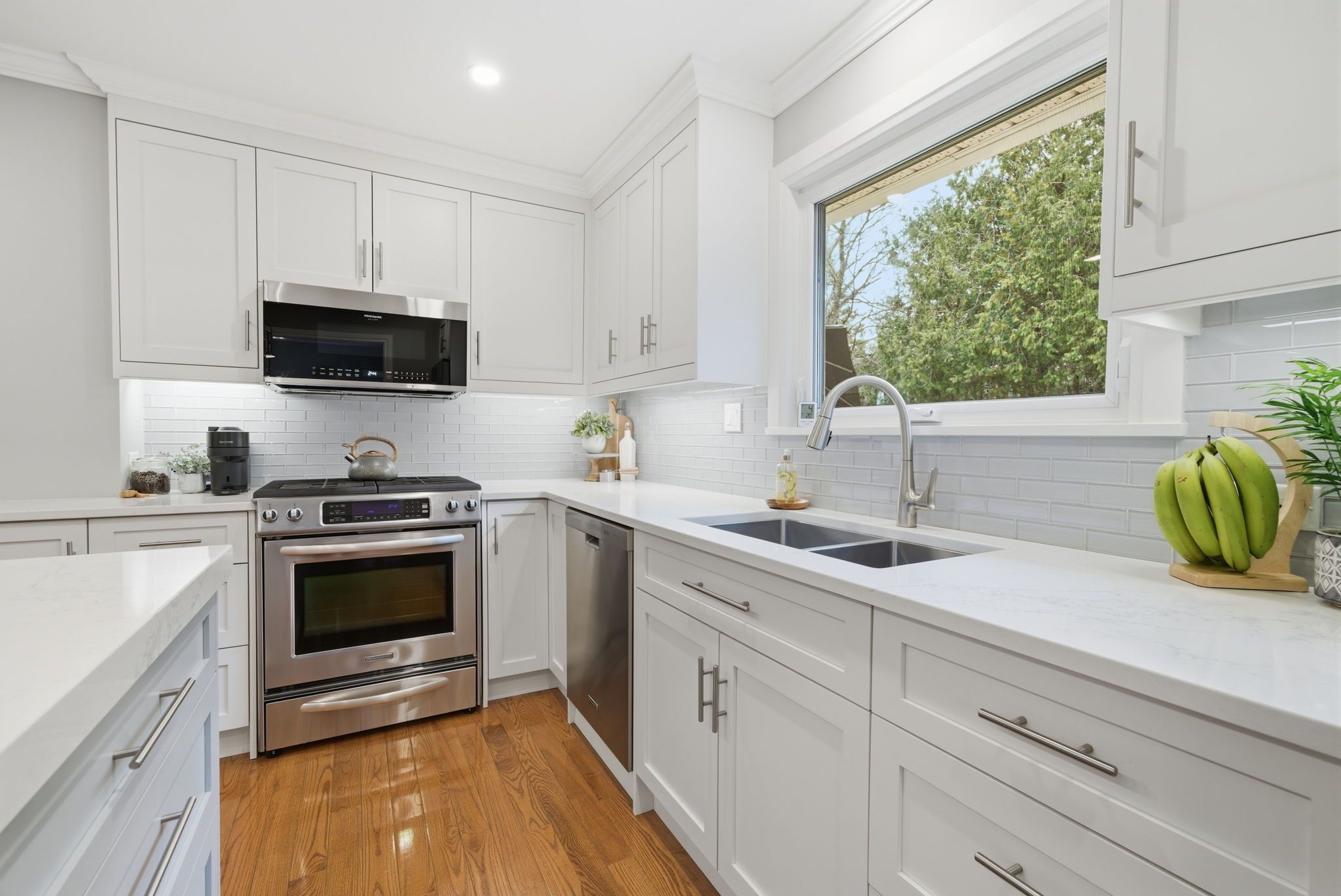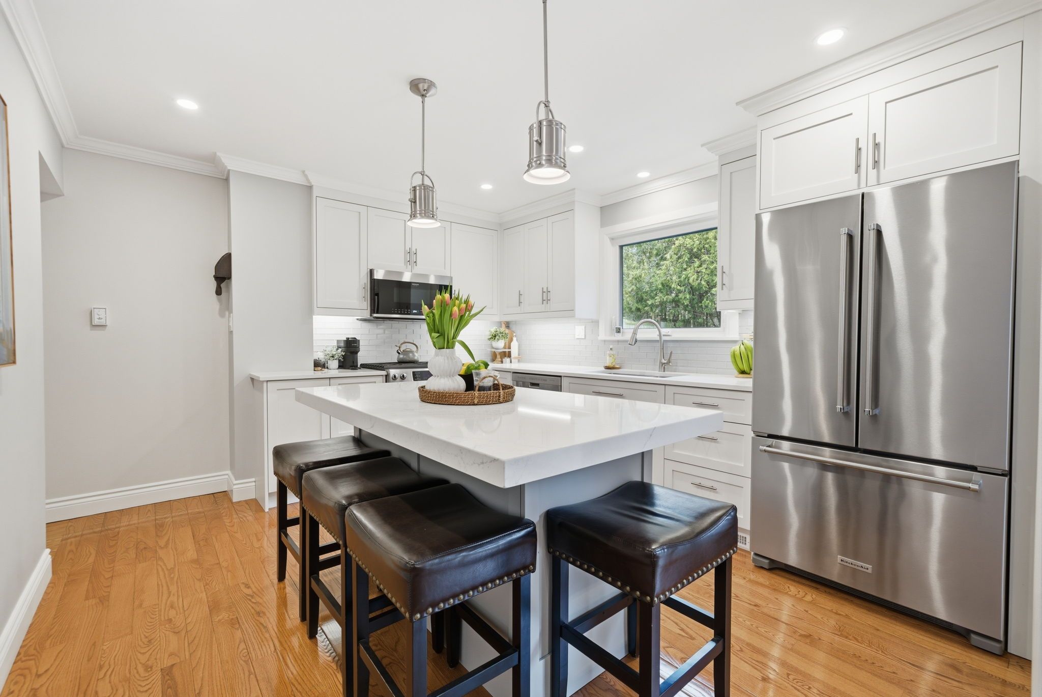 • Bright kitchen with quartz countertops and custom features.