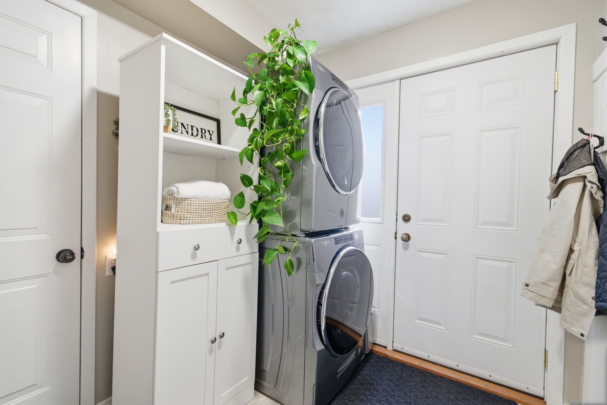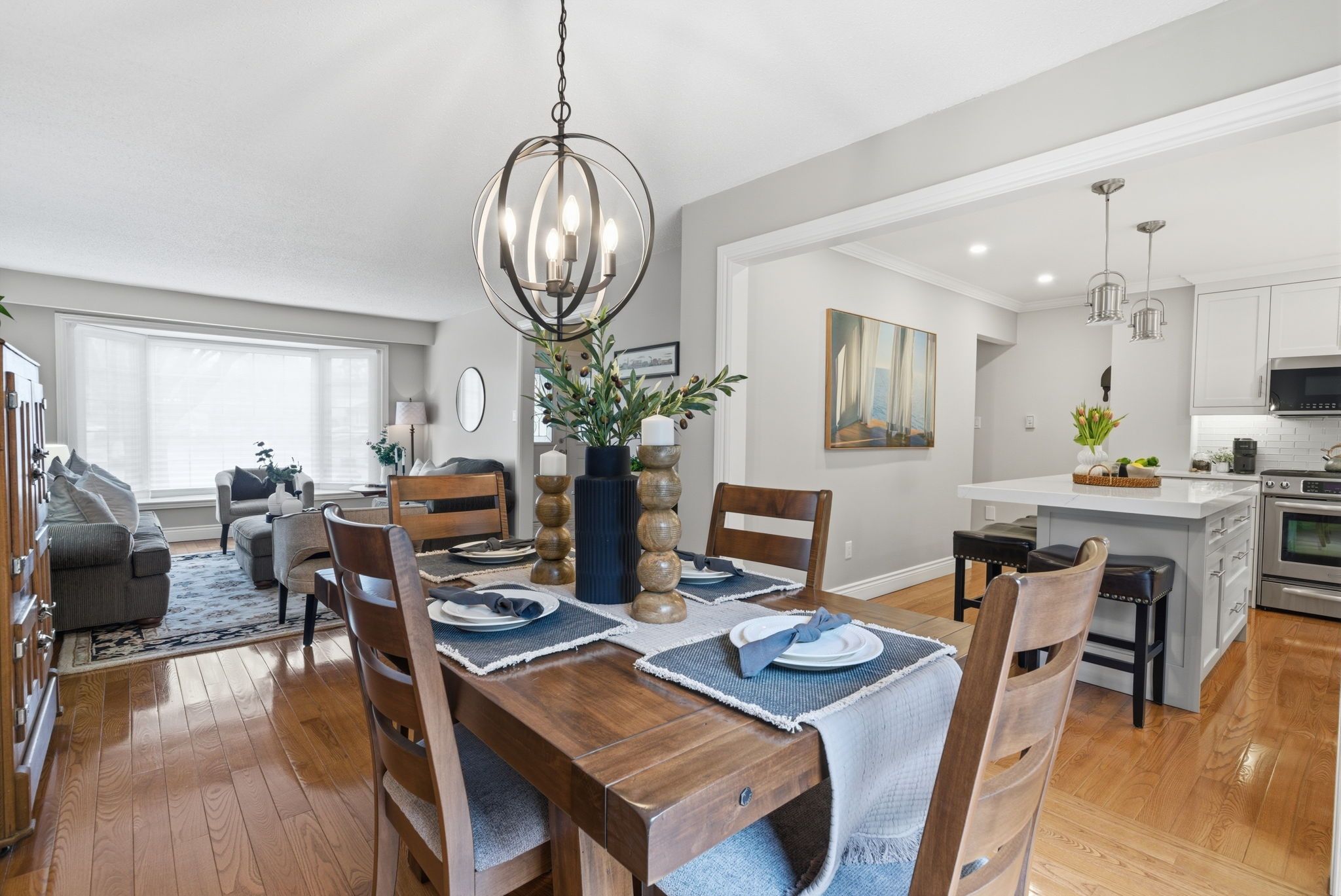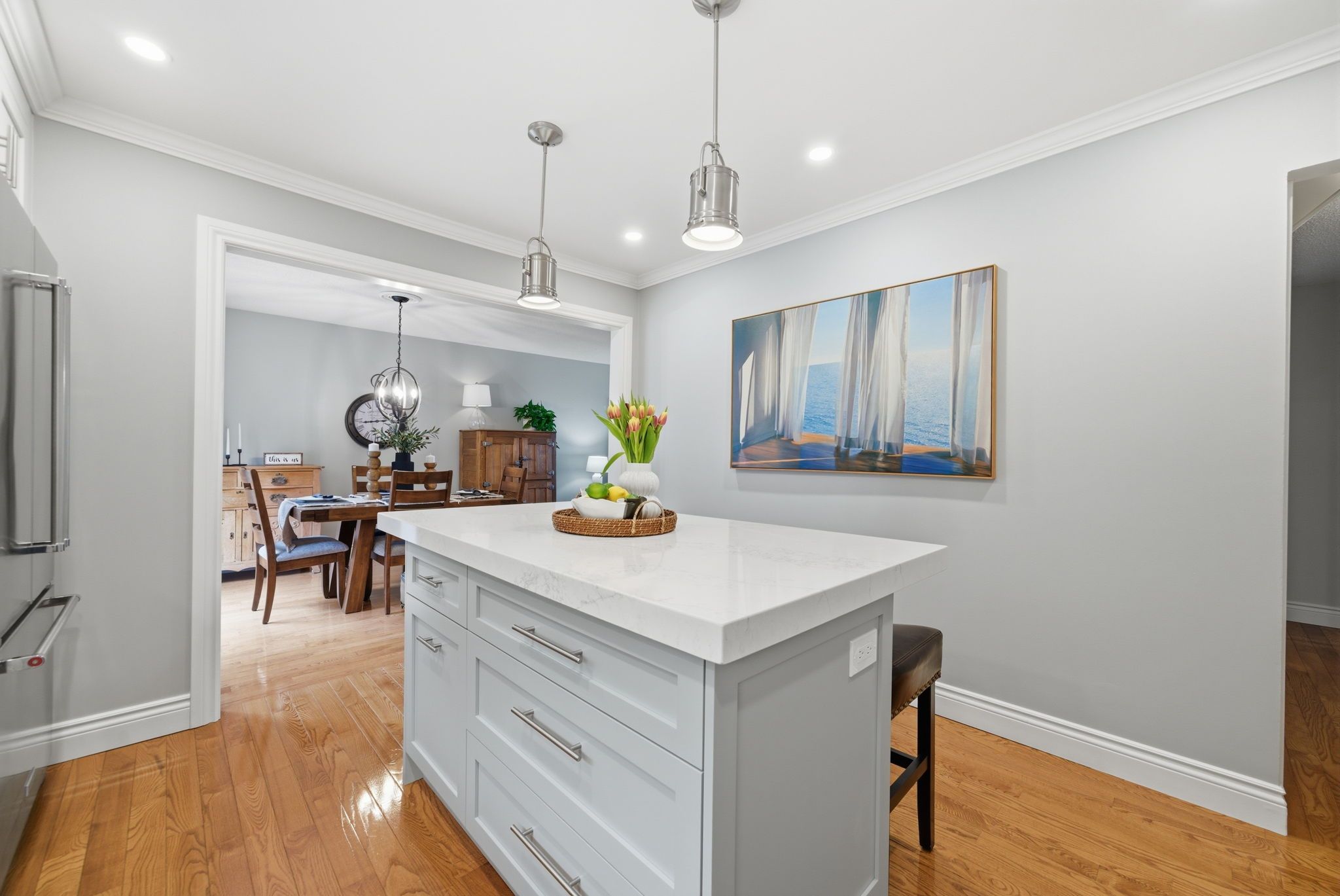 • Bright kitchen with quartz countertops and custom features.