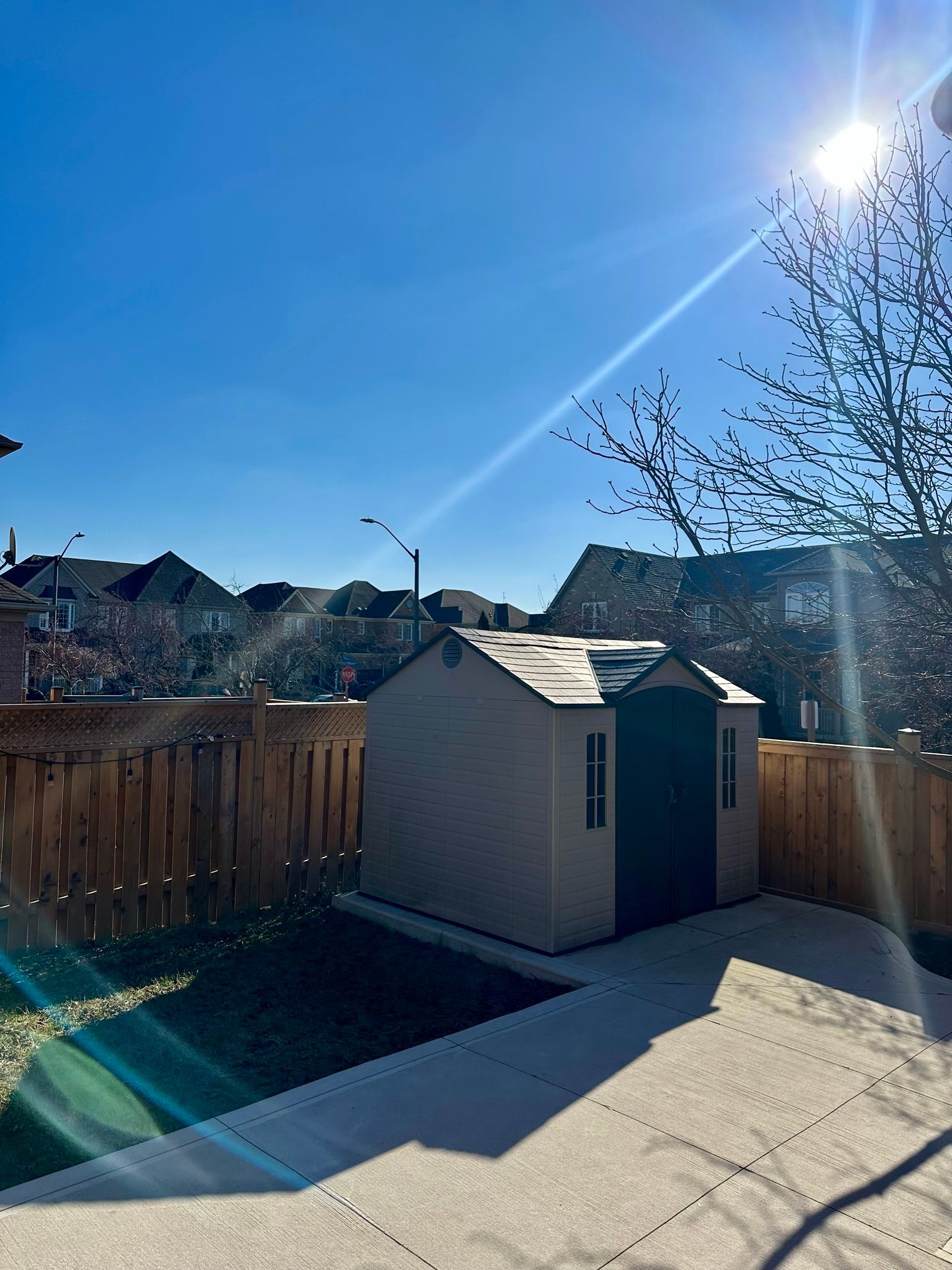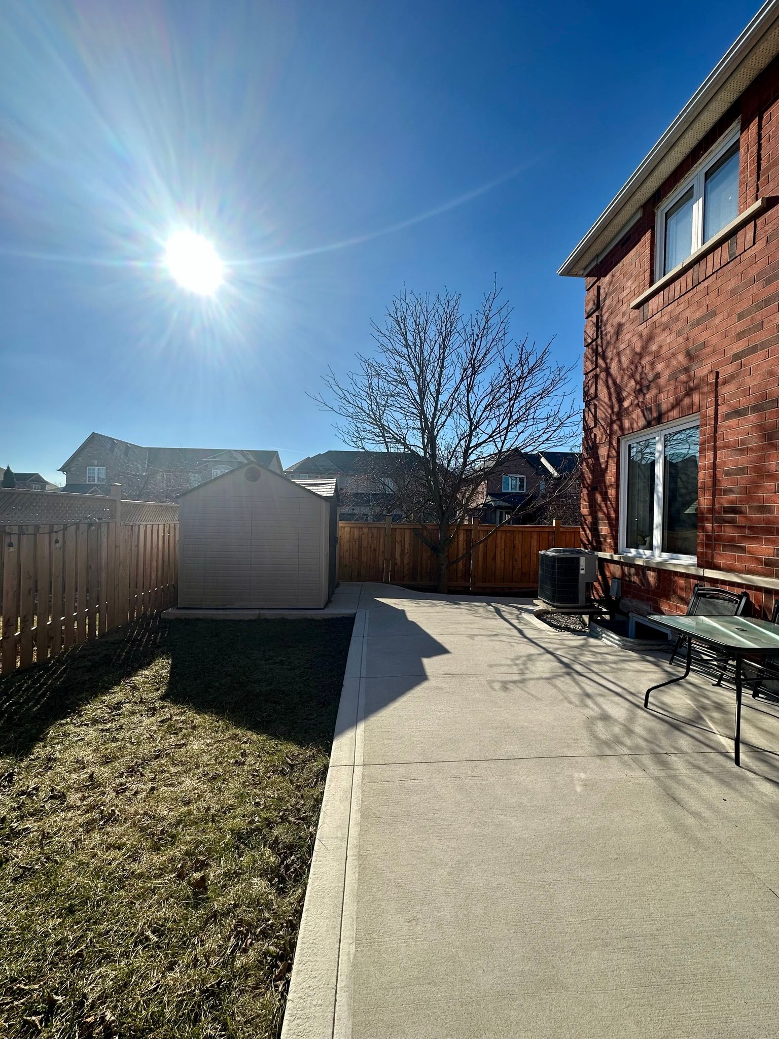 • Fully fenced yard with storage shed, plus 3 dedicated parking spaces available.