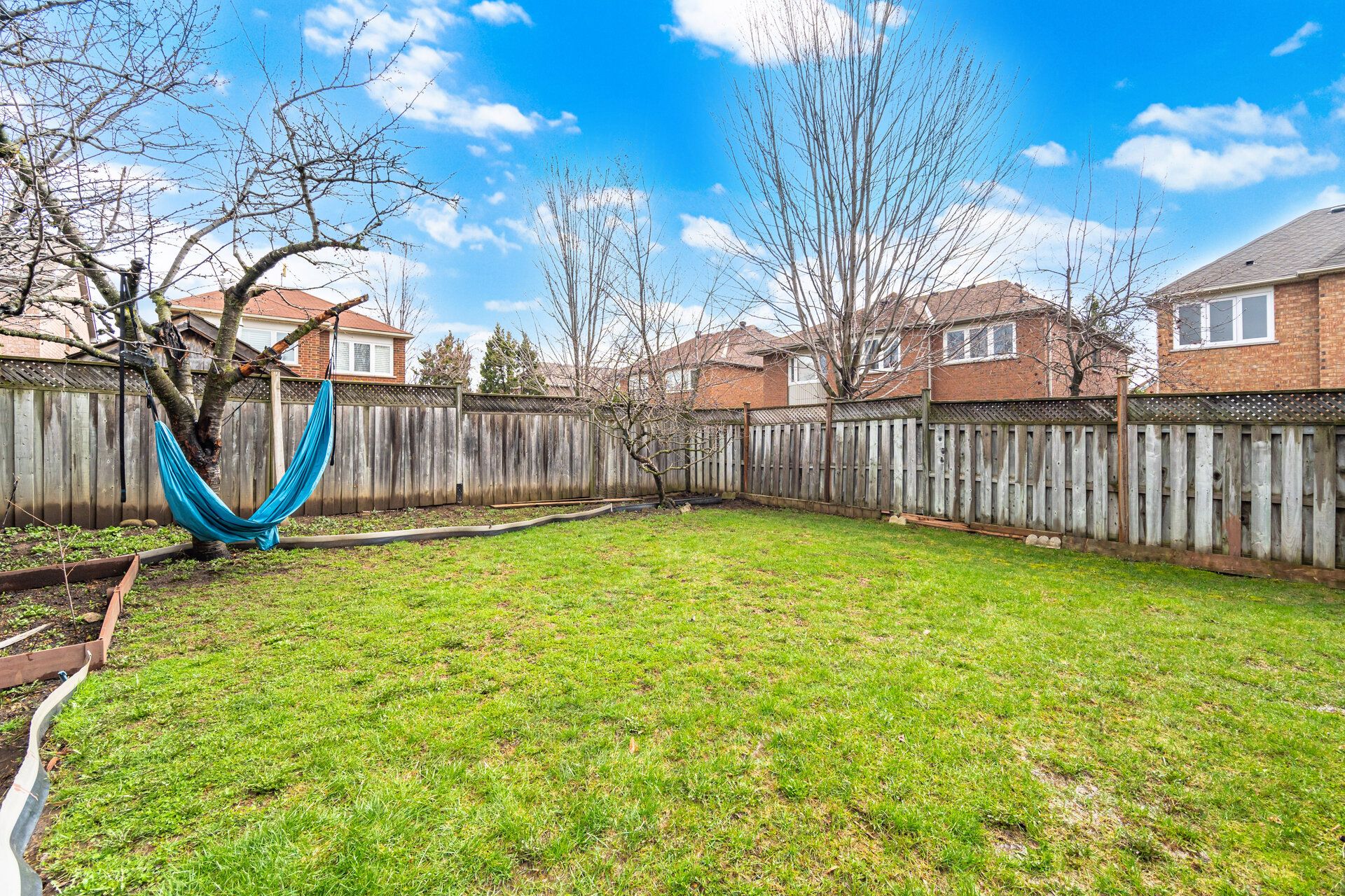• Serene backyard with fruit trees and a vegetable patch for organic gardening.