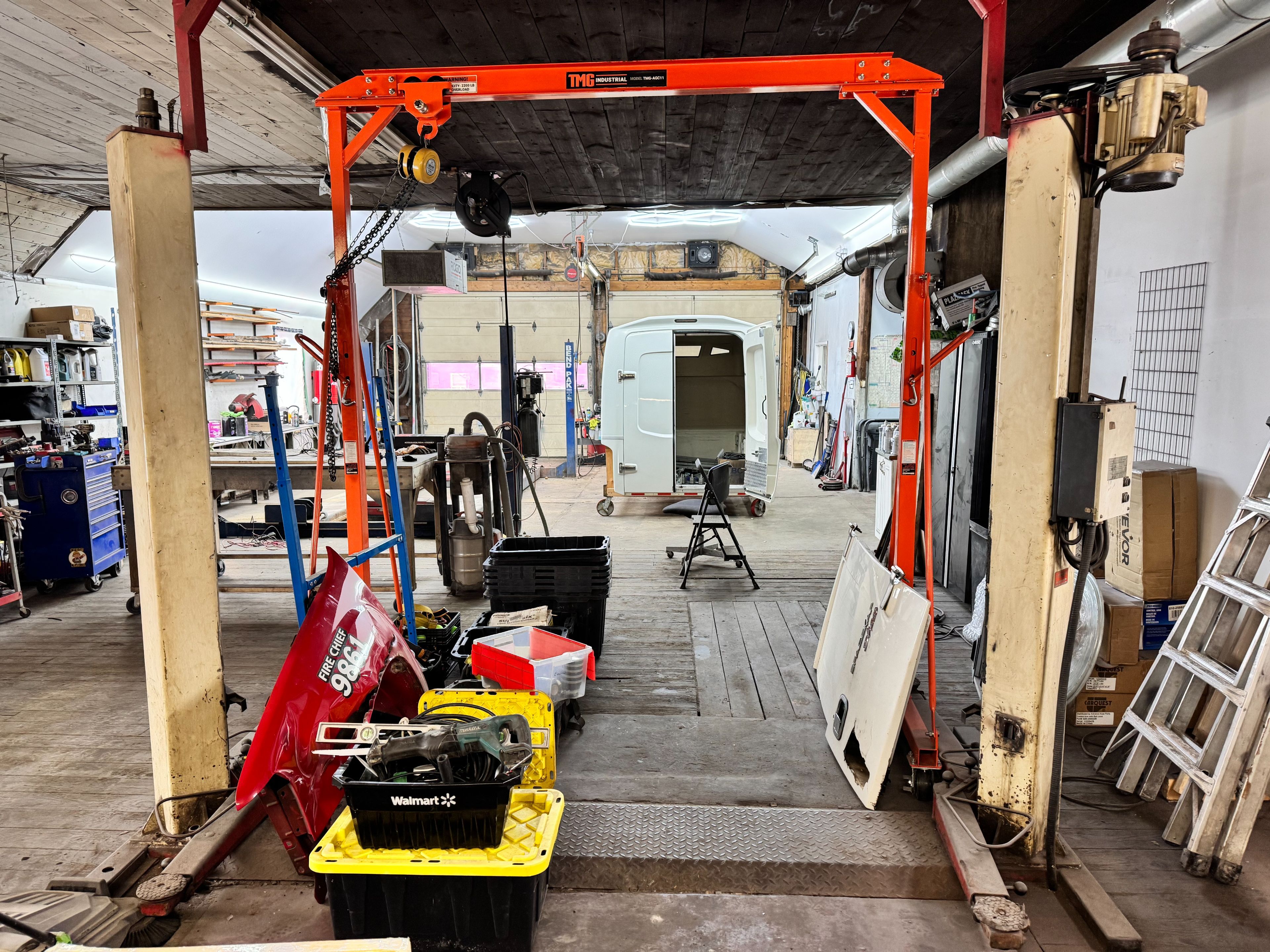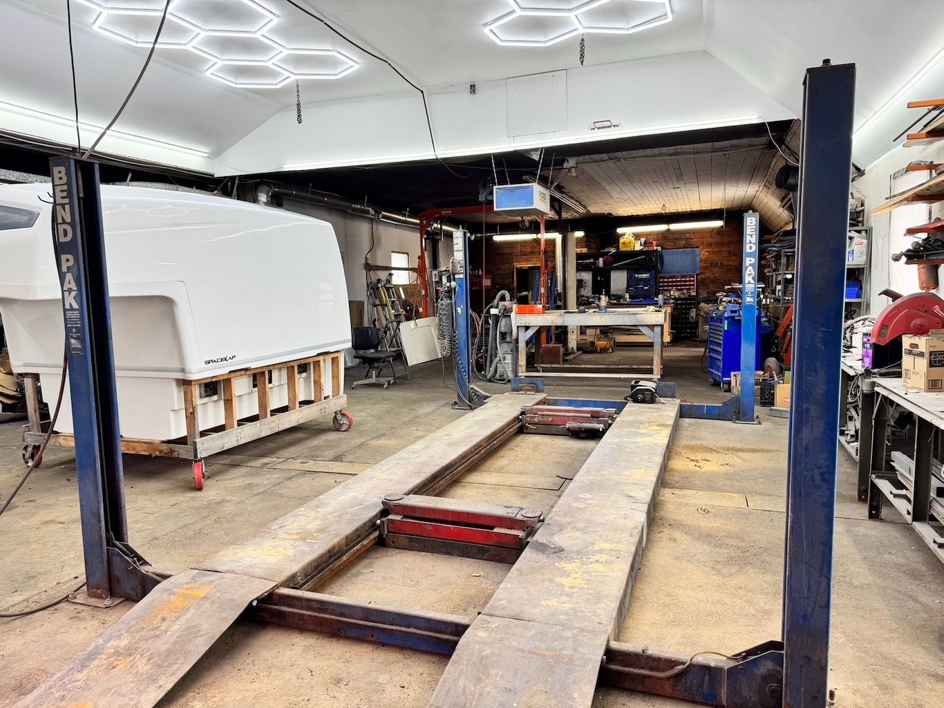 • Main bay equipped with high-capacity lifts for heavy vehicles.