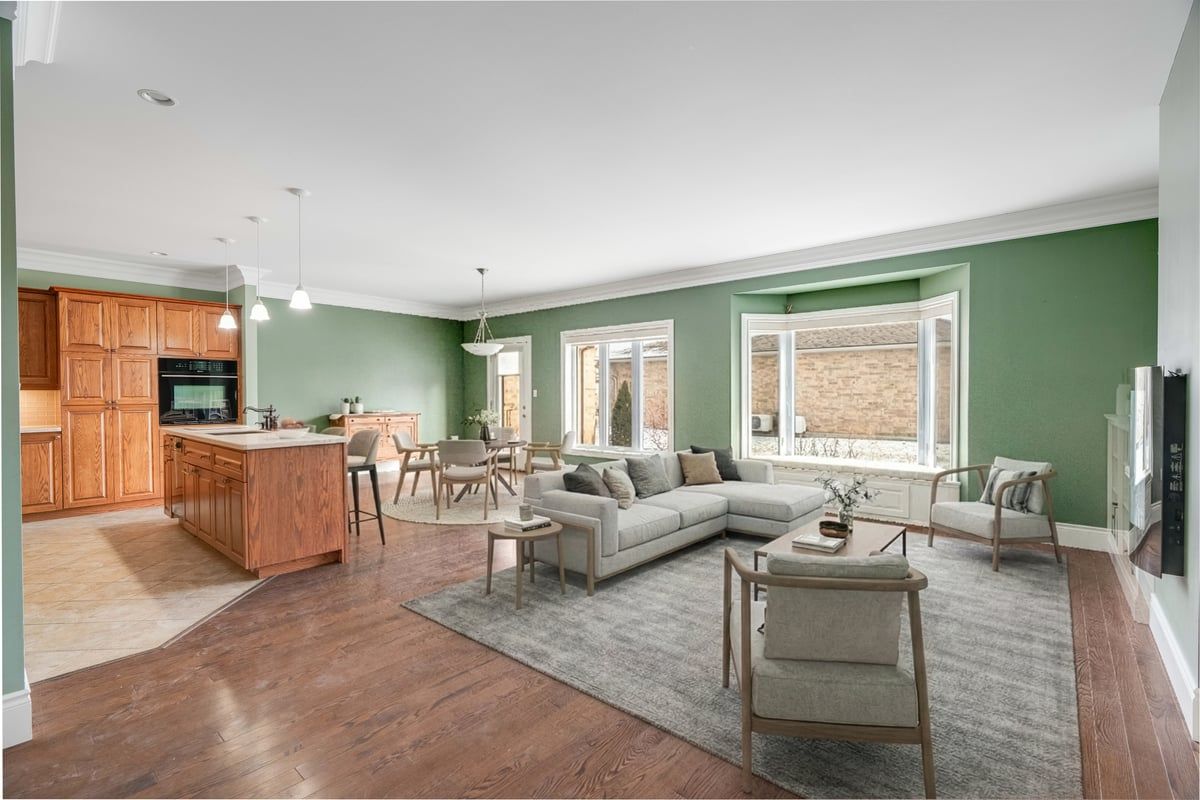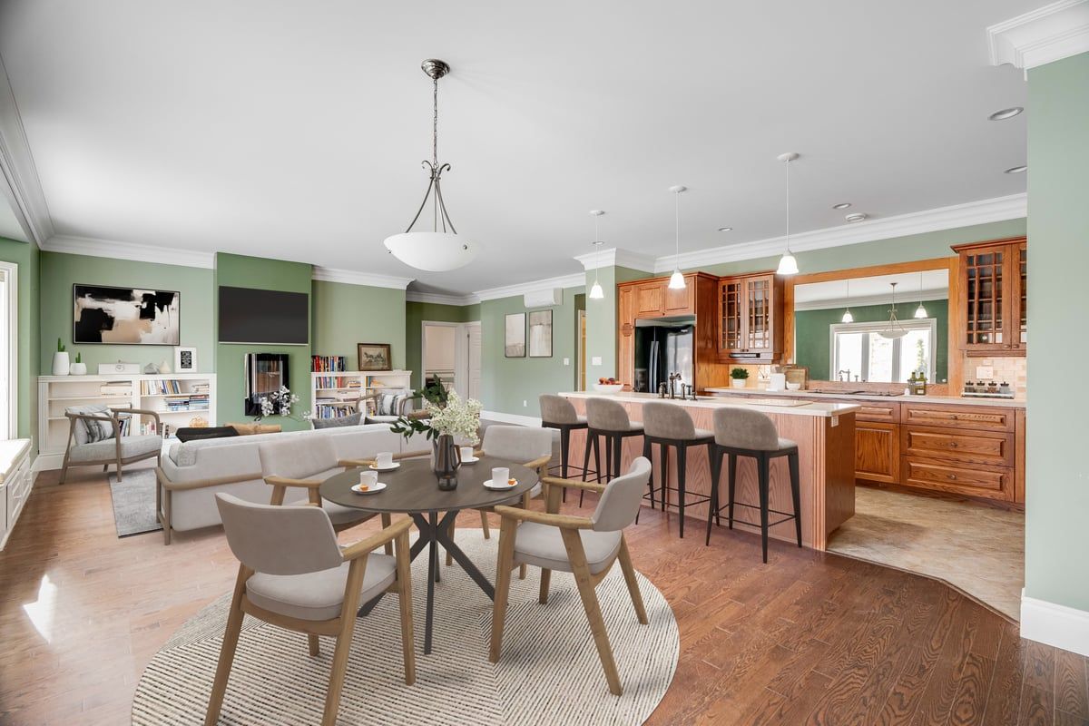 • Open layout connects kitchen, dining, and living areas for easy flow.