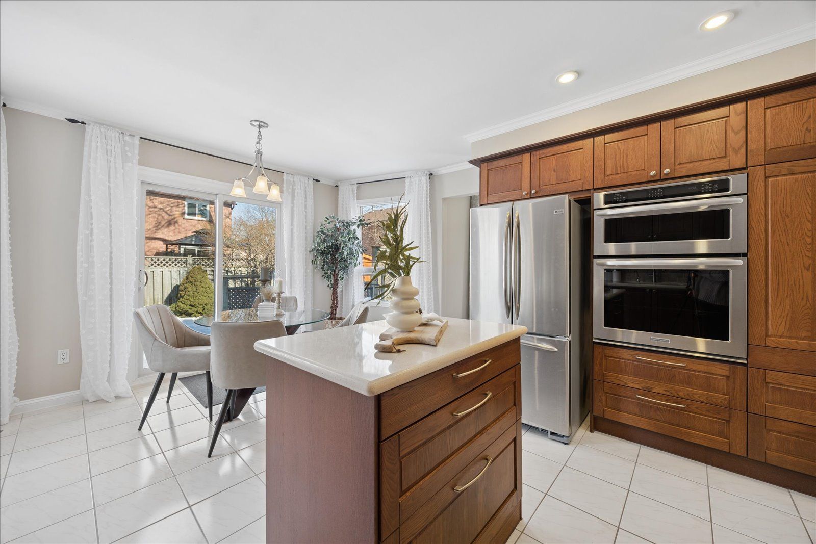 • Renovated eat-in kitchen with modern appliances and Corian countertops.