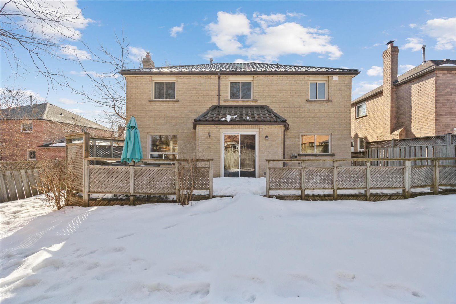 • Private deck overlooking serene, treed backyard with a custom shed.