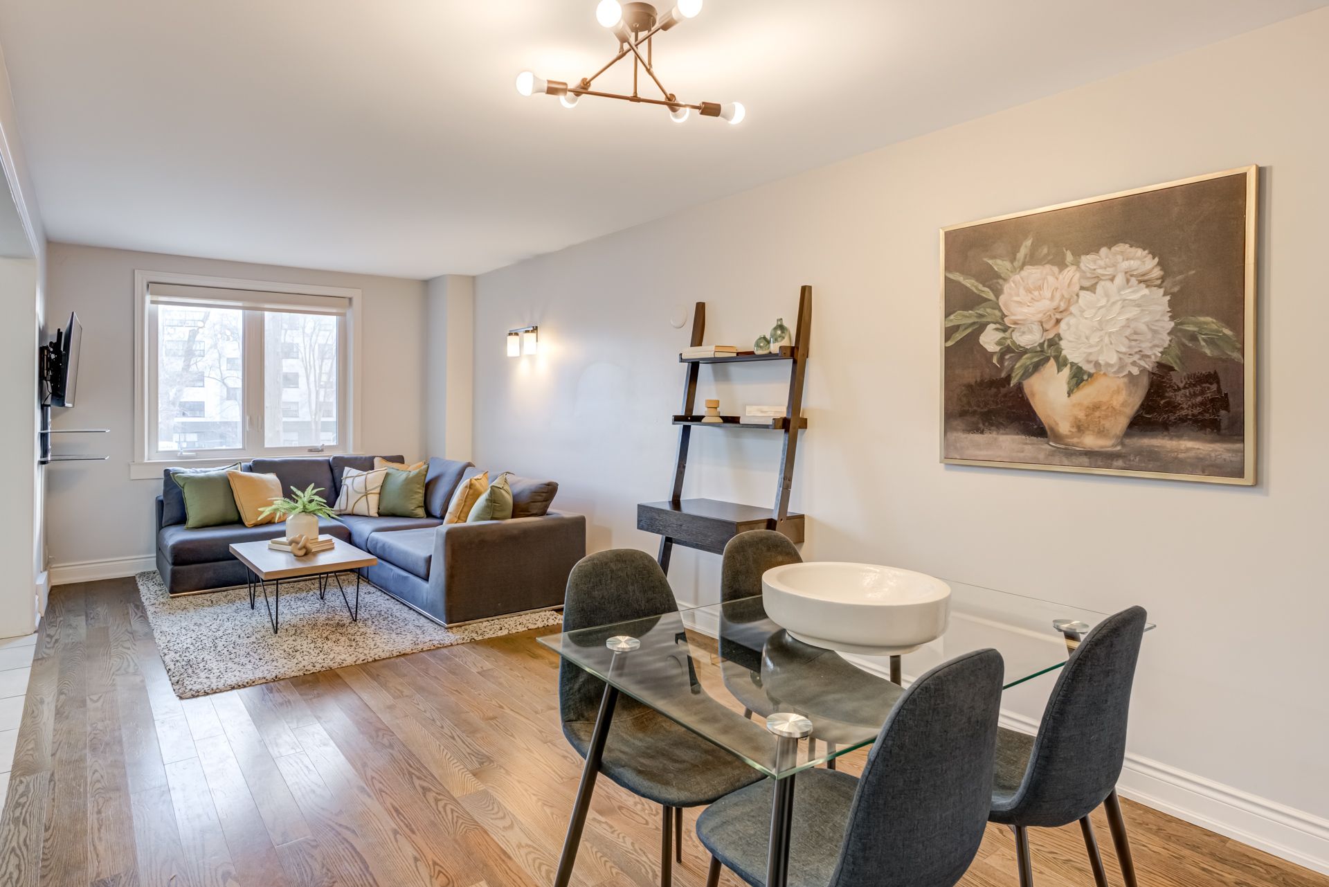 • Bright main level with hardwood floors and open-concept living/dining area.