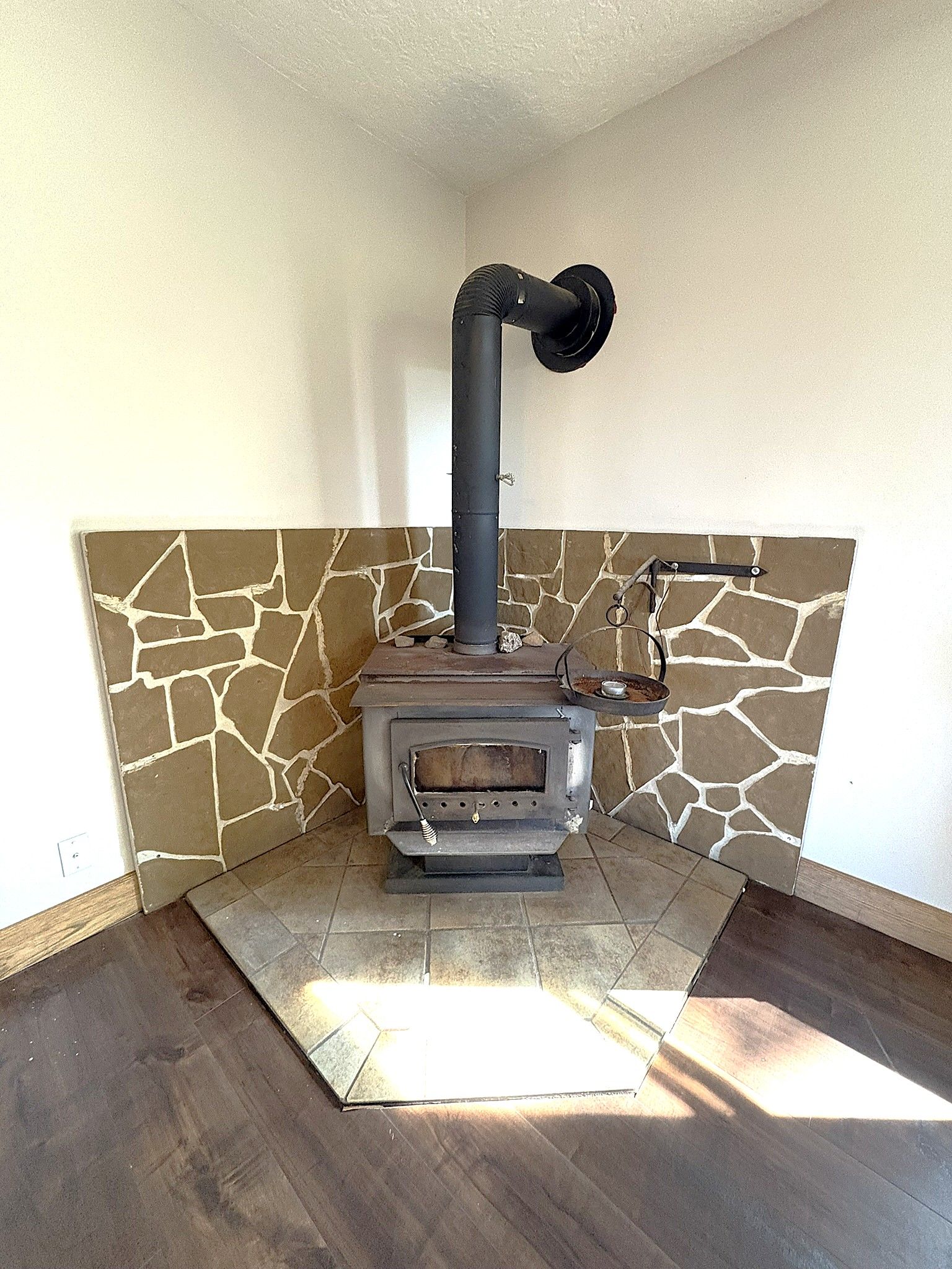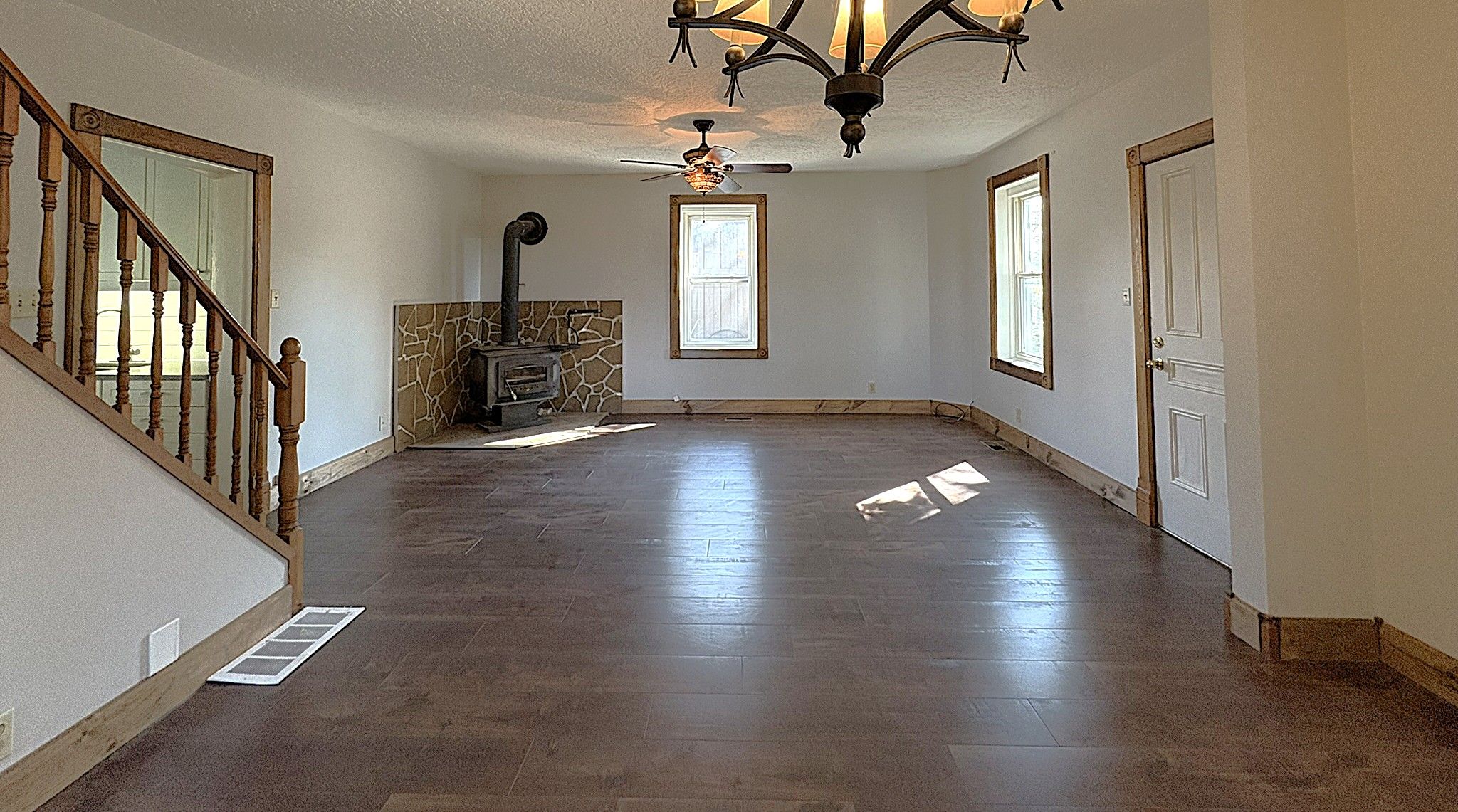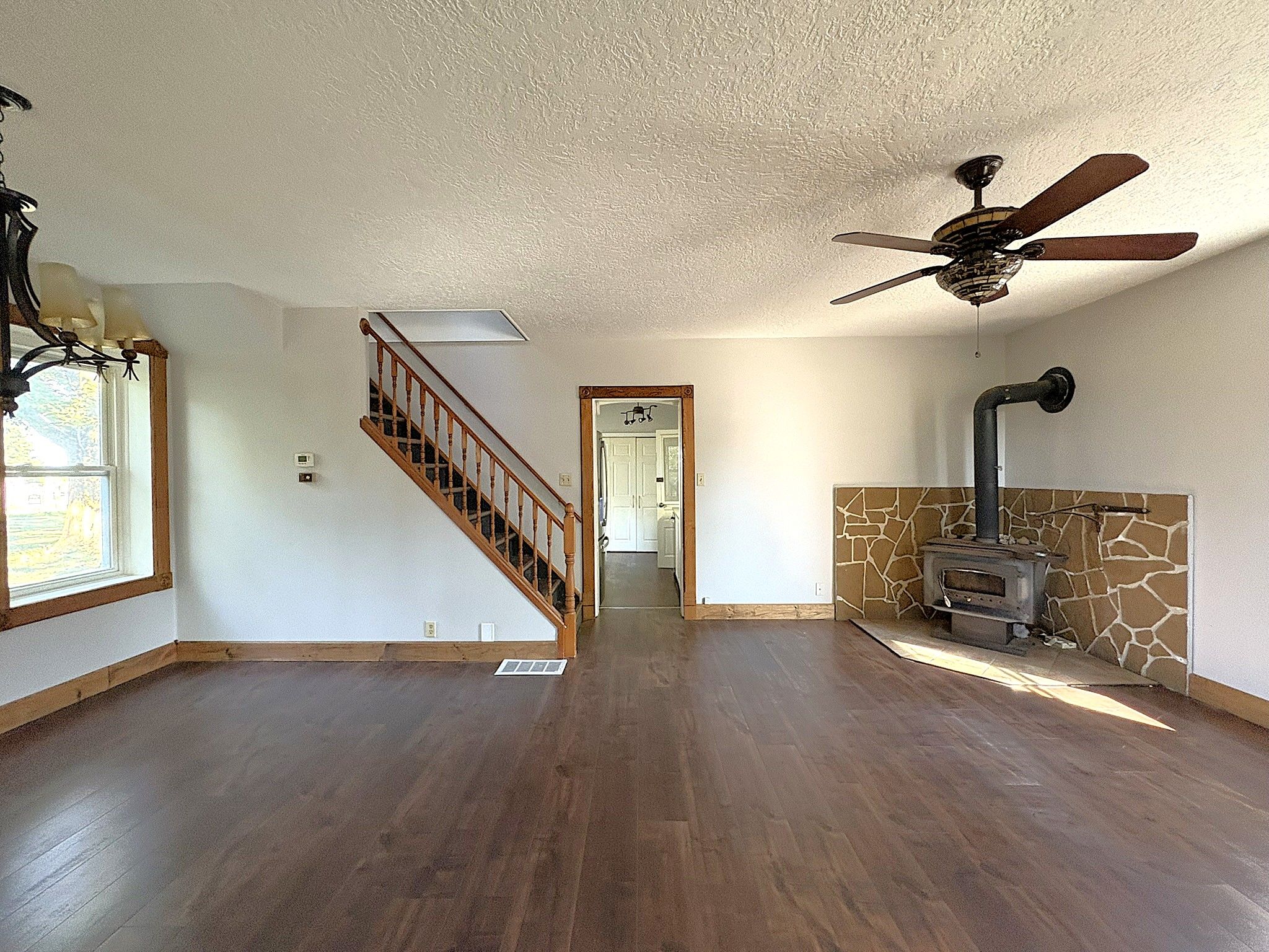 • Open concept living/dining area with a cozy wood burning fireplace.