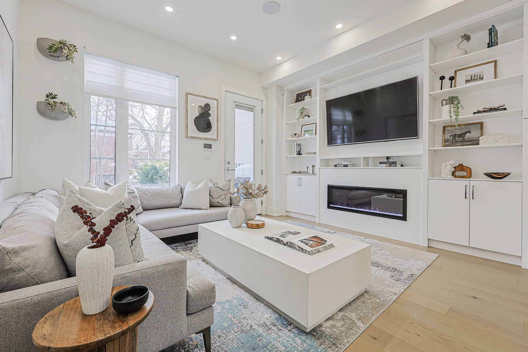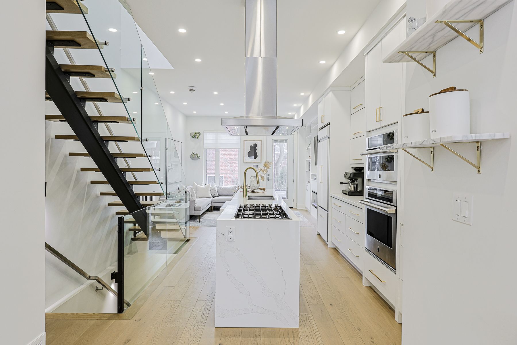 Exceptional luxury newer build, constructed with meticulous attention to detail throughout. This thoughtfully designed home offers a modern open-concept layout that's ideal for both everyday living and entertaining. The main floor is showered with natural light with large windows, and hardwood floors throughout. The custom-built kitchen is a standout feature with an oversized island offering exceptional storage and functionality. Stainless steel and built-in appliances including a 6 burner gas stove, magnificent quartz countertops, elegant gold fixtures, and carefully designed interior cabinet shelving. Combined with the kitchen, the living room is anchored by a built-in wall unit with electric fireplace and opens to the outdoor patio through a walk-out. Finishing the main floor is a spacious dining area. The upper level features three spacious bedrooms, including a primary bedroom with a three-piece ensuite bathroom complete with a skylight & heated floors. Custom closets by closets by design have been installed in the primary bedroom, nursery, main floor entrance, and basement, offering seamless organization and elevated design. Automatic hunter douglas blinds add comfort and convenience. The basement includes a walk-out to the backyard and showcases custom brick wall paneling, creating a warm and refined space. Access to the rare built-in garage provides exceptional everyday convenience. Recent exterior upgrades include a completely redesigned backyard, replacing the former wooden deck and grass yard with metal patio and stairs, concrete surfaces, and newly planted trees and landscaping. The front steps have been rebuilt and now include discreet built-in storage underneath for bins and outdoor items. Ideally located close to top public schools, ttc, and the area's best shops and restaurants, this property represents a truly outstanding opportunity. And the lrt is steps away! Easy access to the entire city!