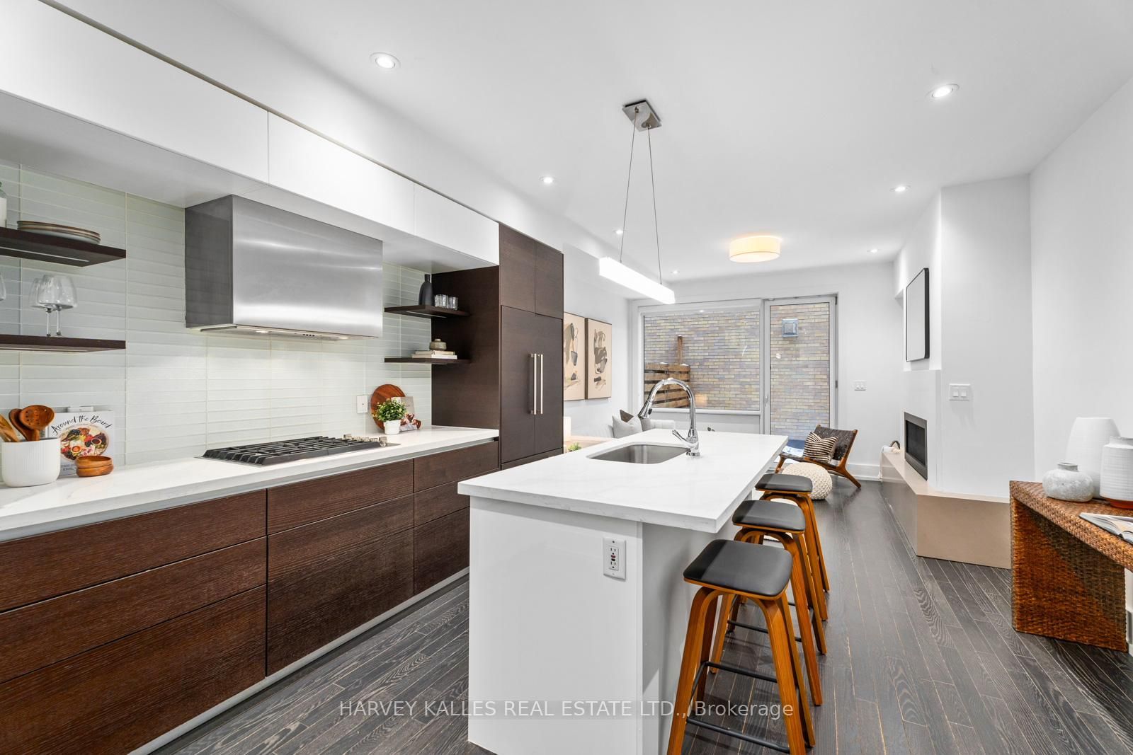Welcome to 5a sylvan avenue, a spacious and beautifully designed 3+1 bedroom, 4-bathroom townhouse ideally located near college and dovercourt. This move-in-ready home has been thoughtfully updated and meticulously maintained, offering a fresh, modern aesthetic throughout. Rich hardwood floors span every level, creating a seamless and timeless design. The main floor features a bright, open layout filled with natural light and carefully curated designer fixtures. The modern kitchen is both stylish and functional, featuring a stainless steel oven and gas range, along with a fully panelled fridge and freezer for a sleek, integrated look. A built-in island with seating anchors the space, while clean lines and contemporary finishes flow effortlessly into the living area, highlighted by a gas fireplace. A walk-out from the kitchen leads to a private, fenced-in terrace, offering an exceptional outdoor retreat with rare privacy, water access, and a gas line for a bbq. A full dining room and convenient powder room add everyday functionality, while the home's low-maintenance living makes it as practical as it is beautiful. Upstairs, generously sized bedrooms offer walk-in closets and comfortable proportions. The primary suite is a serene retreat, featuring a private balcony overlooking a quiet, tree-lined street and a spa-inspired ensuite with a large glass-enclosed shower, double vanity, soaker tub, and large window that fills the space with natural light. Additional bathrooms are well-appointed and finished with spa-like details. The lower level features a high-ceiling basement with excellent flexibility, ideal as an additional bedroom, home office, or bonus living space. Underground parking with private garage access completes this exceptional offering. Located just steps to dufferin grove park and close to ttc transit, major roadways, and a vibrant selection of restaurants and cafes, this home is located in the heart of desirable college and dovercourt area.