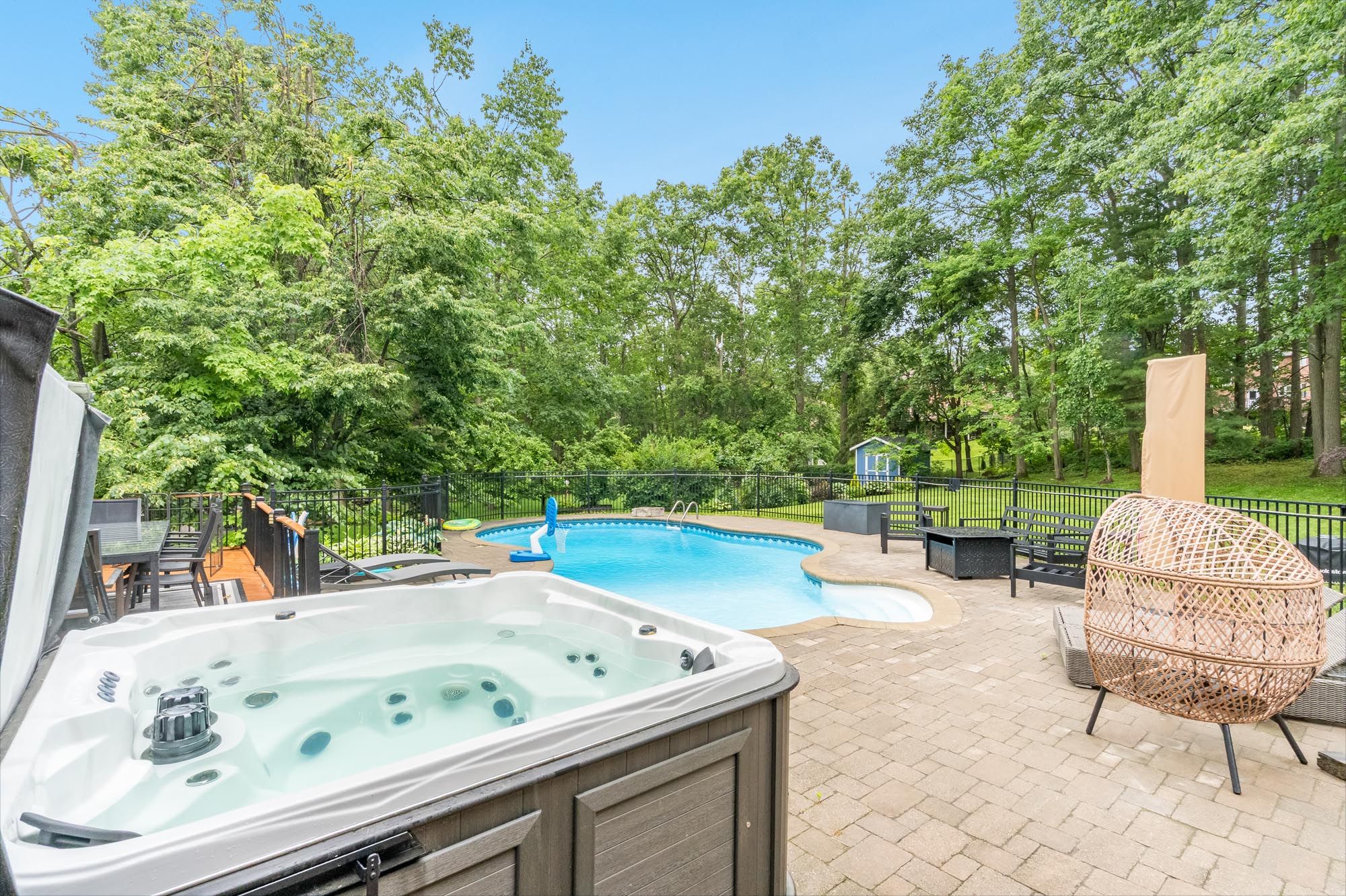 • Heated inground saltwater pool and hot tub for year-round enjoyment.