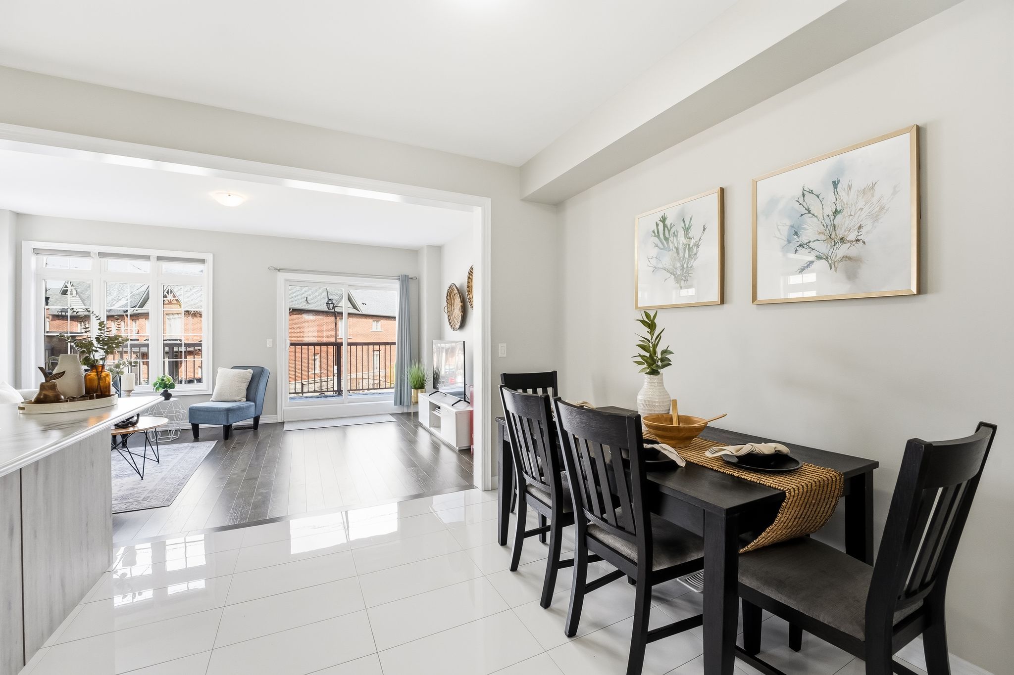 • Contemporary end-unit townhome with two-car garage and ample parking.
