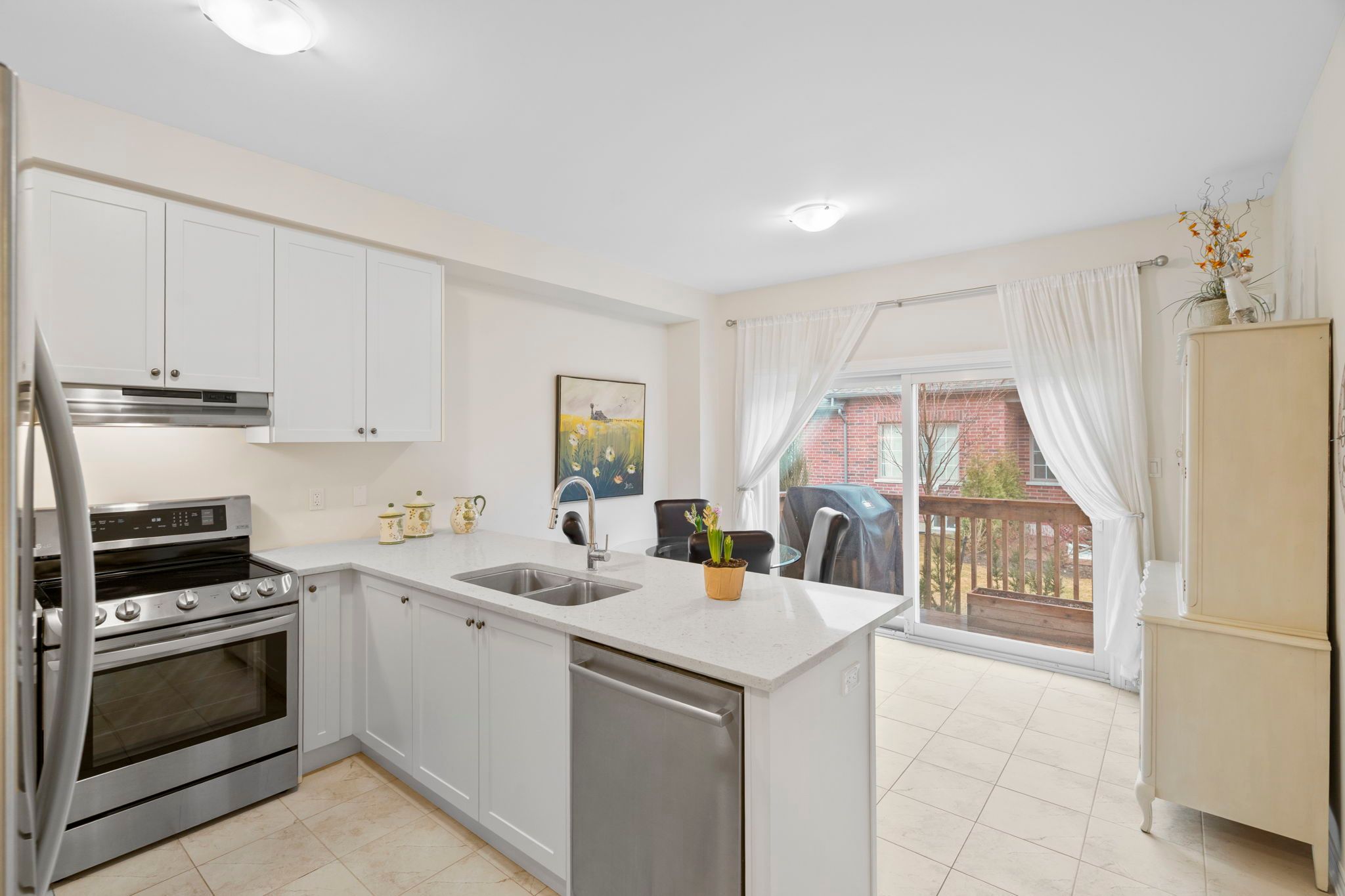 • Sun-filled eat-in kitchen equipped with quartz countertops and stainless steel appliances.
