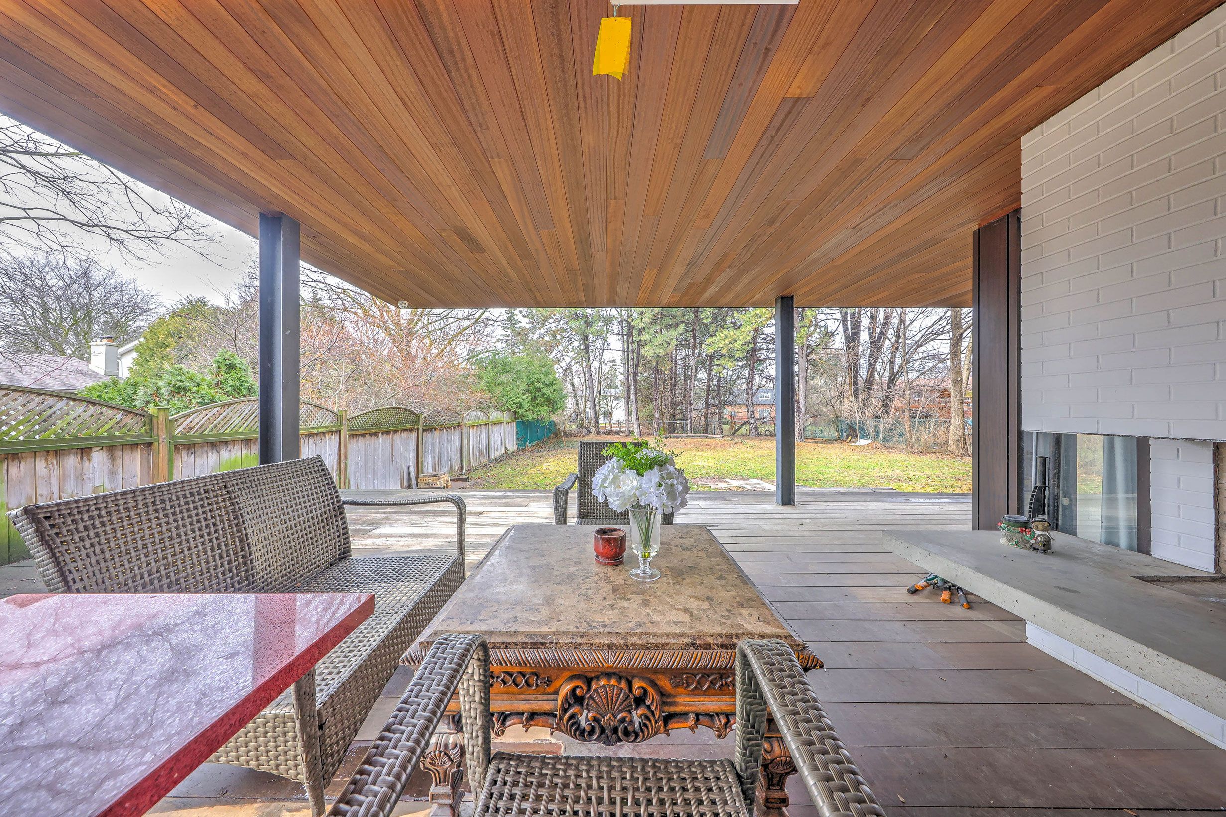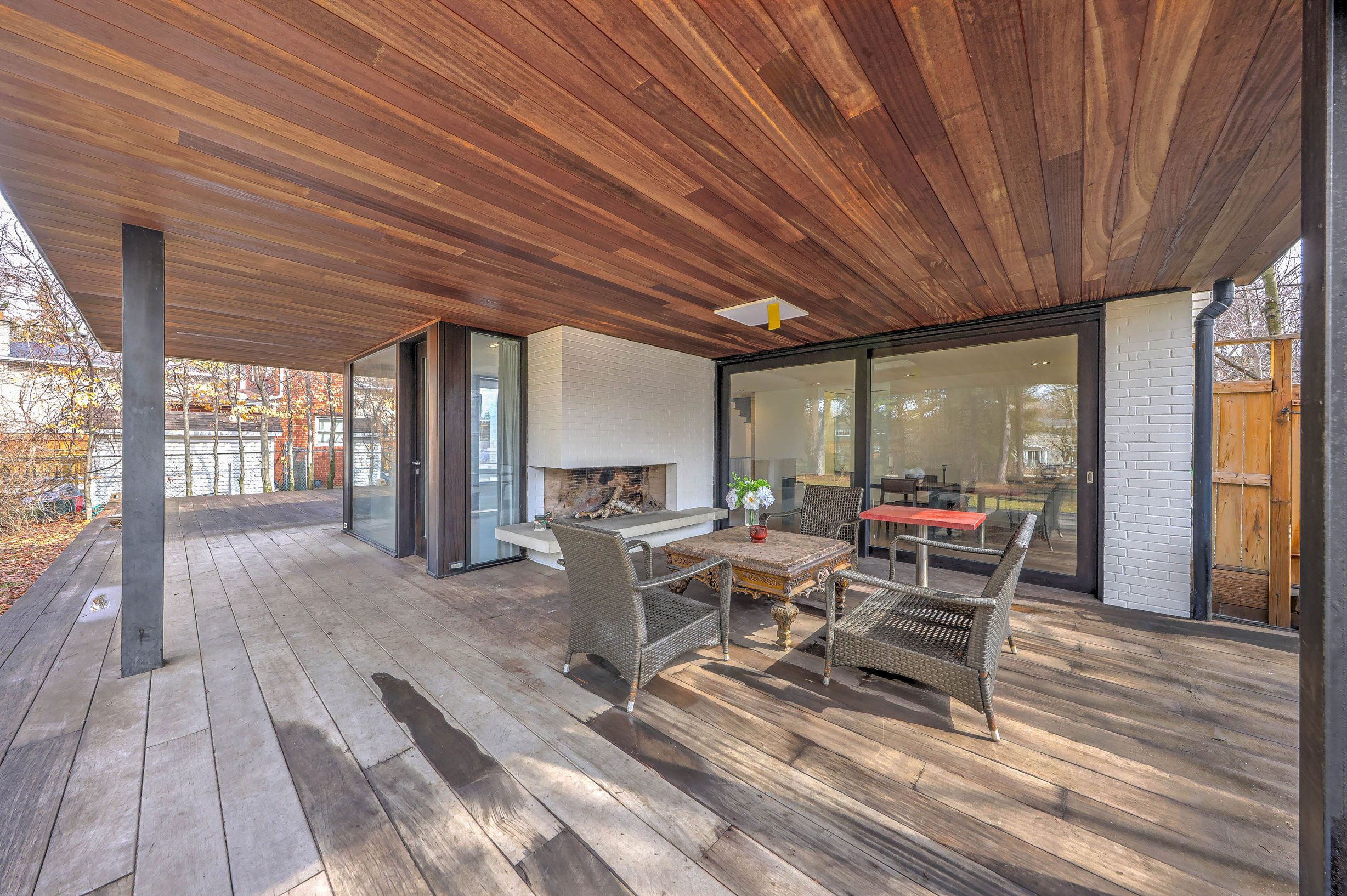 • Oversized mahogany deck with fireplace for year-round gatherings.