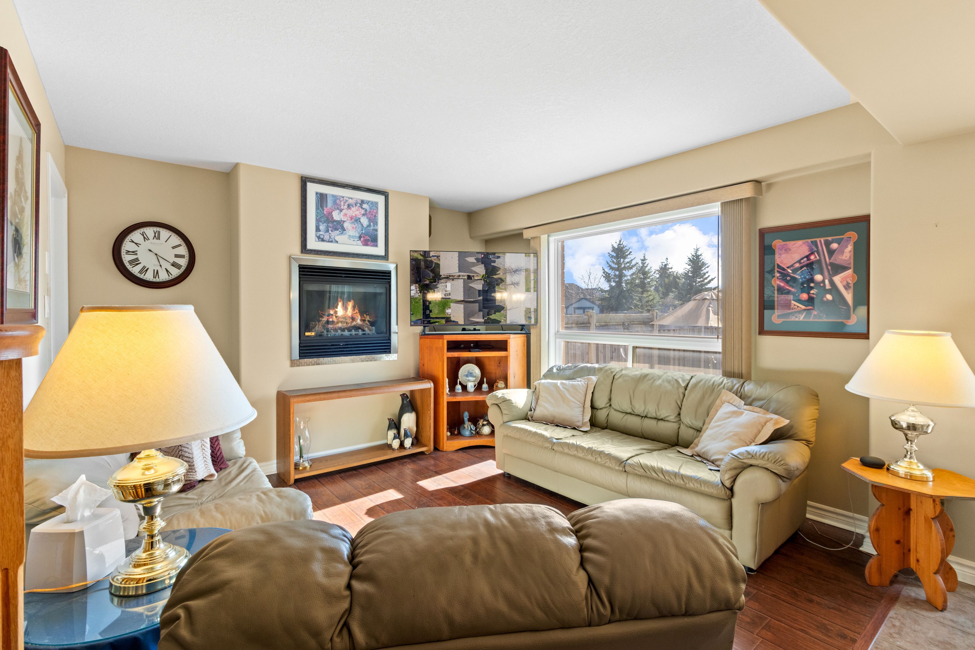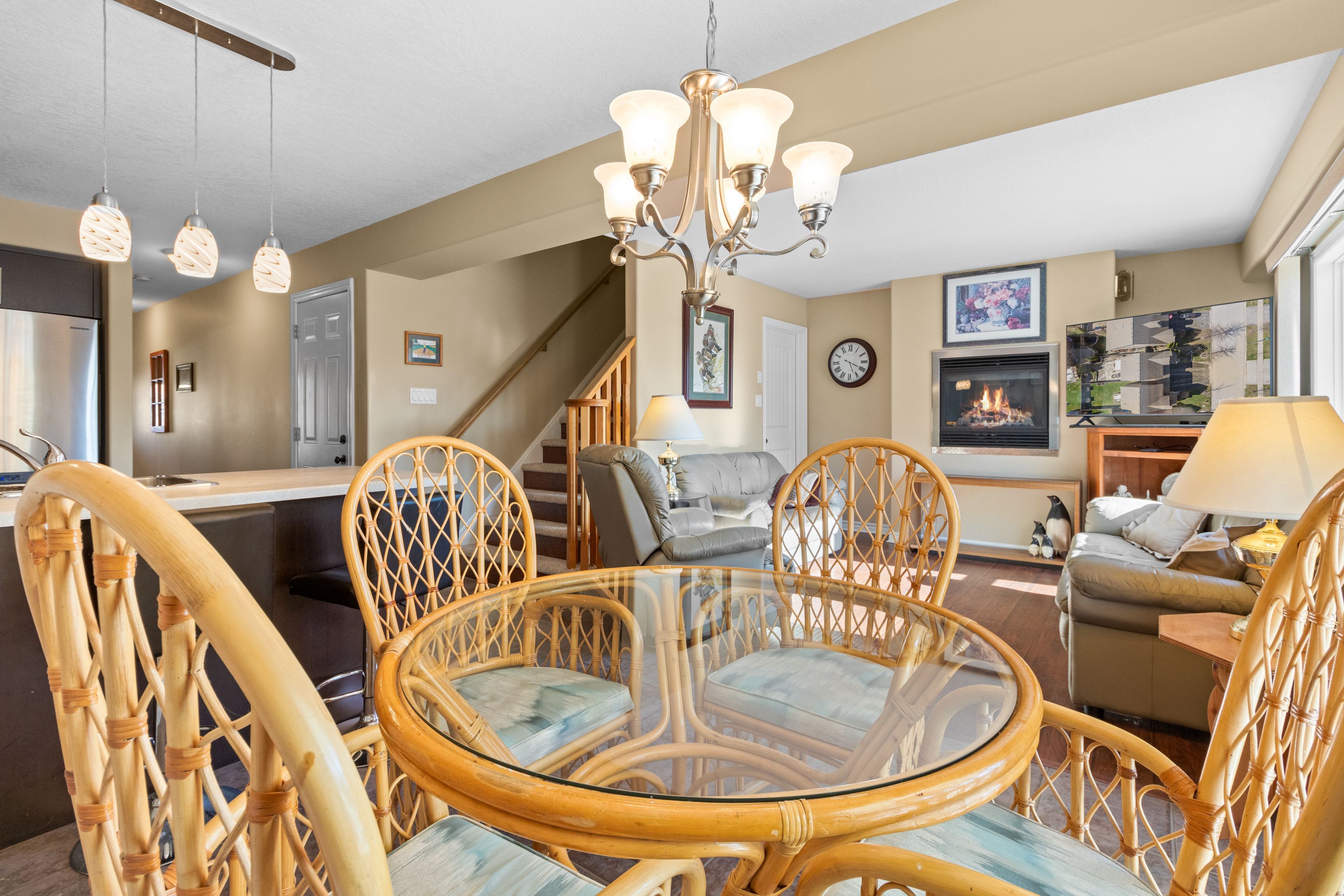 • Bright, open-concept living space featuring a cozy gas fireplace.