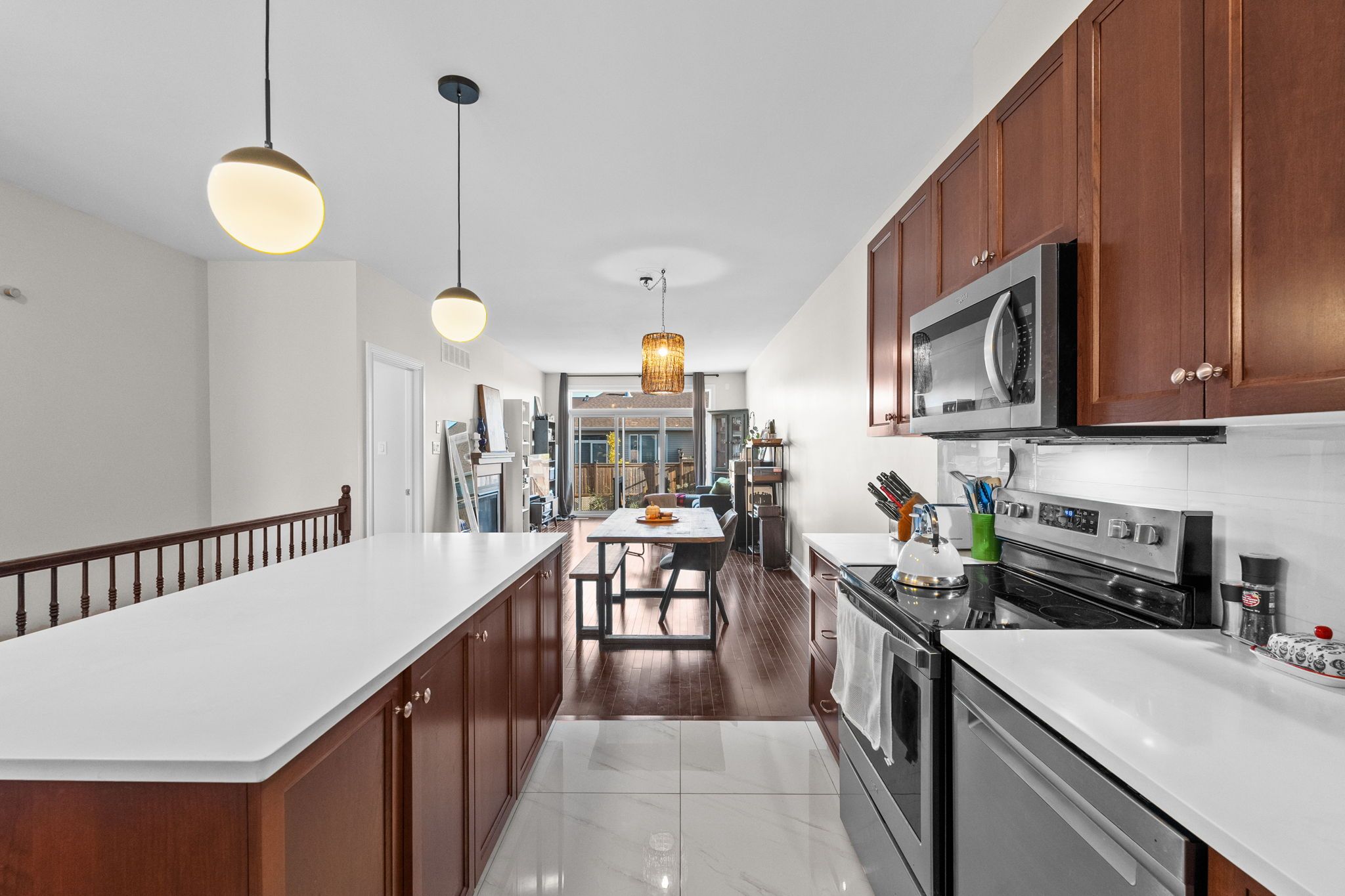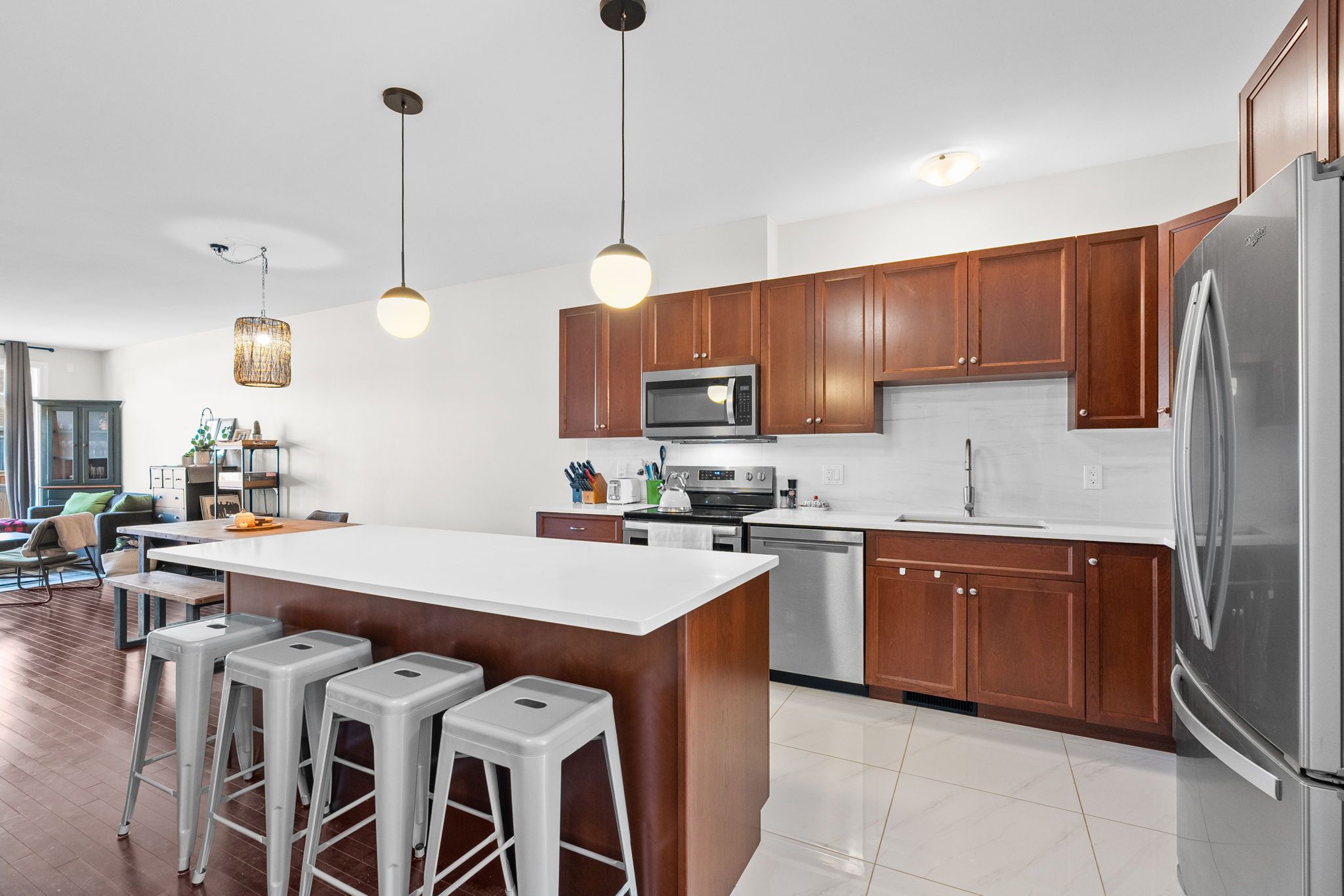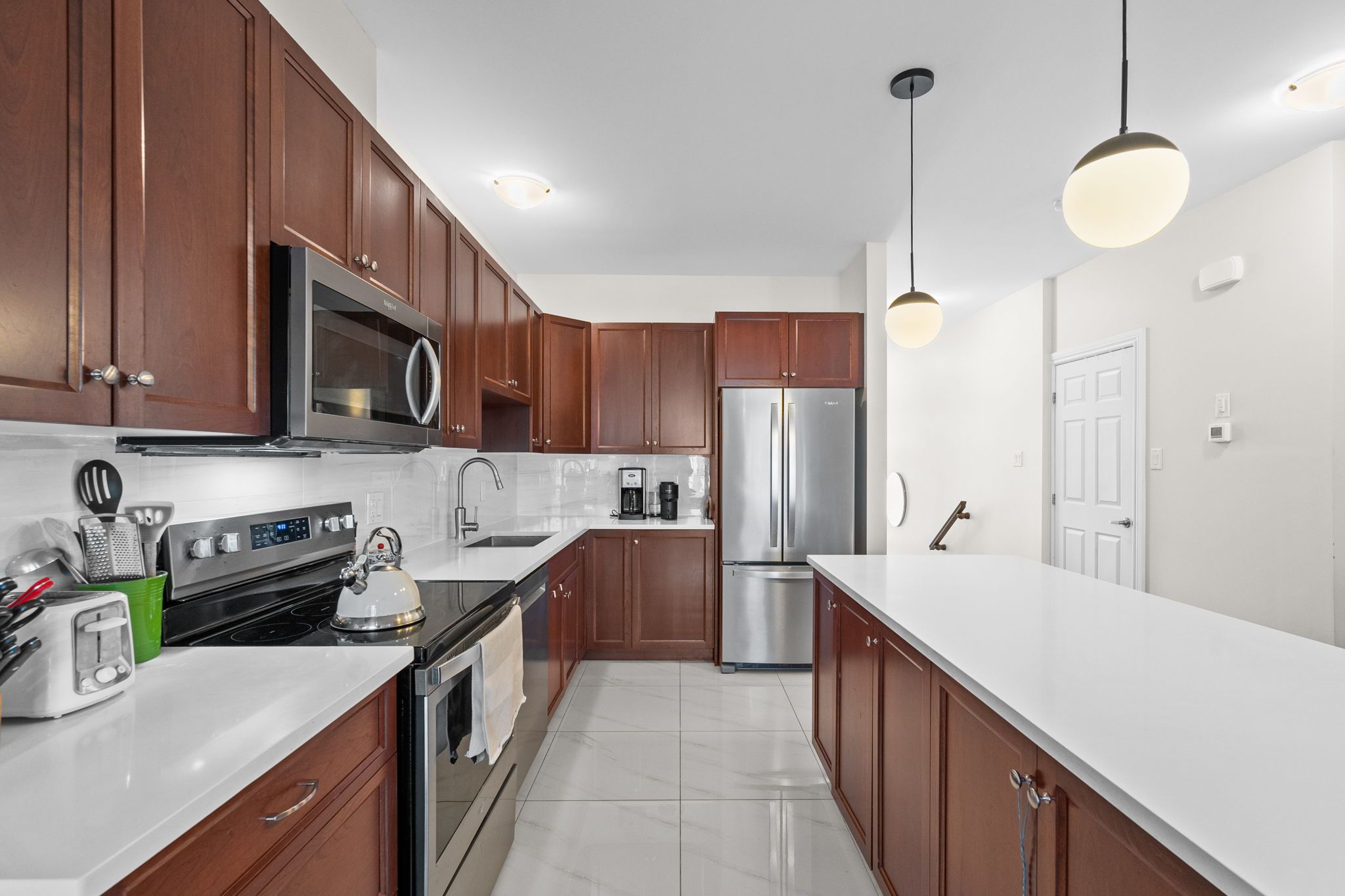• Modern kitchen featuring granite counters, large island, and ample storage.