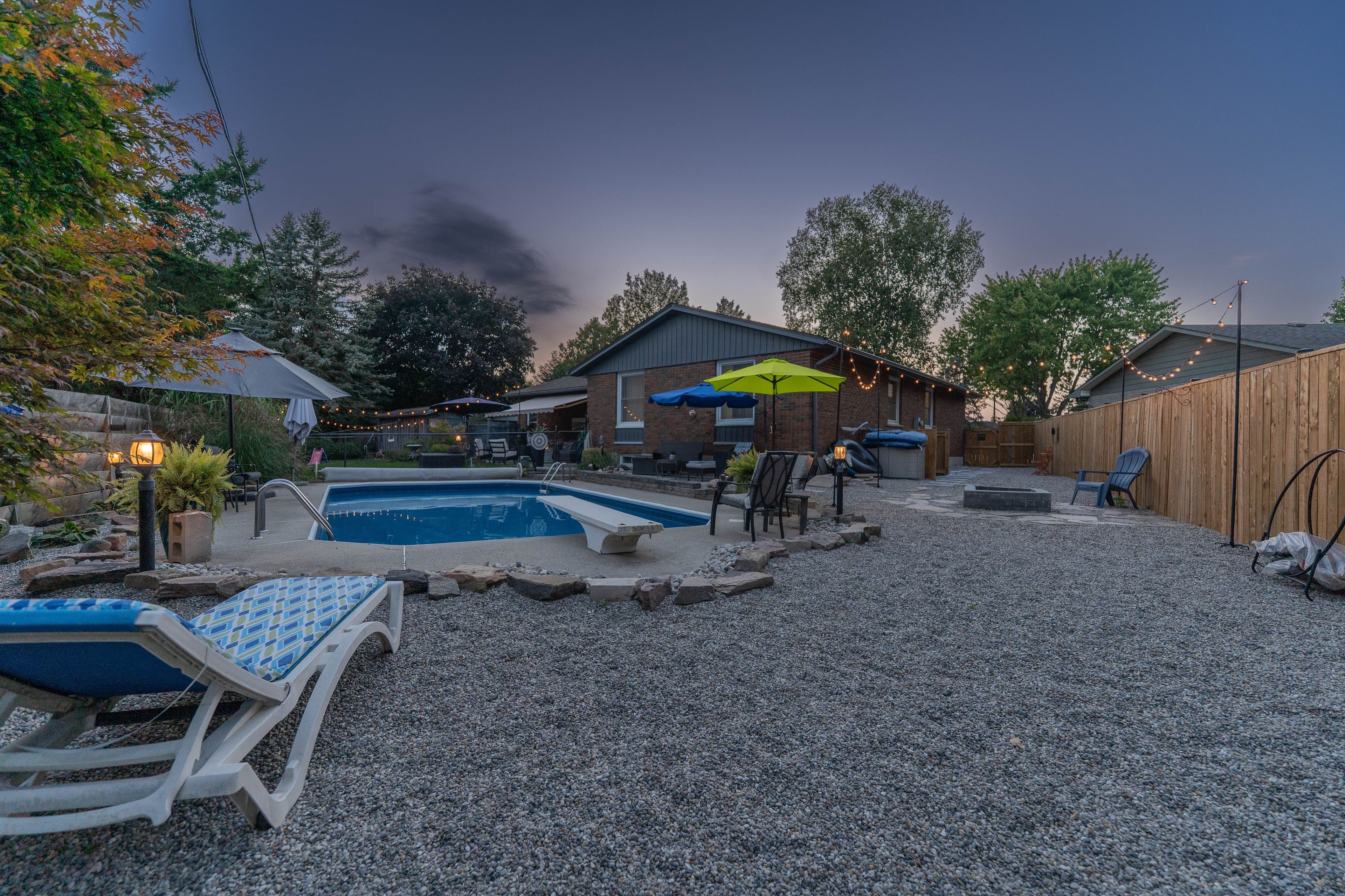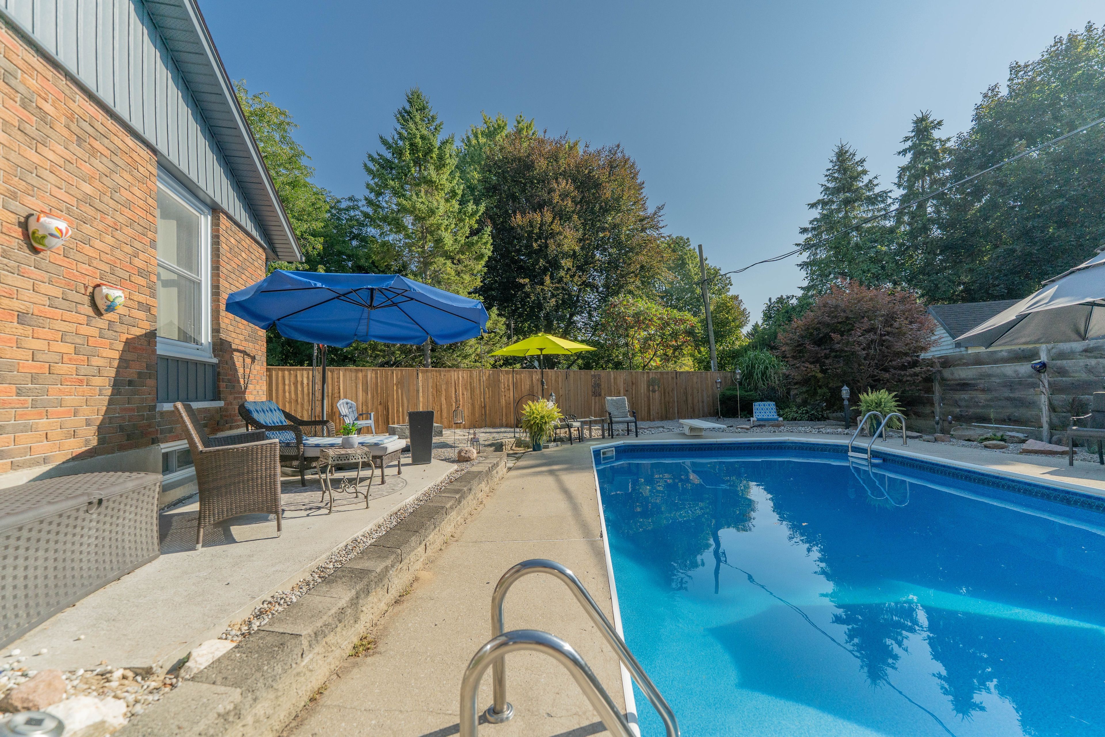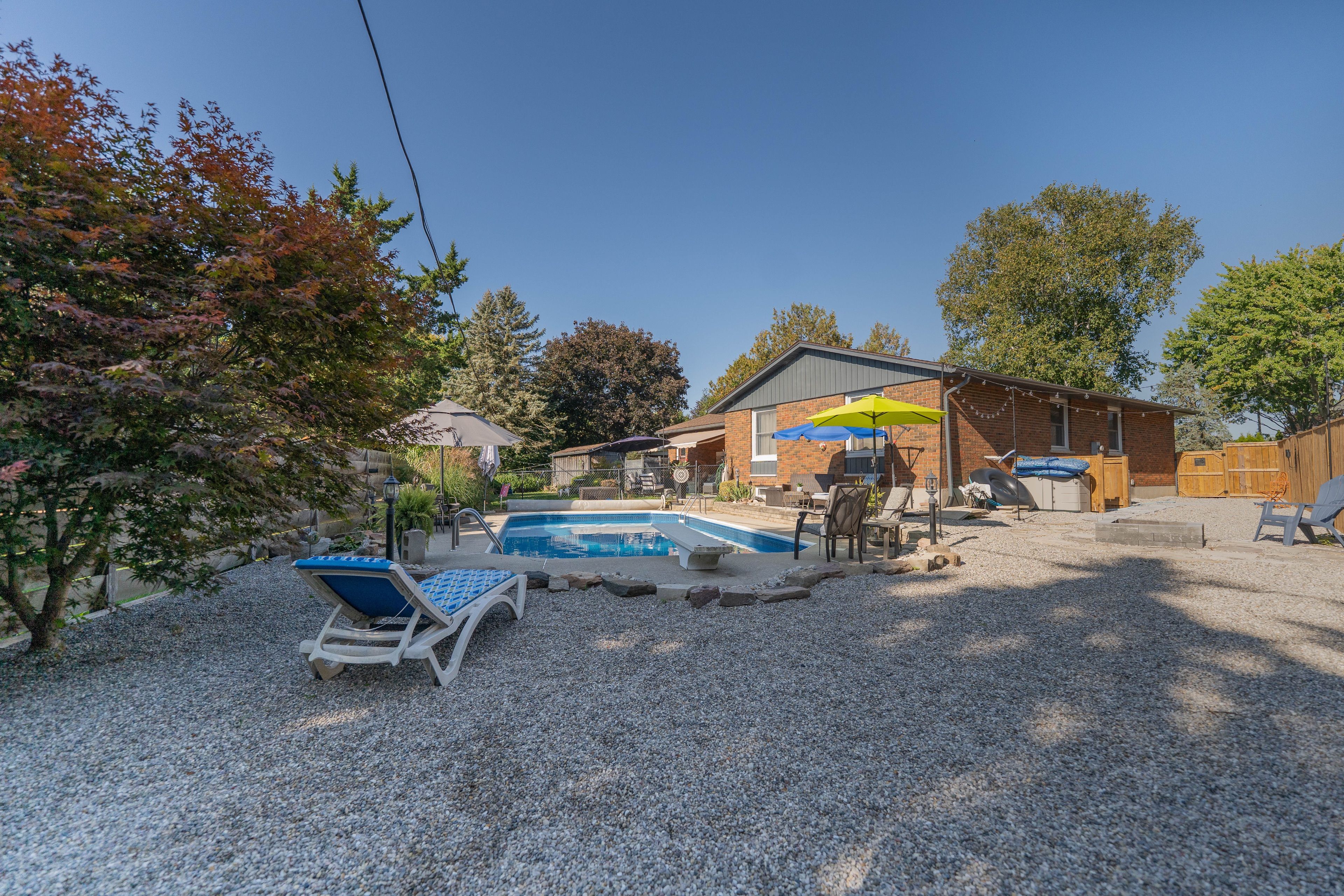 Welcome to this charming and well-maintained brick bungalow, ideally situated just steps from glendale high school in a mature, family-friendly neighbourhood. Set on a generous pie-shaped lot, this home offers a wonderful blend of comfort, functionality, and outdoor enjoyment - with many recent updates already completed. The freshly updated living room is warm and inviting, featuring new pot lights, updated flooring, and fresh paint throughout, complemented by large windows that flood the space with natural light. The eat-in kitchen provides a welcoming spot for everyday meals or casual gatherings with family and friends. The primary bedroom includes access to a convenient 2-piece cheater ensuite, while the main bathroom has been refreshed with a newer vanity for a clean, modern feel. The lower level expands your living space with a finished recreation room and dedicated office area, making it ideal for family movie nights, hobbies, or working comfortably from home. Step outside and discover where this property truly shines. Multiple outdoor living areas include a private, fenced front patio and recently poured concrete patios in the backyard - perfect for entertaining or unwinding at the end of the day. Summer living is a breeze with your own in-ground pool, surrounded by a spacious yard designed for both relaxation and play. An oversized driveway offers ample parking for family and guests. A terrific opportunity to own a move-in ready home in a sought-after location - this one is not to be missed!