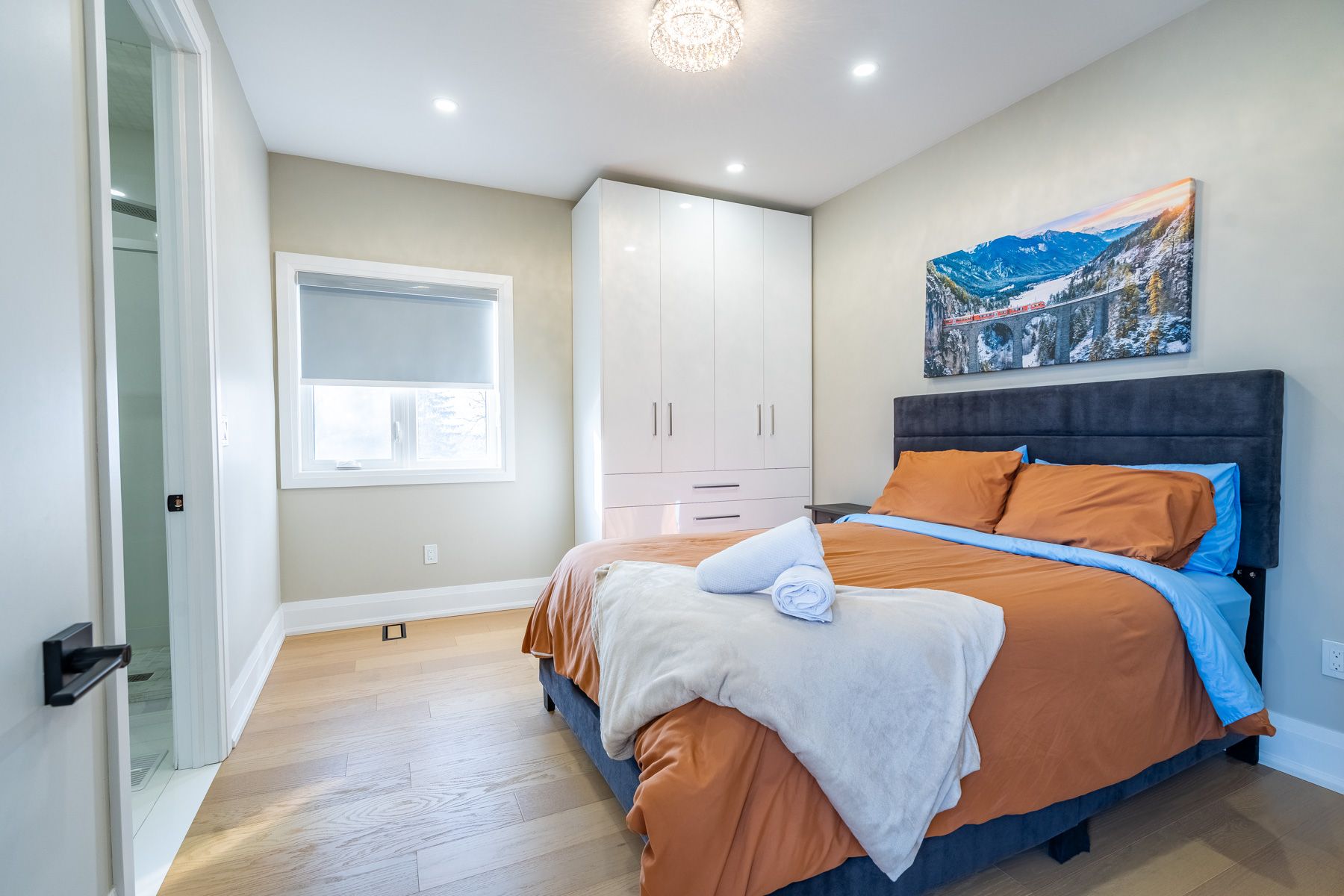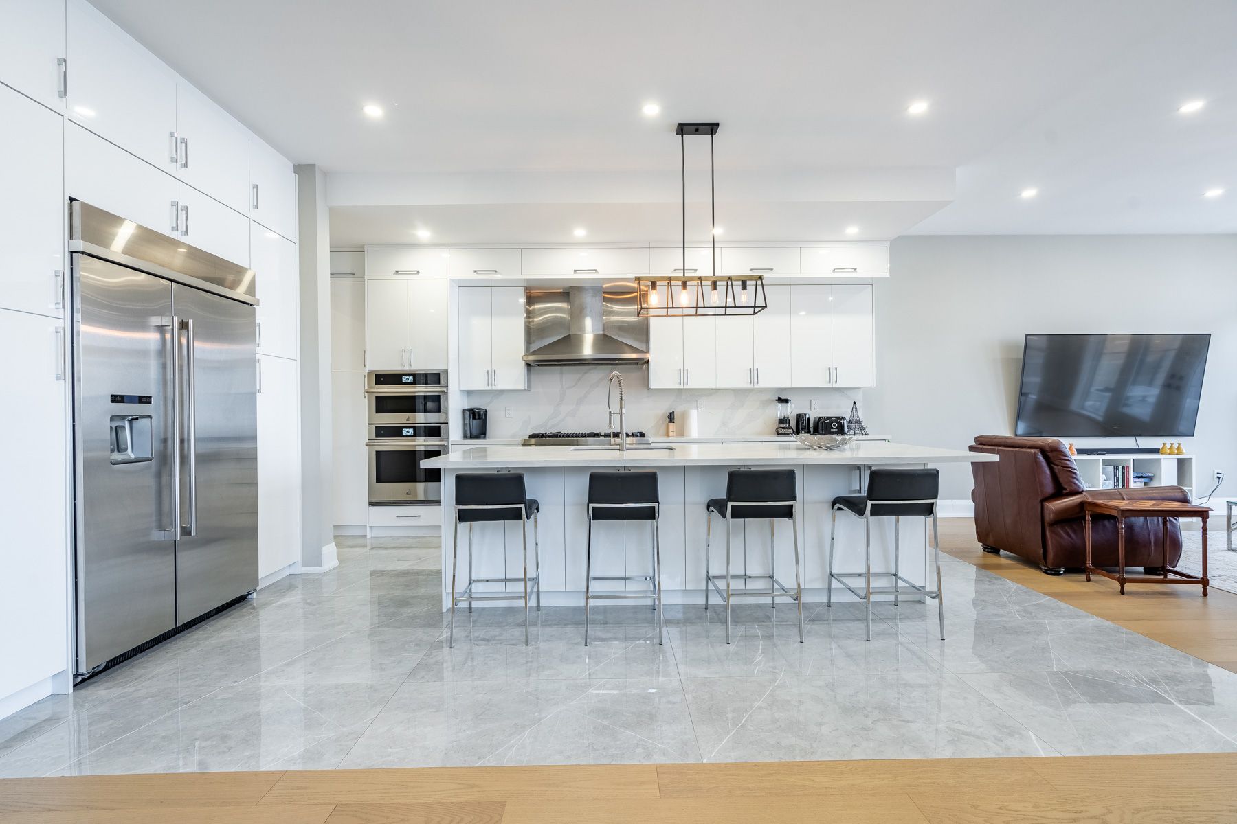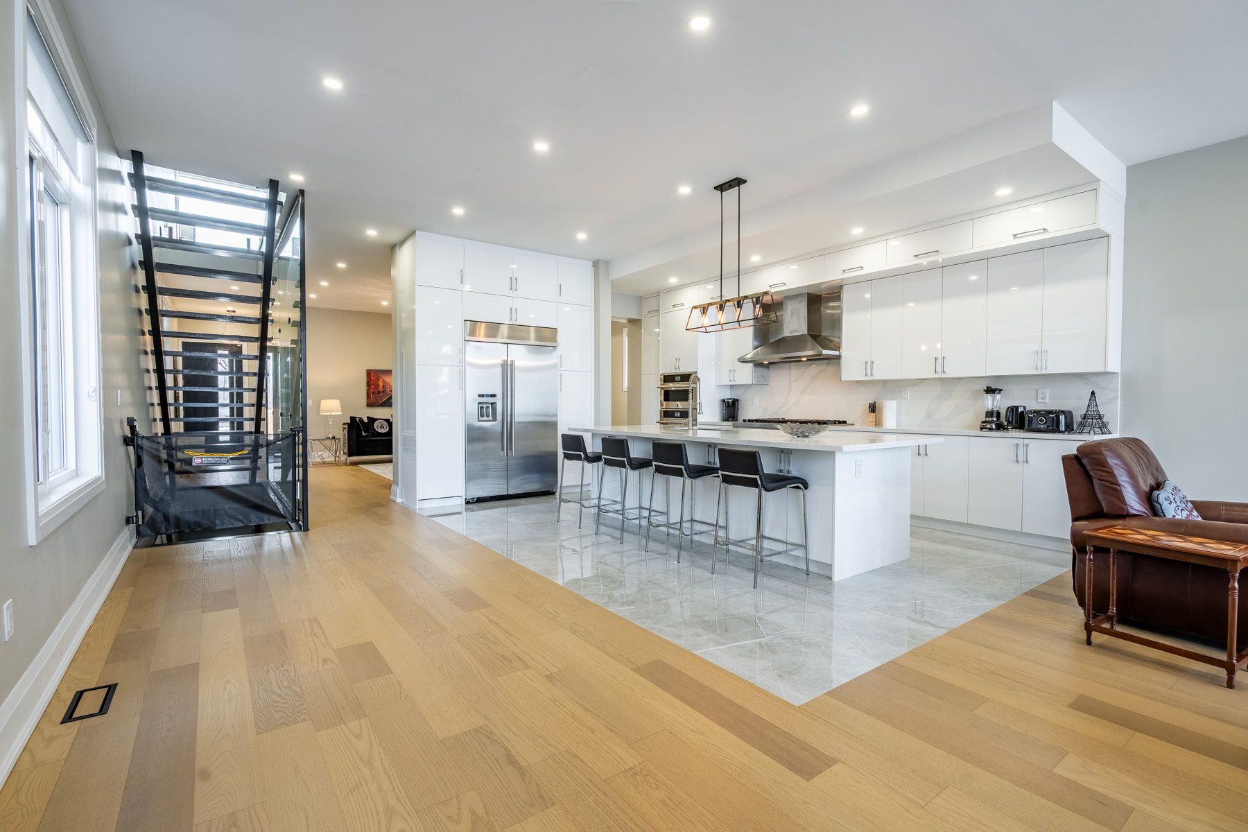• Chef's kitchen equipped with high-end JennAir appliances and quartz countertops.