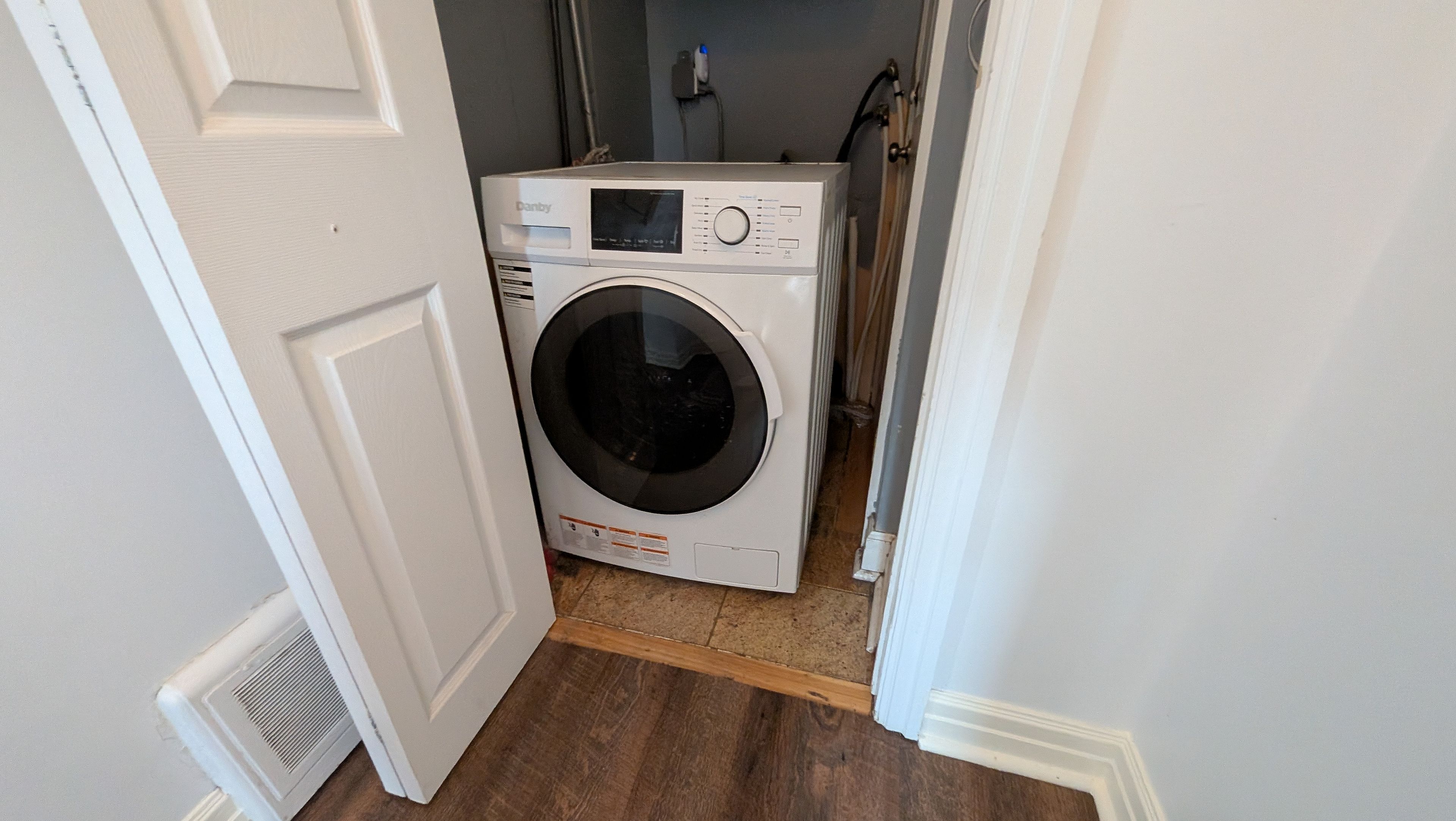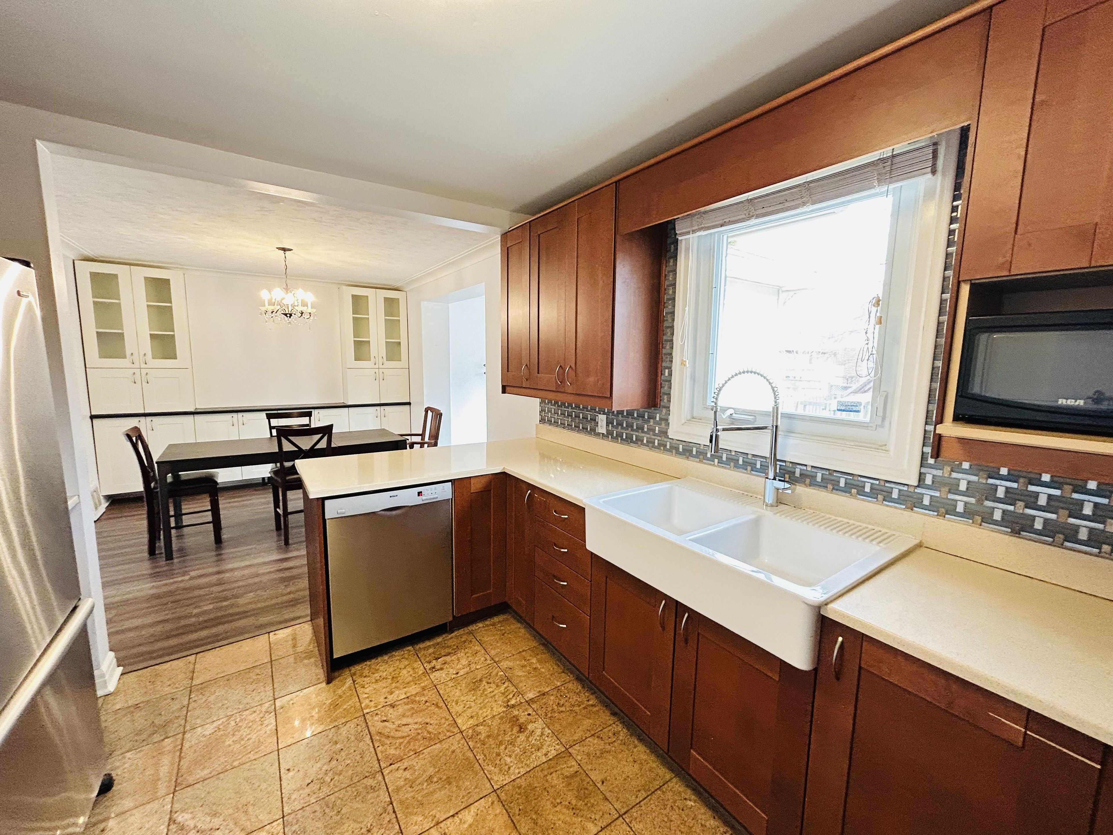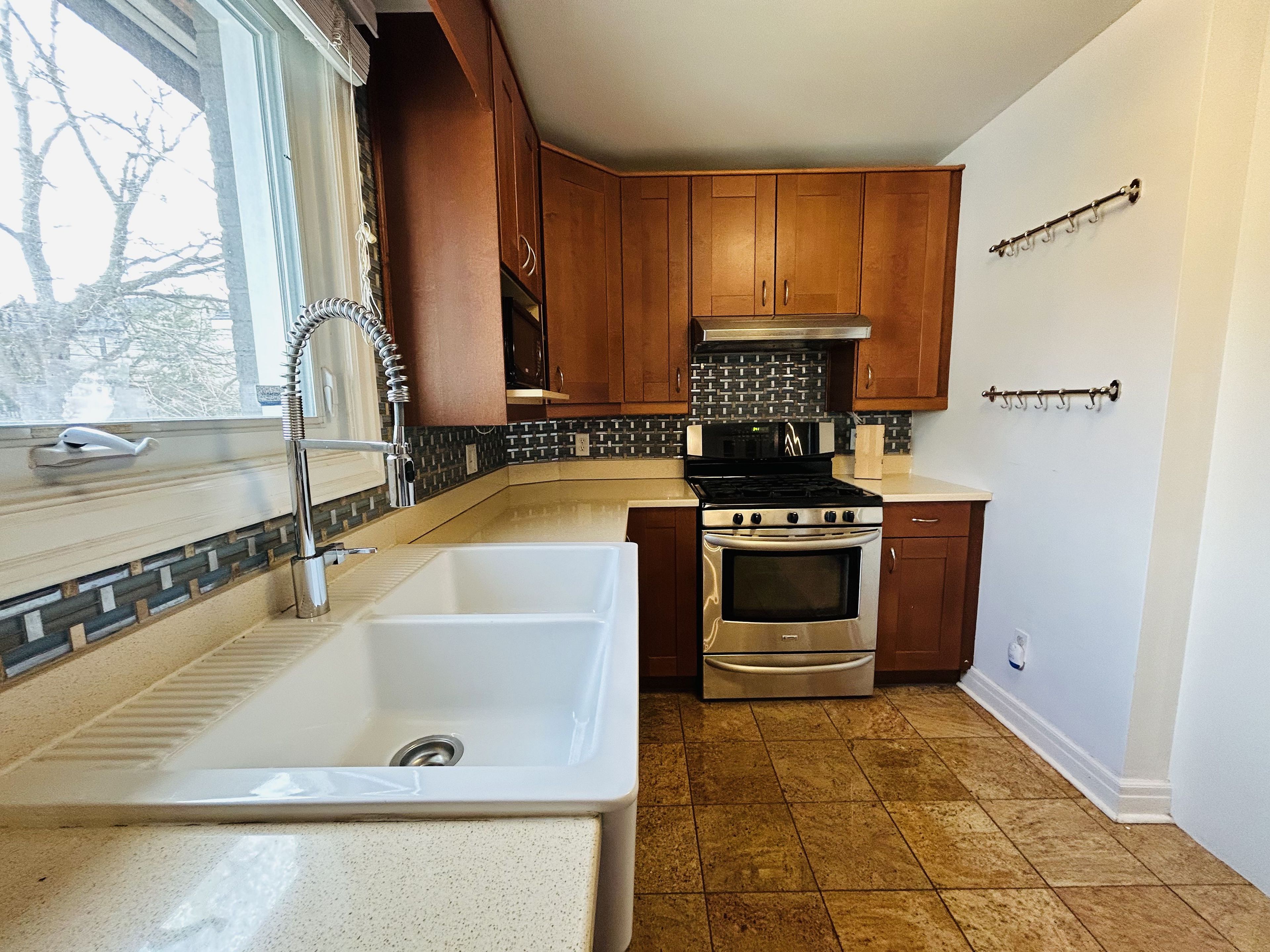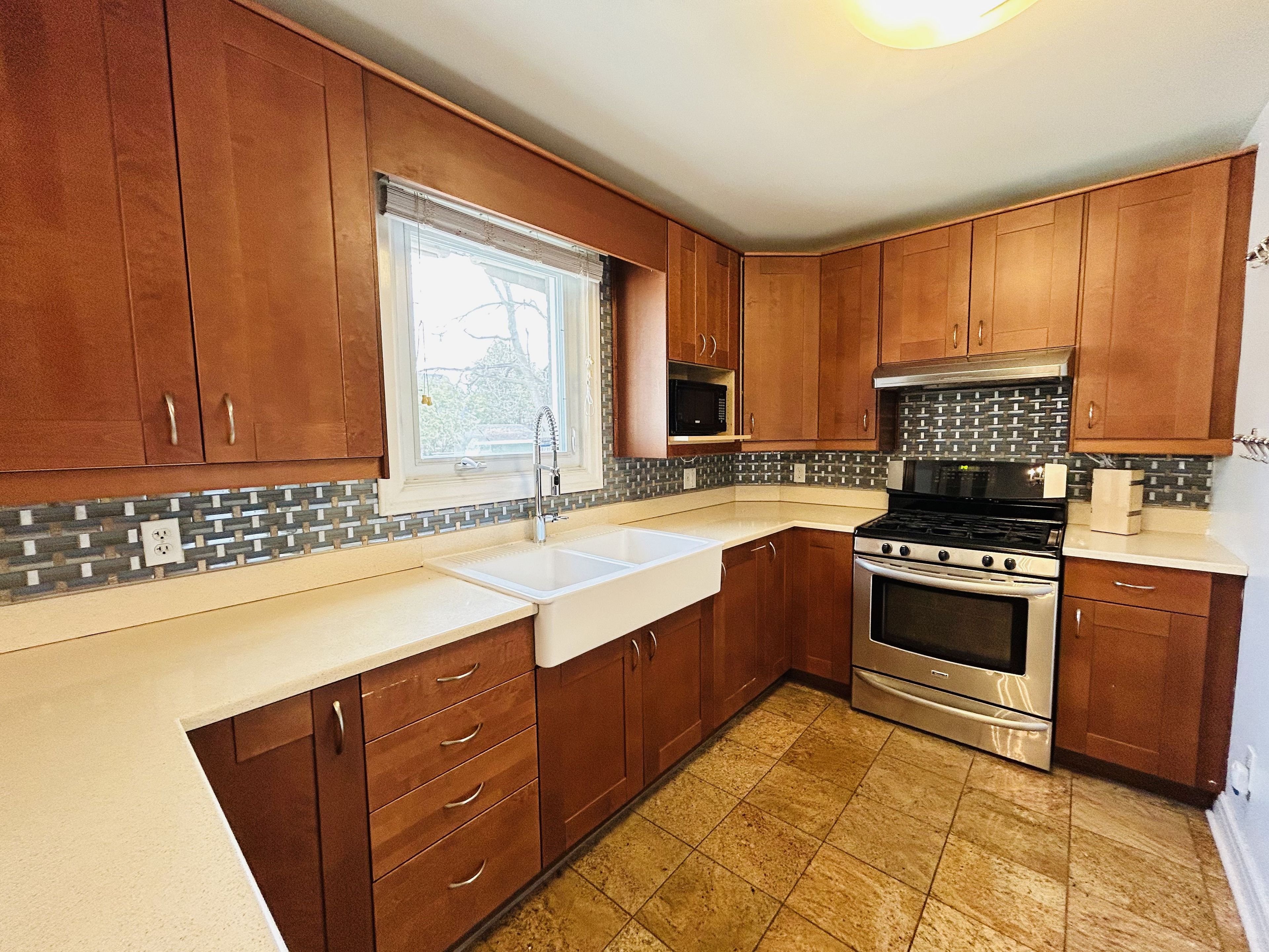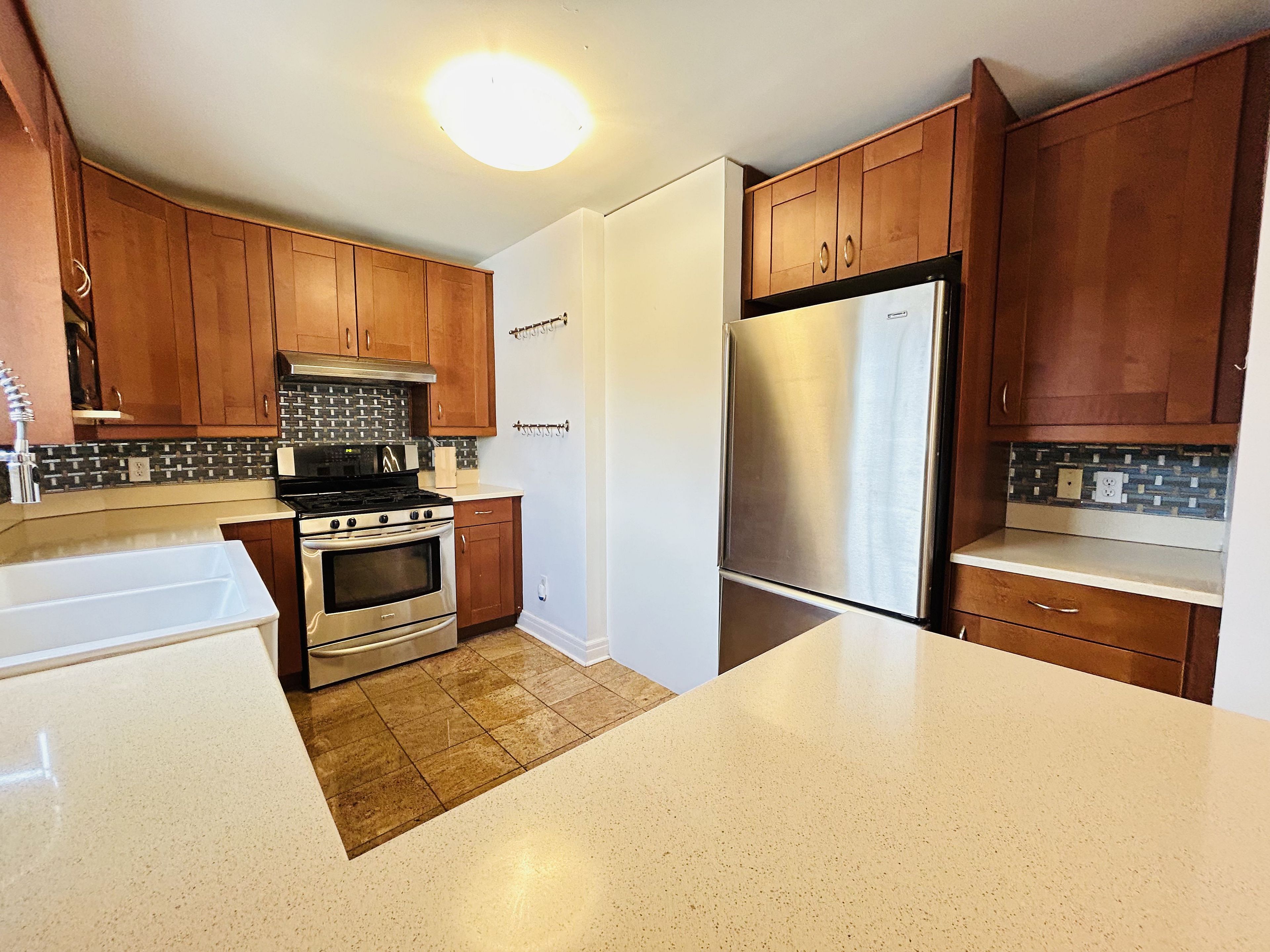 • Modern kitchen with quartz counters and stainless-steel appliances.